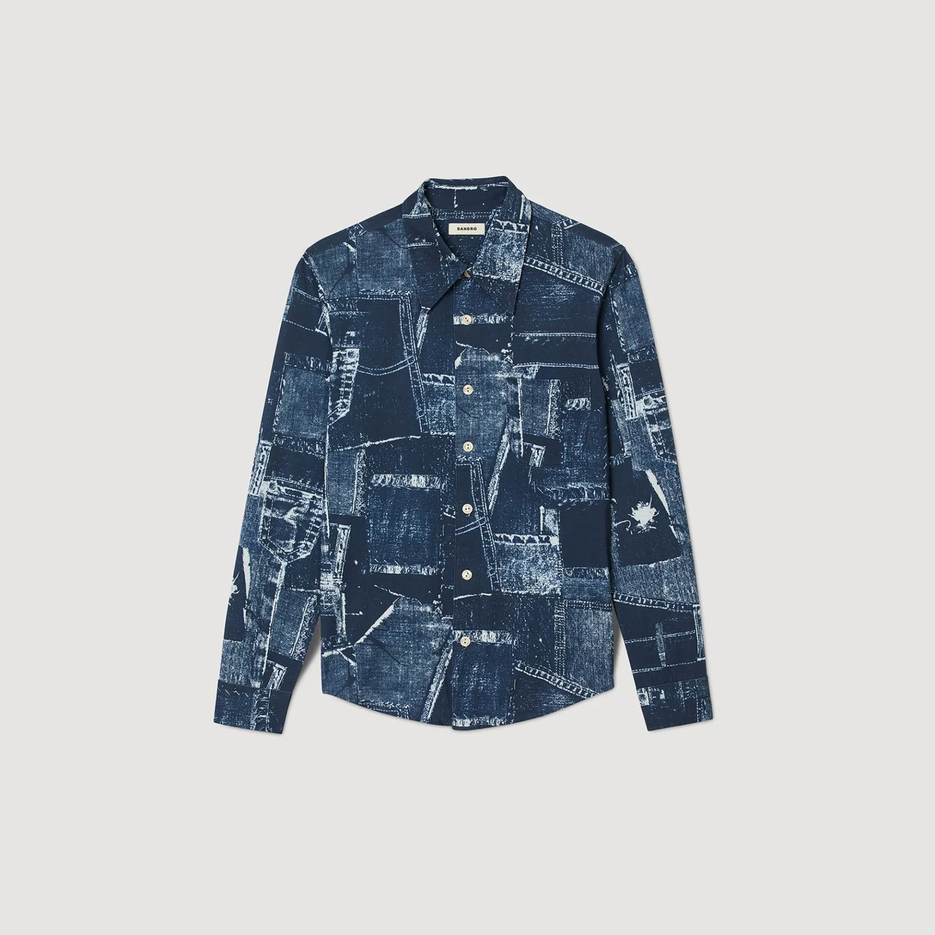 Camisa De Algodão Com Gola Clássica, Manga Comprida, Fecho De Botão E Detalhe De Estampa Patchwork.