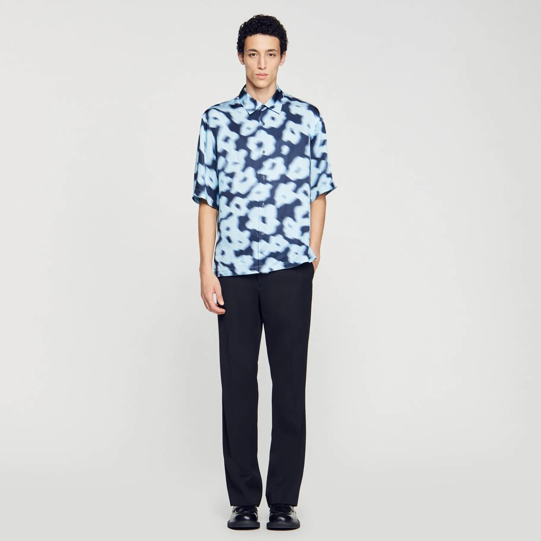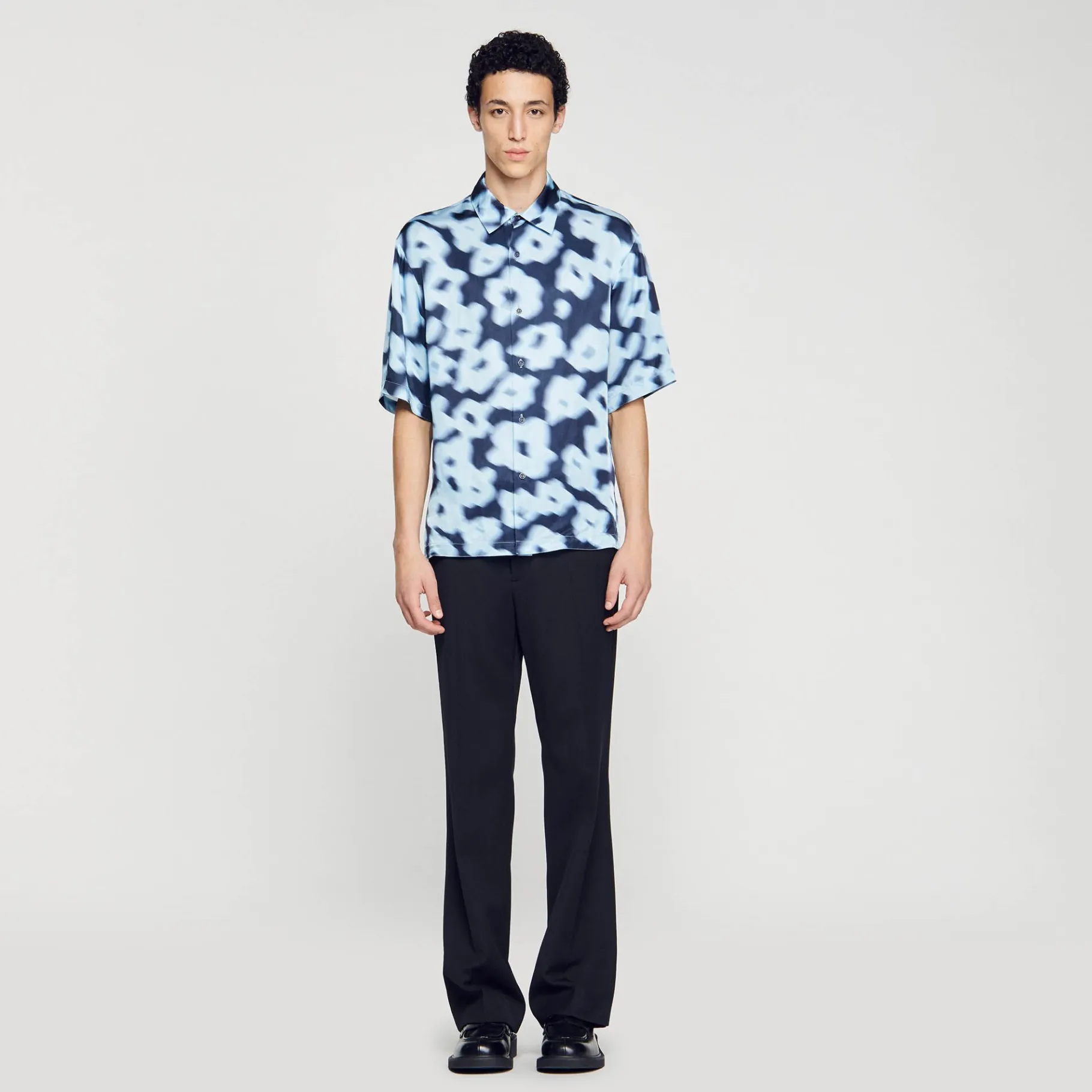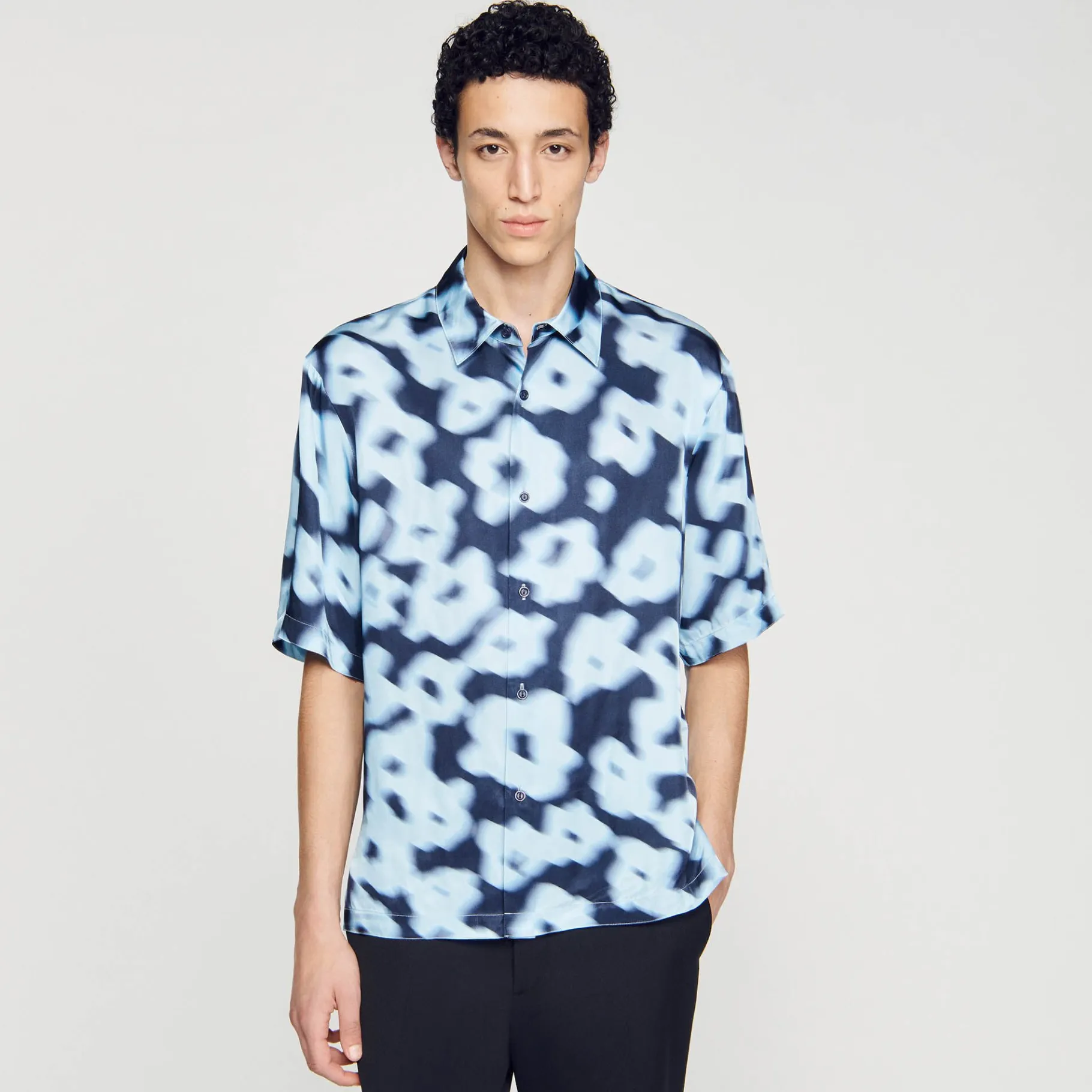 Camisa Oversized Com Estampa De Flores Desbotadas, Gola Com Pata, Fecho De Botão E Manga Curta.