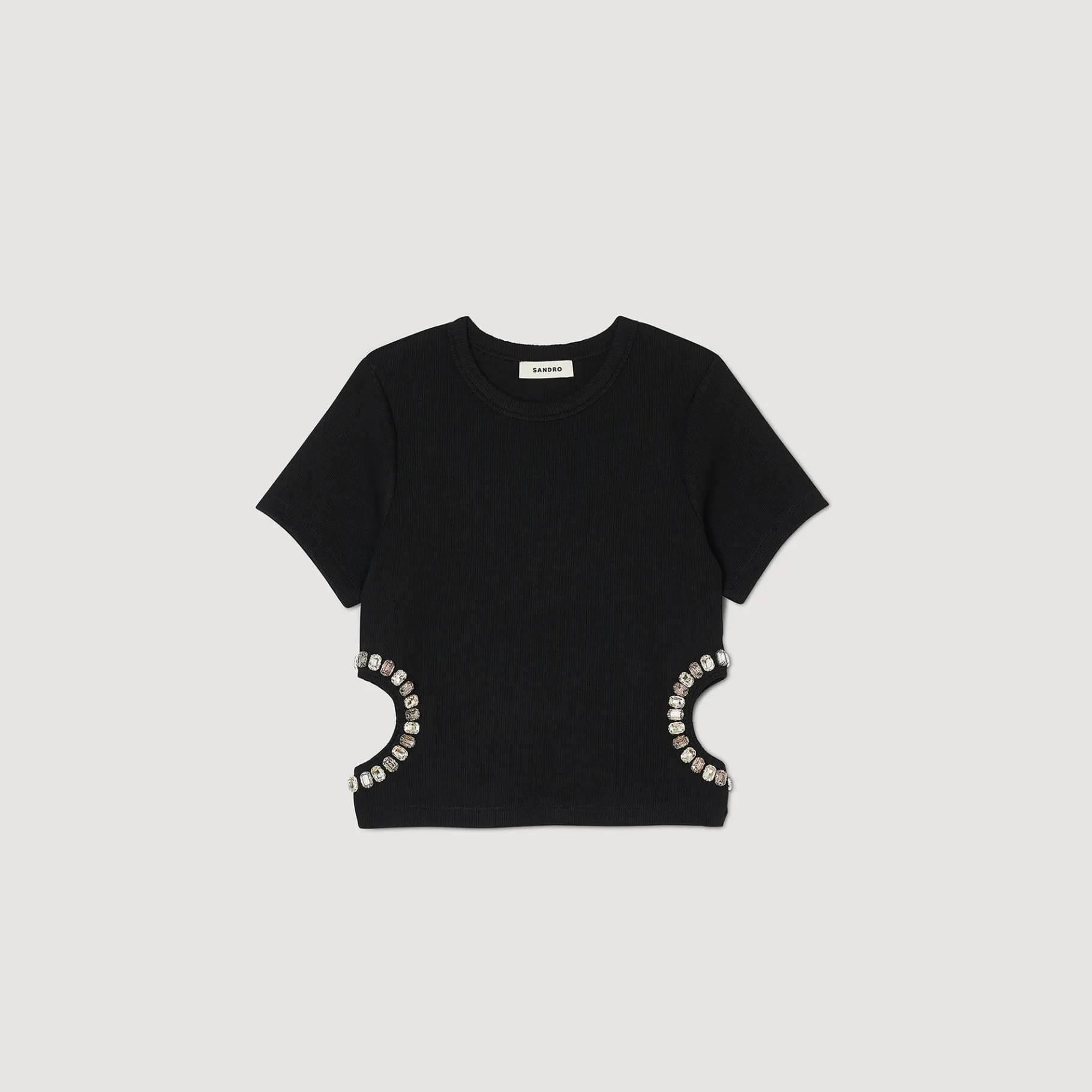 T-Shirt Em Jersey Canelado Com Decote Redondo E Mangas Curtas, Decorada Com Bordados Vazados Com Strass Nas Laterais.