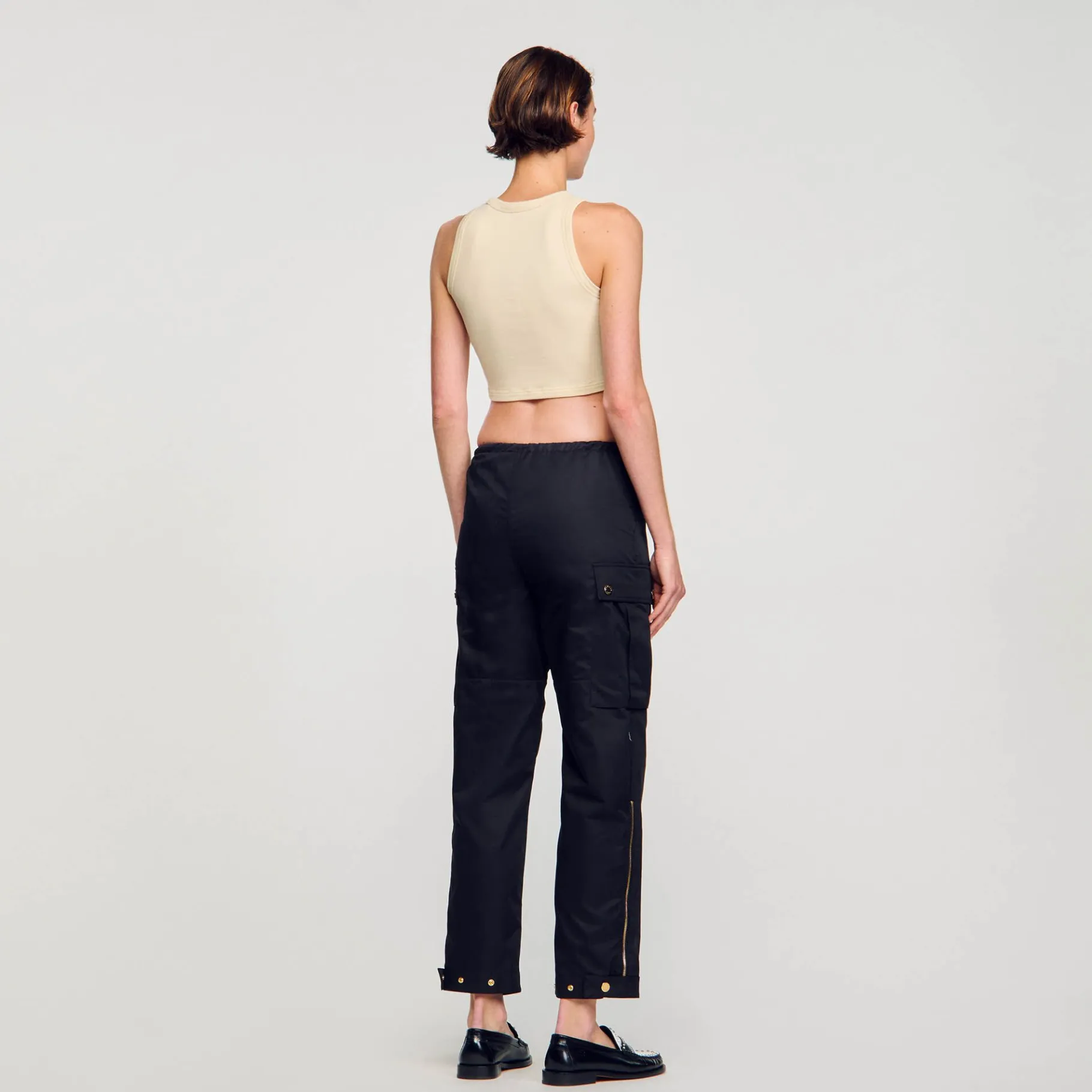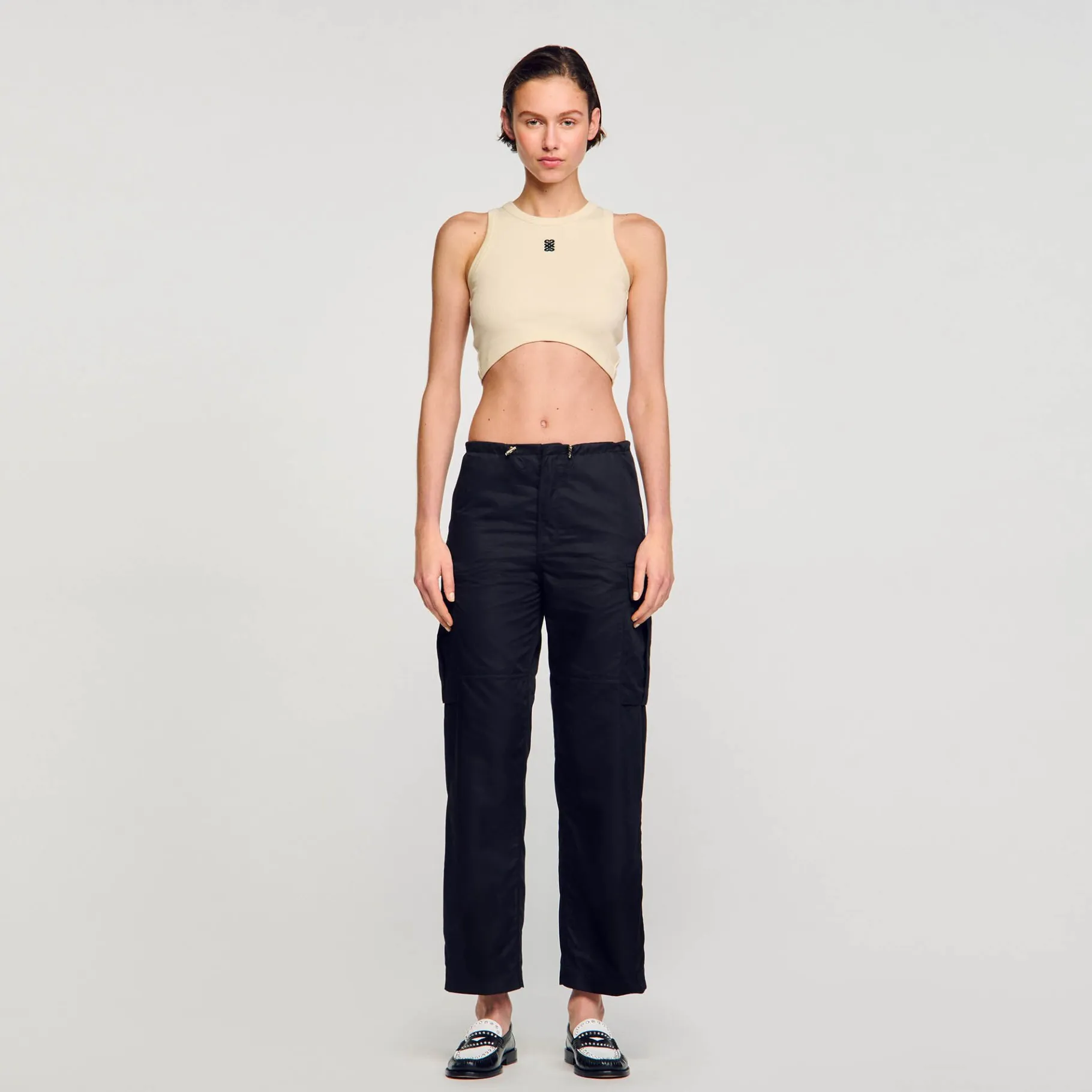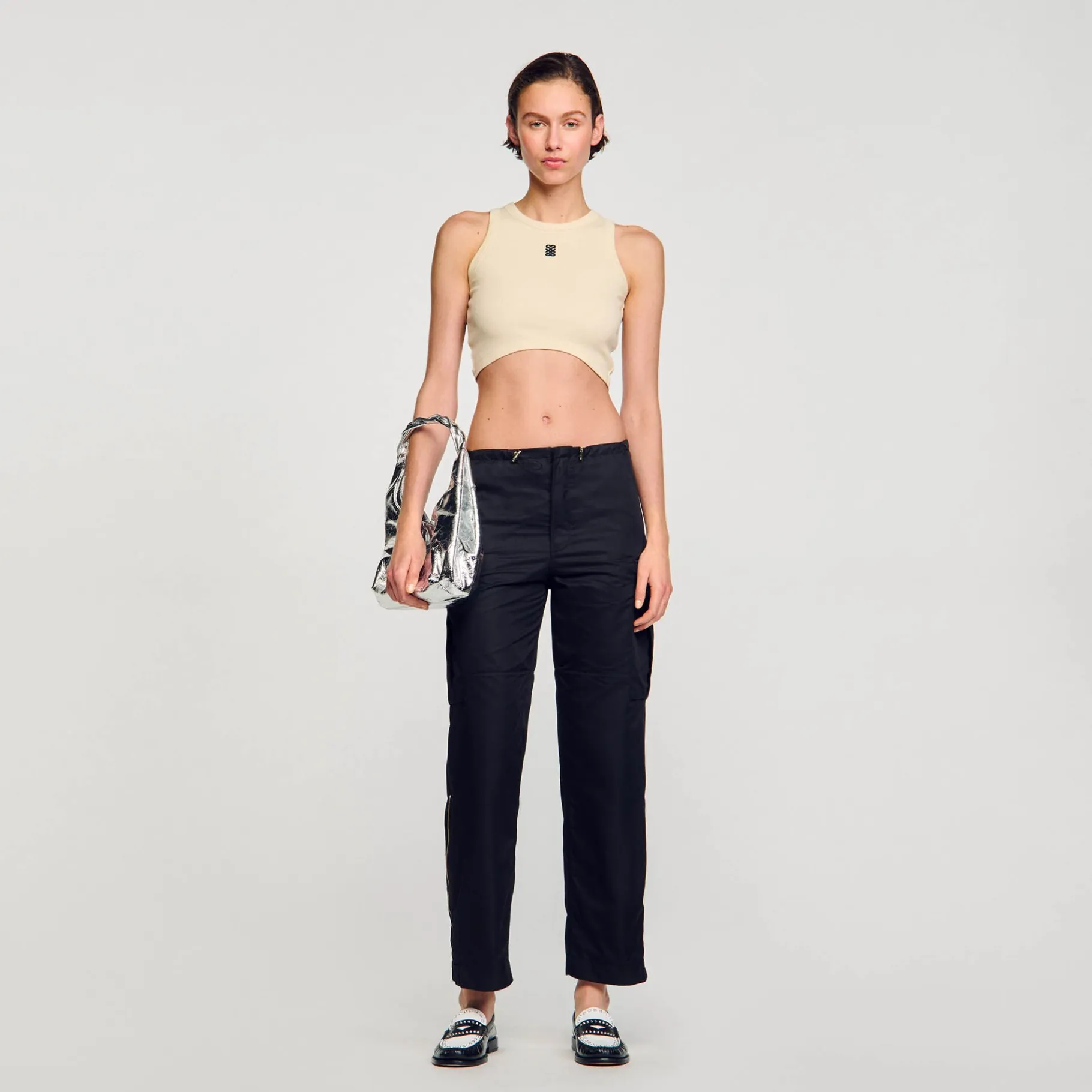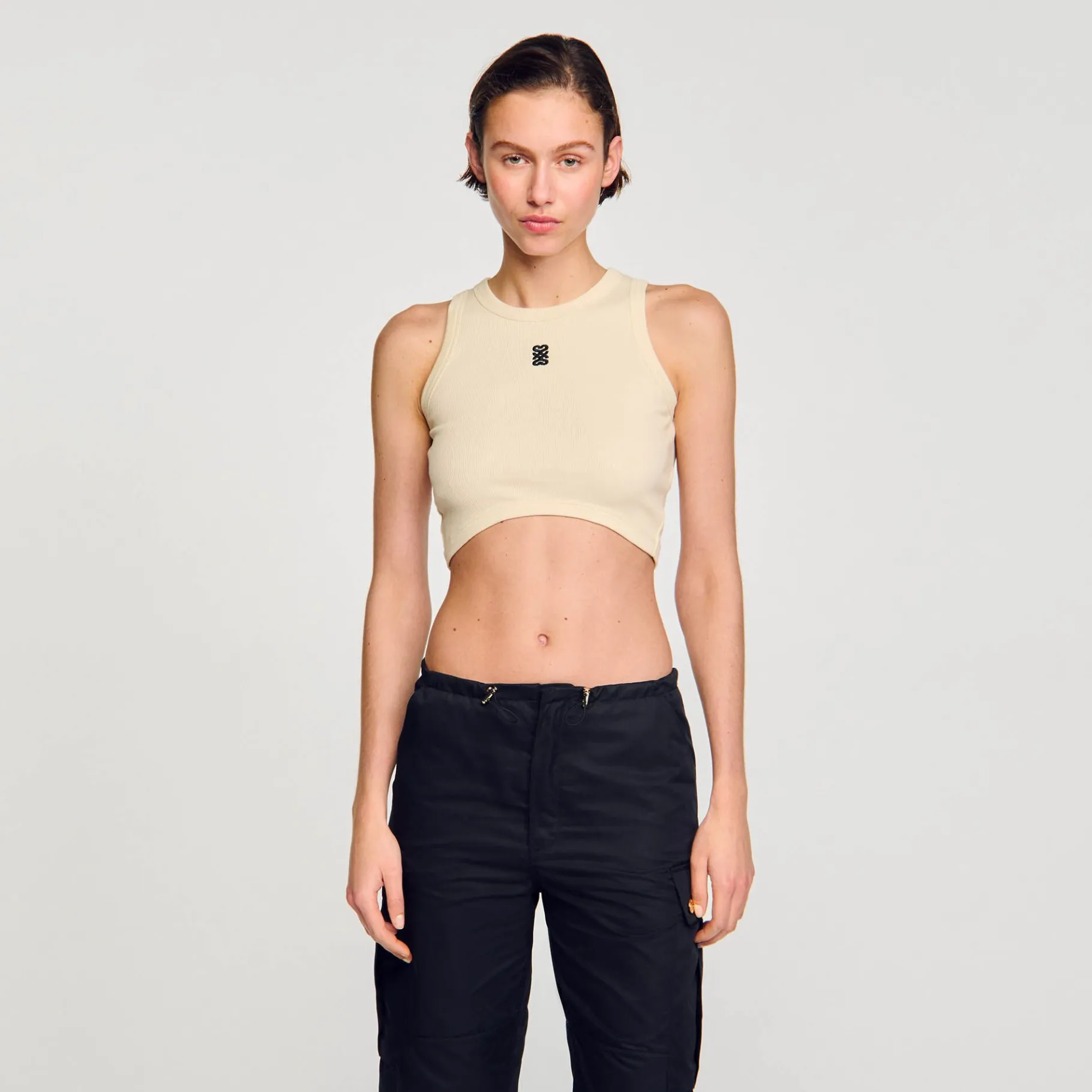 Regata Recortada Em Malha Canelada, Com Decote Redondo E Detalhe De Bordado Duplo S Contrastante.