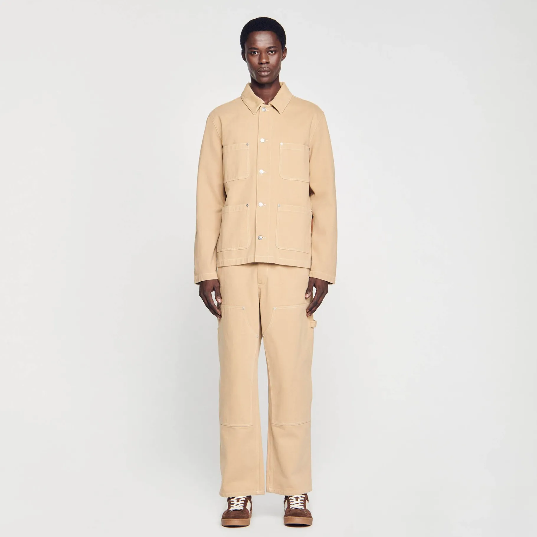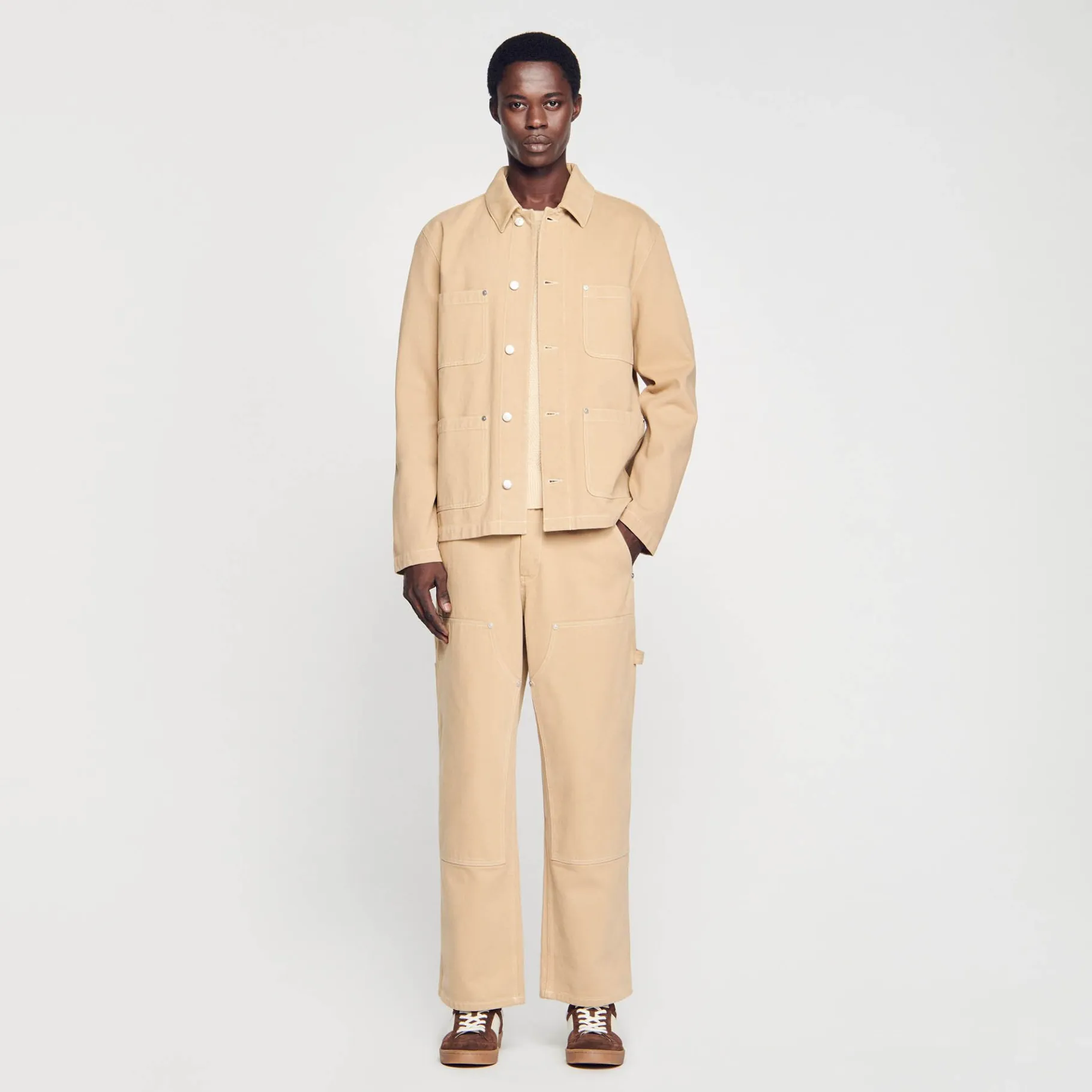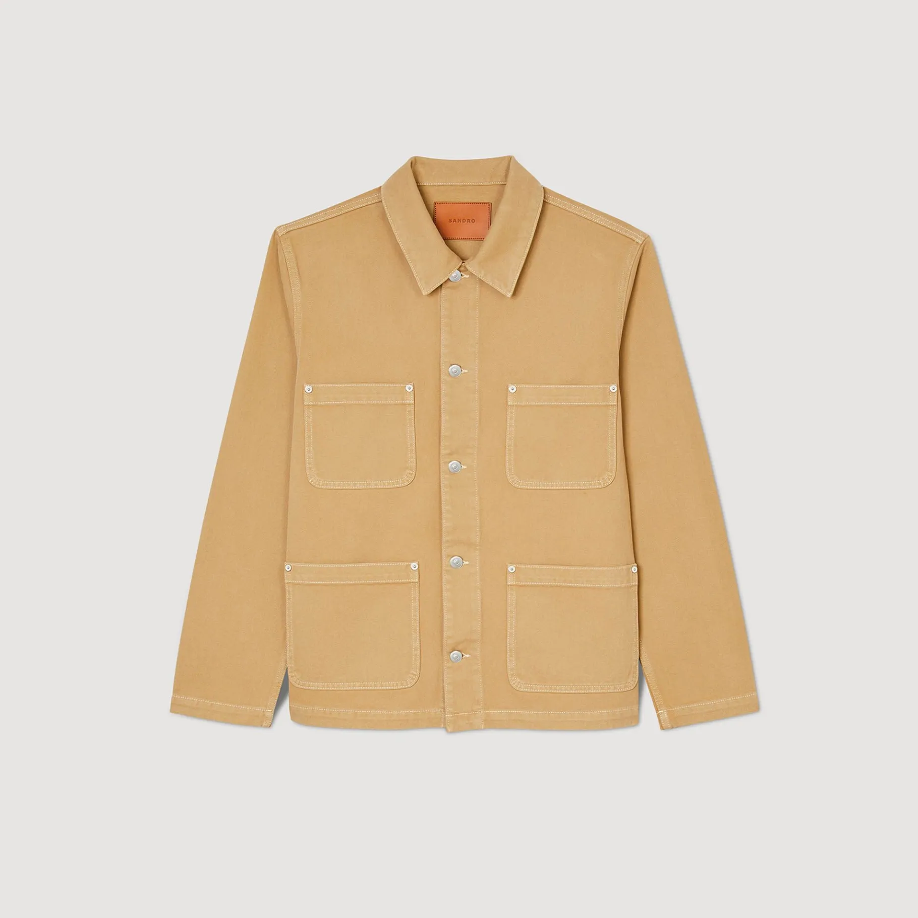 Jaqueta Jeans De Trabalho Com Fecho De Botão, Manga Comprida, Bolsos No Peito E Na Cintura, Decorada Com Costura Contrastante E Remendo De Couro.