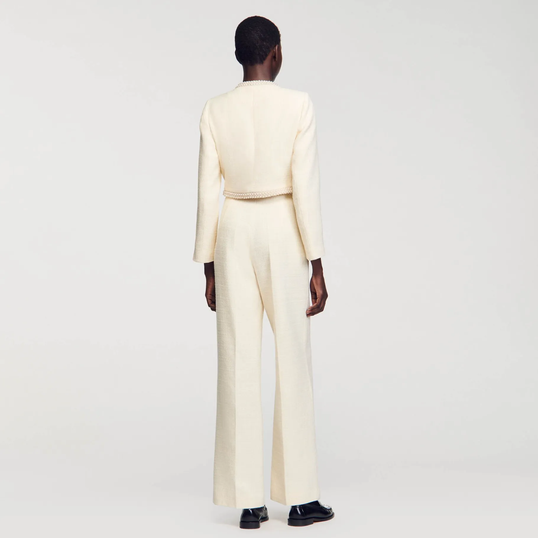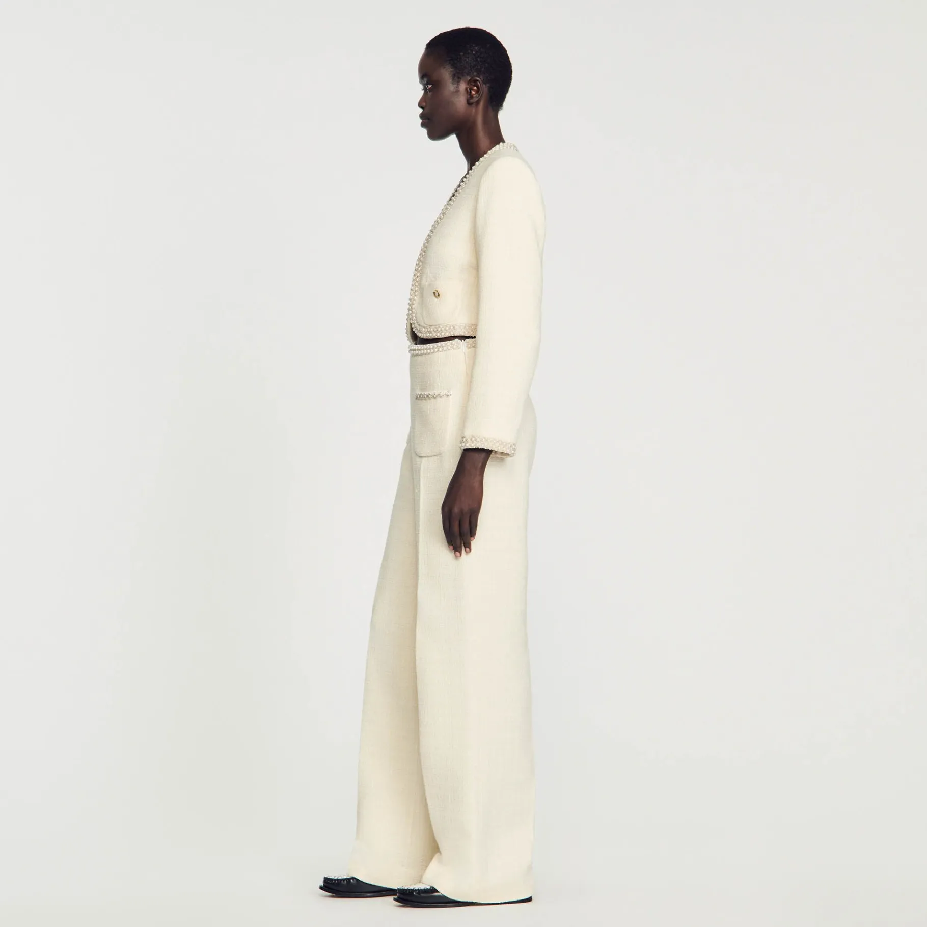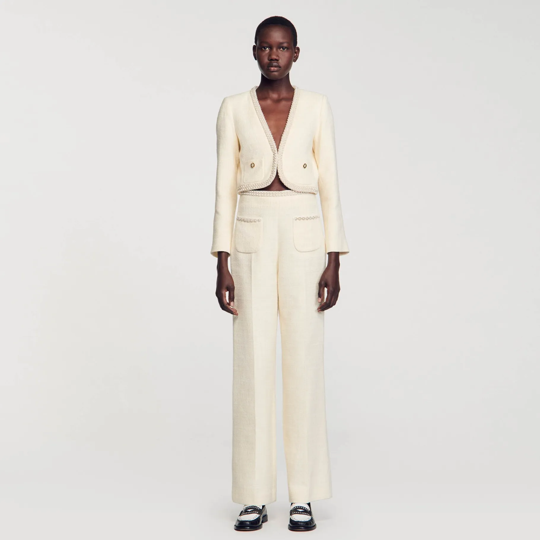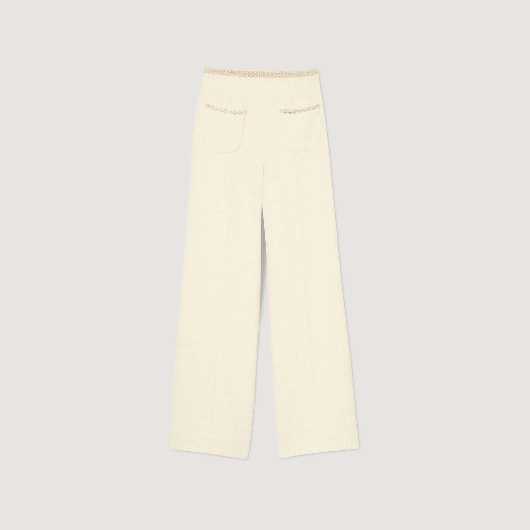 Calça De Sarja De Cintura Alta Decorada Com Trança De Pedraria E Bolsos Na Cintura.