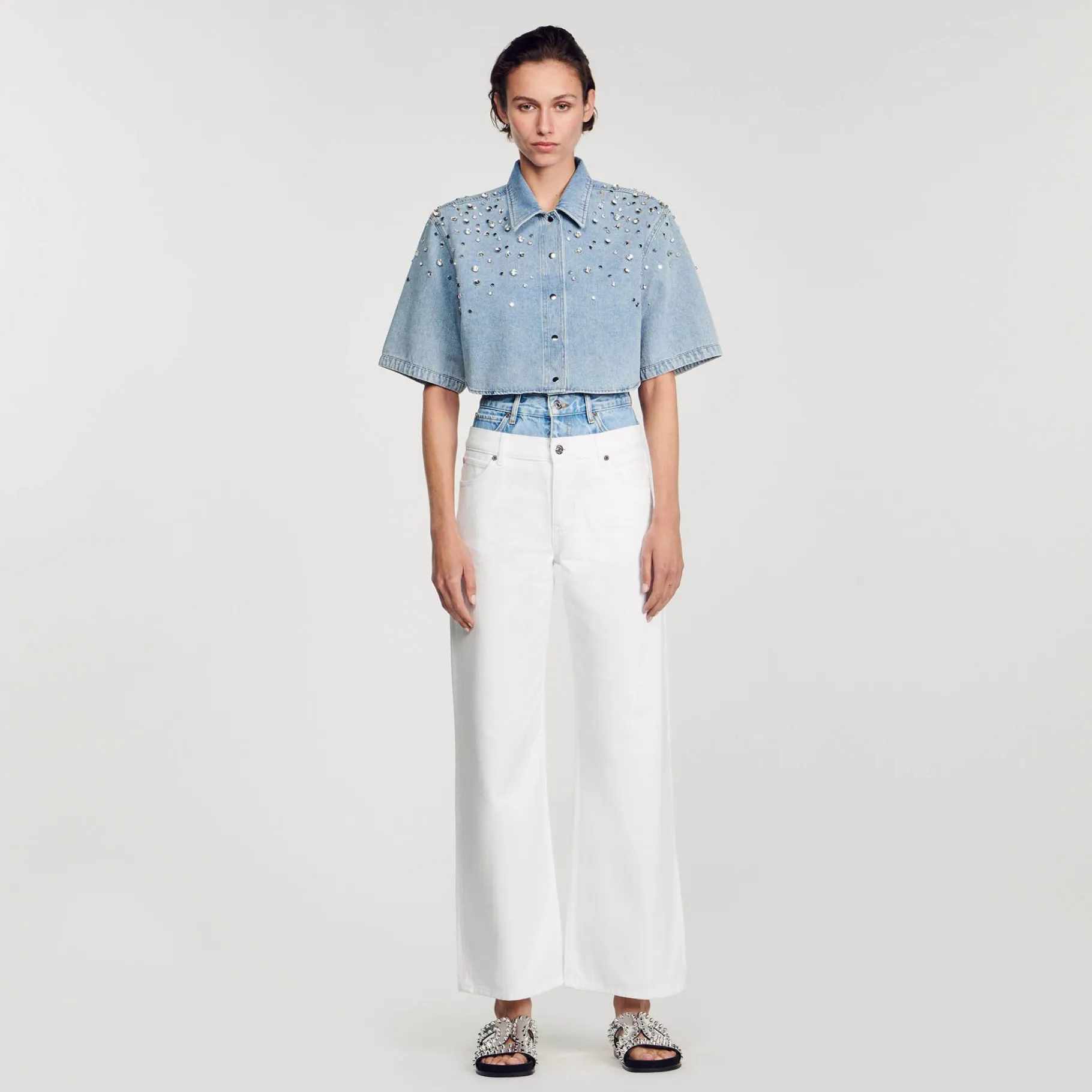 Camisa Jeans Curta Com Mangas Curtas, Gola, Fecho De Botão E Detalhe De Tachas Prateadas E Strass.