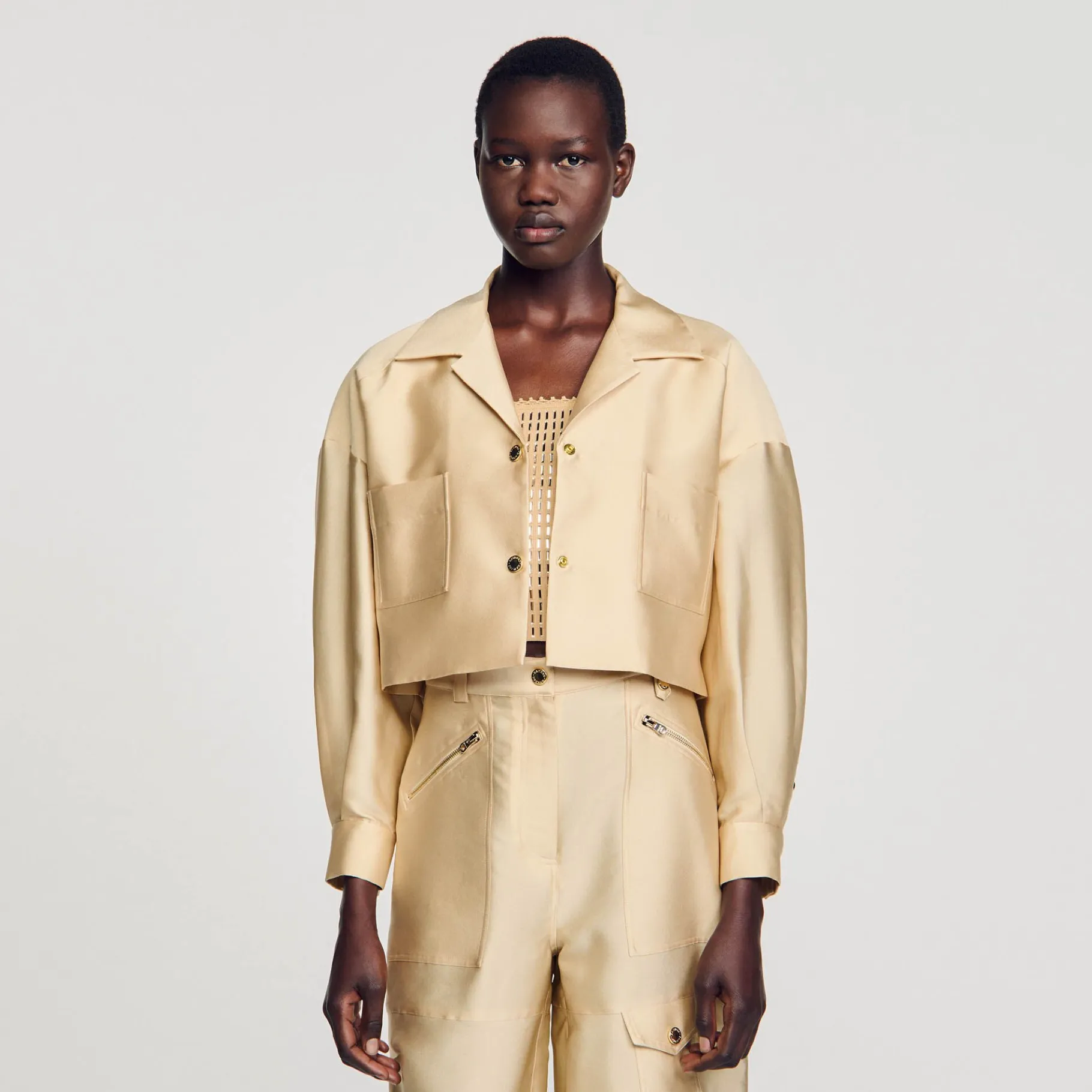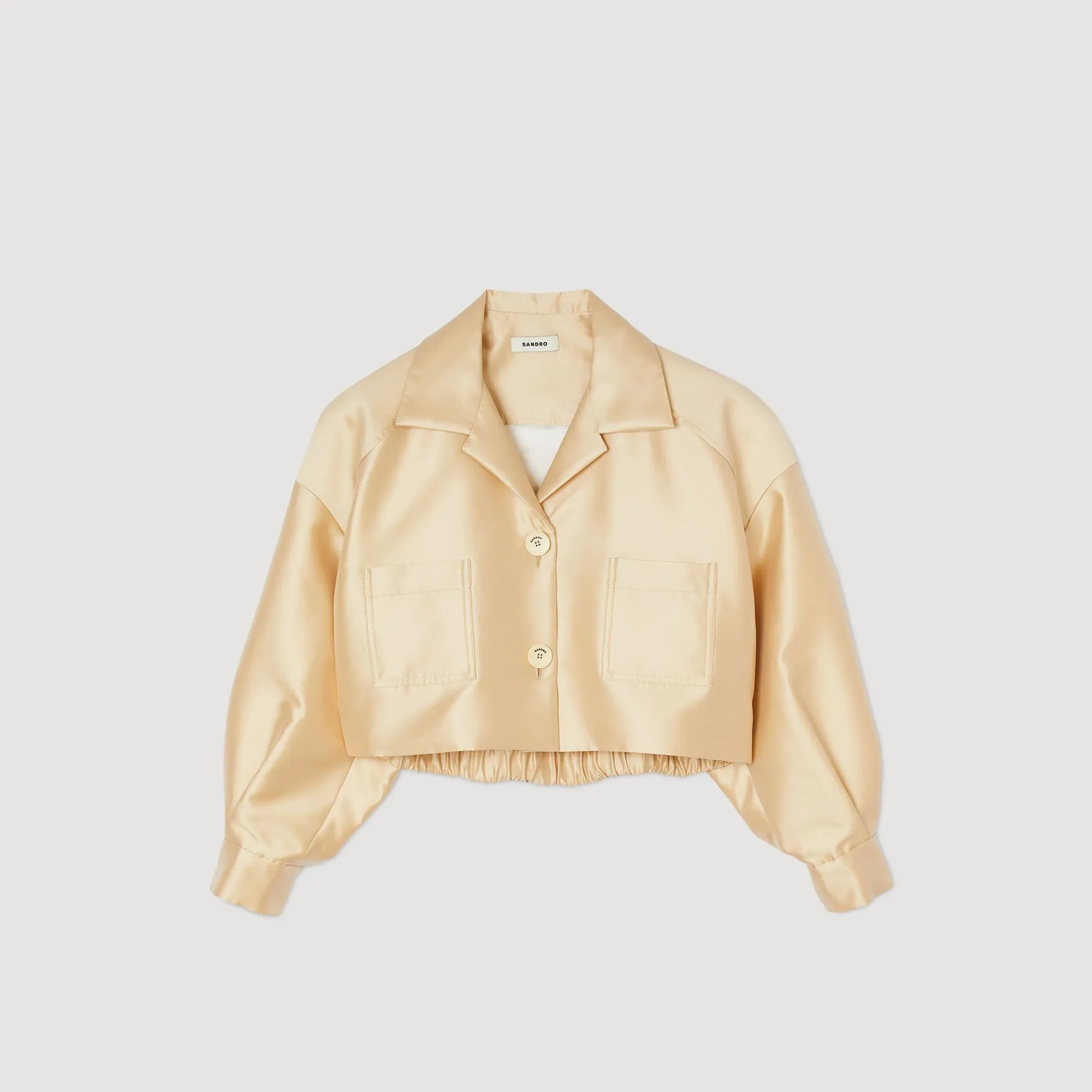 Camisa Curta E Larga Em Cetim Com Mangas Compridas Volumosas, Gola De Lapela, Botões De Pressão Com Iniciais Sandro, Bolsos De Aplicação No Peito E Elástico Nas Costas.