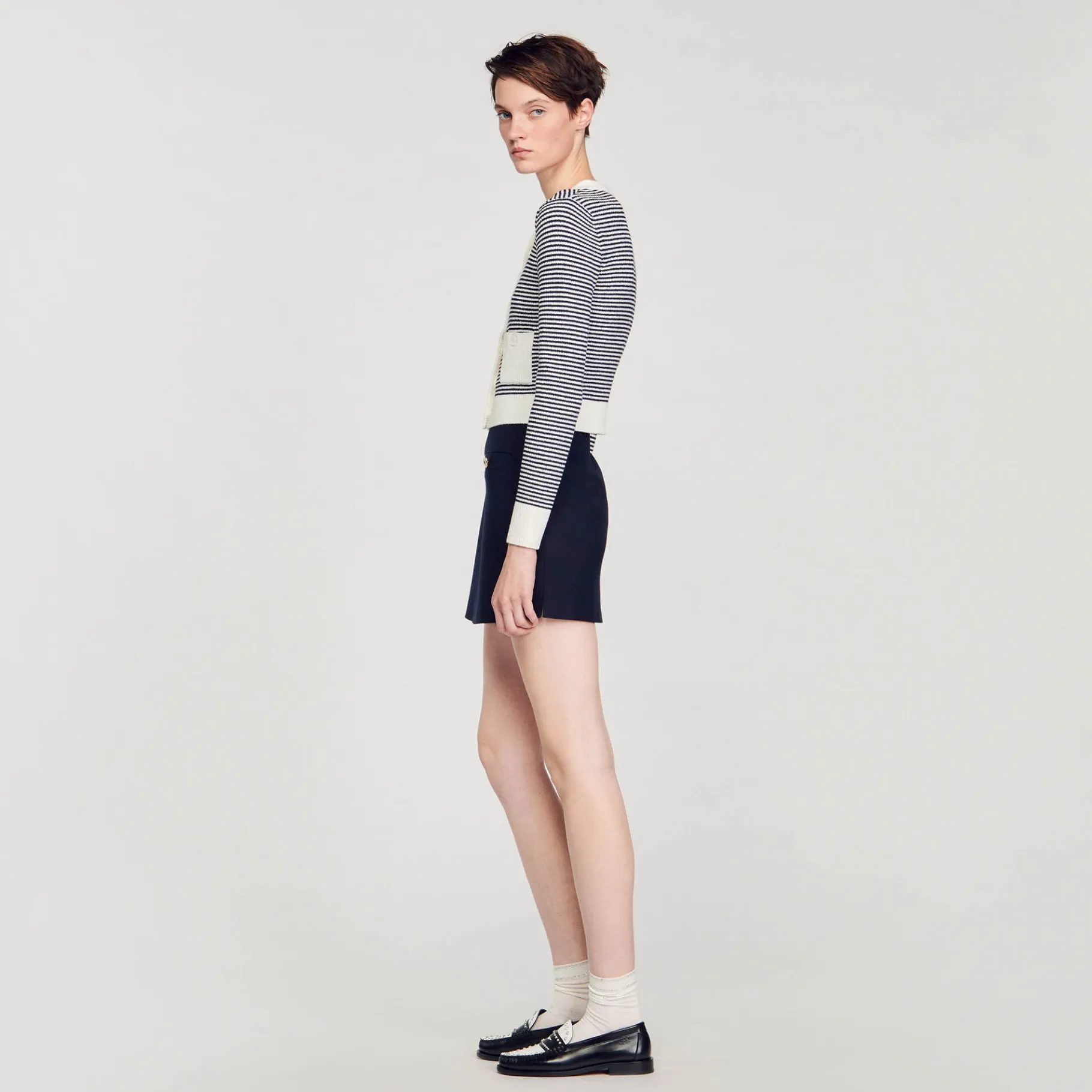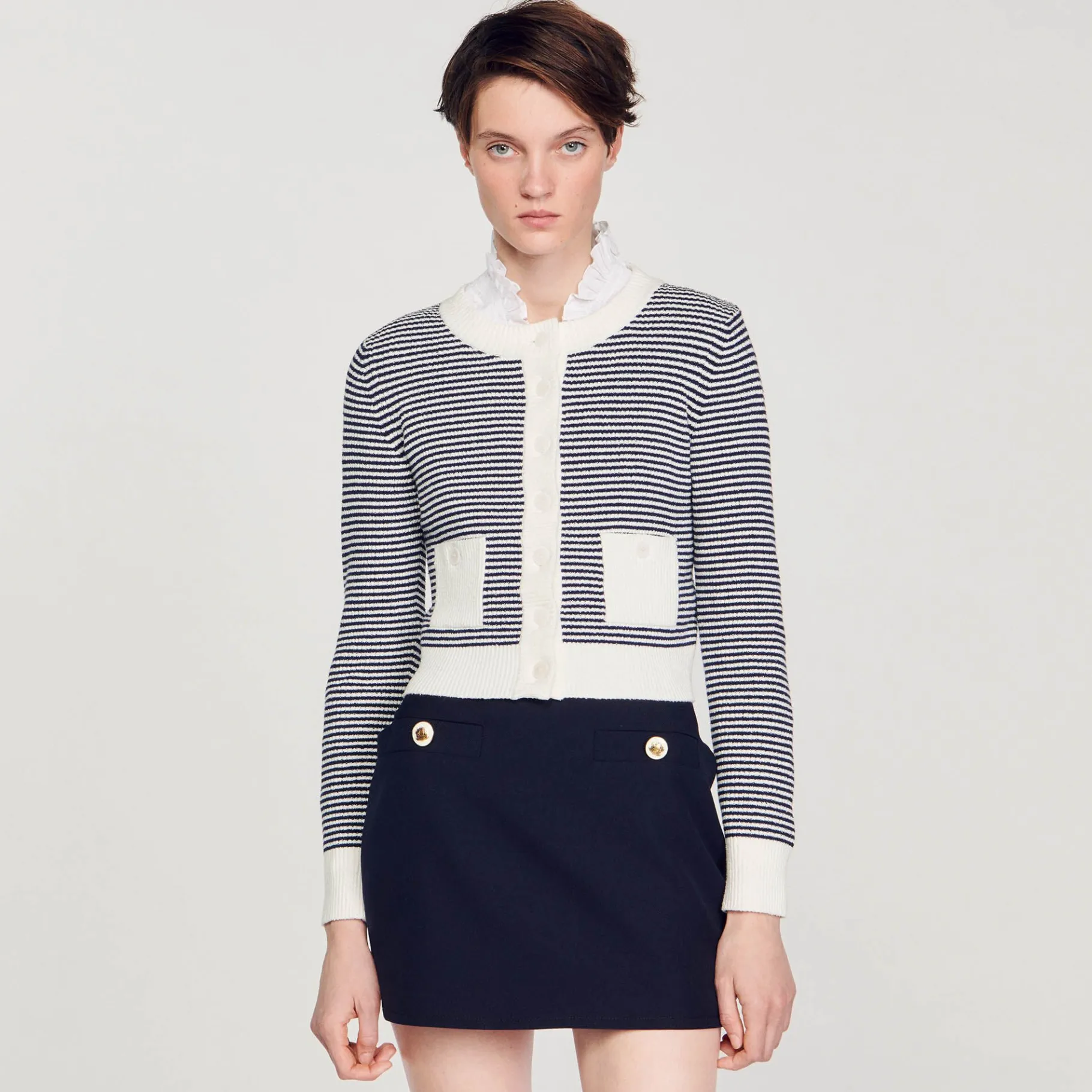 Cardigan Listrado Em Malha Atoalhada, Manga Comprida, Fecho De Botão, Bolsos De Aplicação Na Cintura E Bordas Caneladas Em Contraste.
