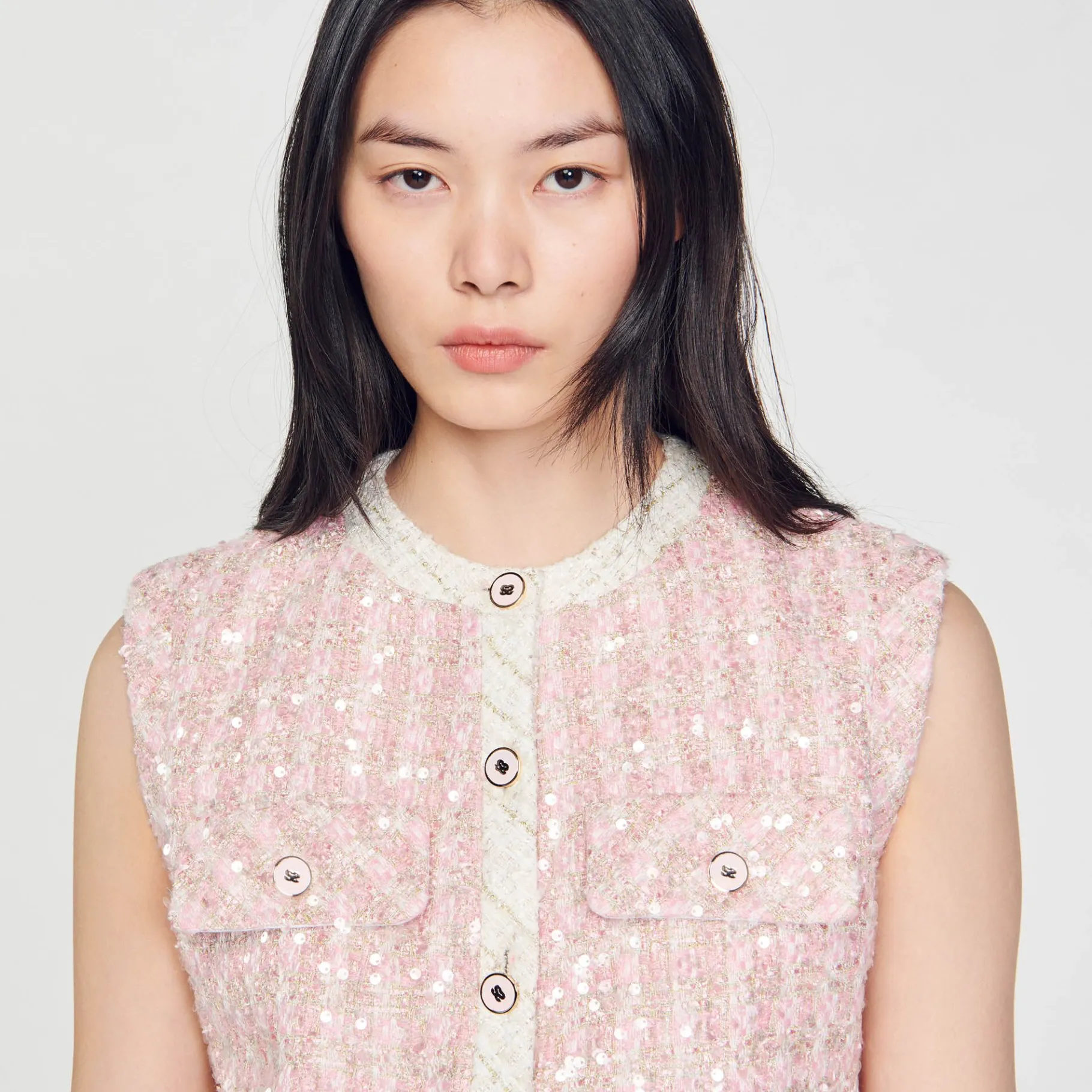 Colete De Sarja Bordado Com Lantejoulas, Gola Arredondada, Carcela De Botões Em Contraste E Bolsos No Peito Com Aba.
