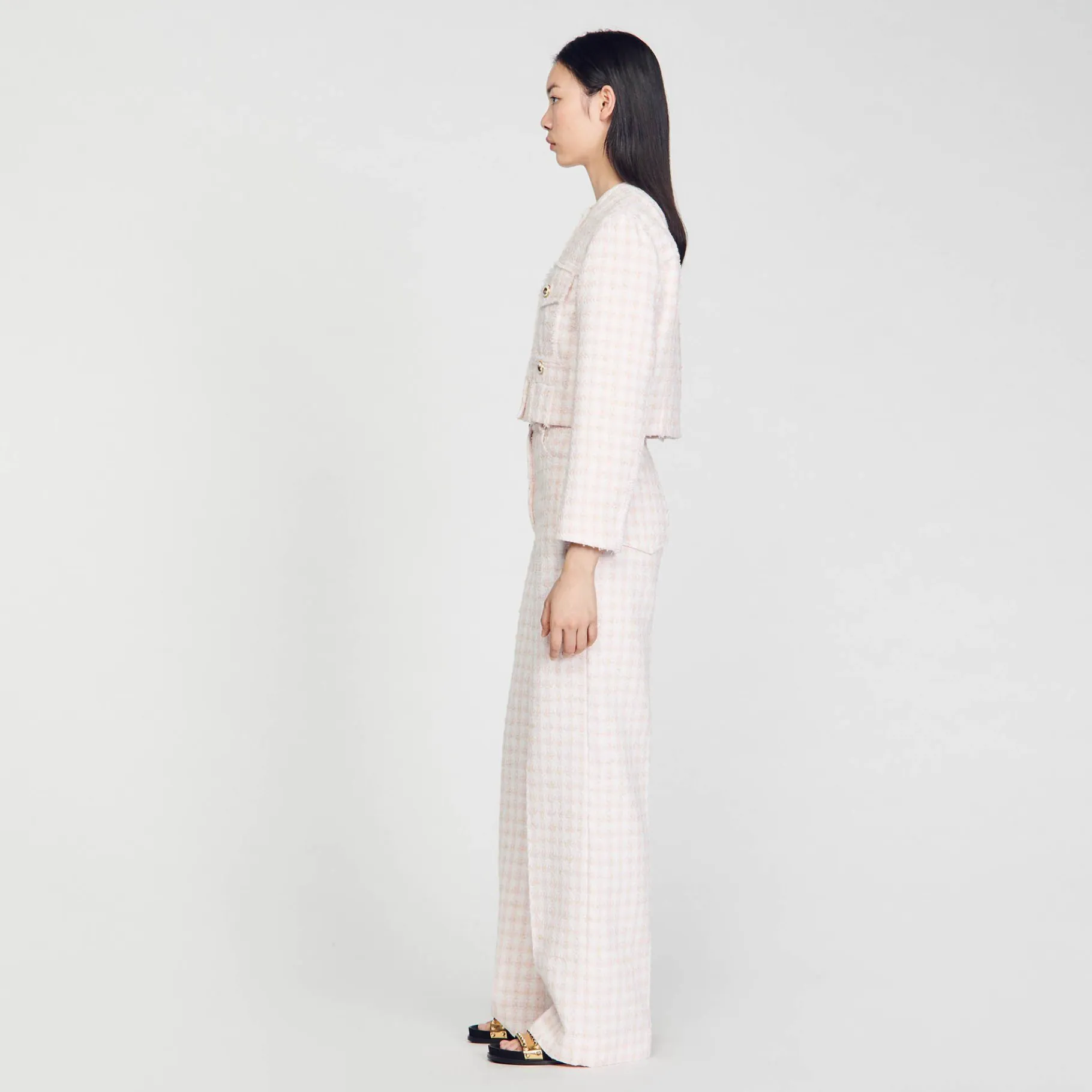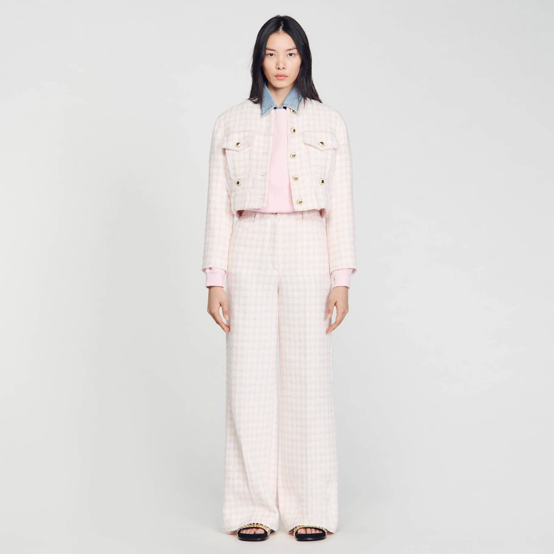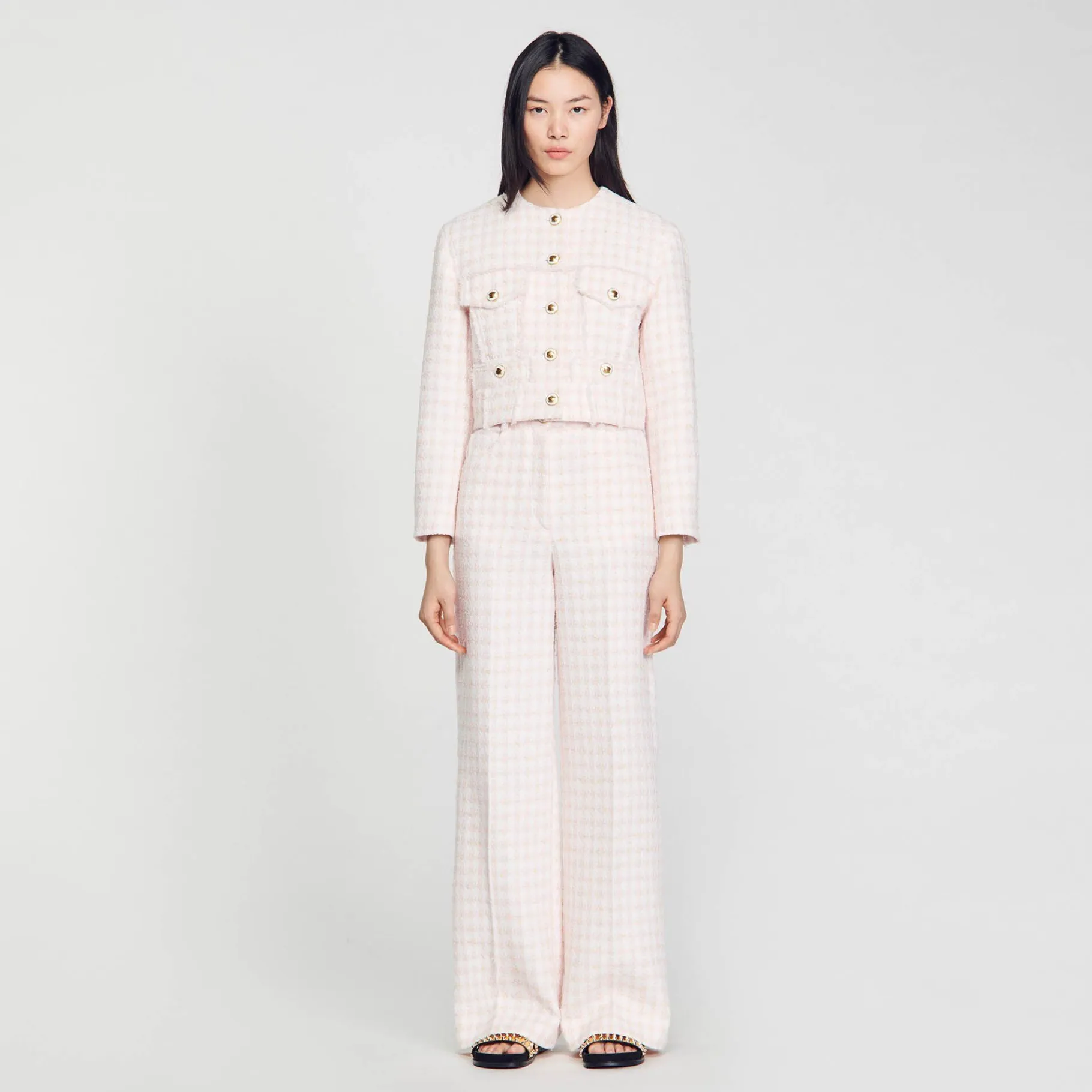 Jaqueta Curta De Sarja Elegante Com Mangas Compridas, Fecho De Botão Elegante E Detalhes Em Chevron Com Franjas.
