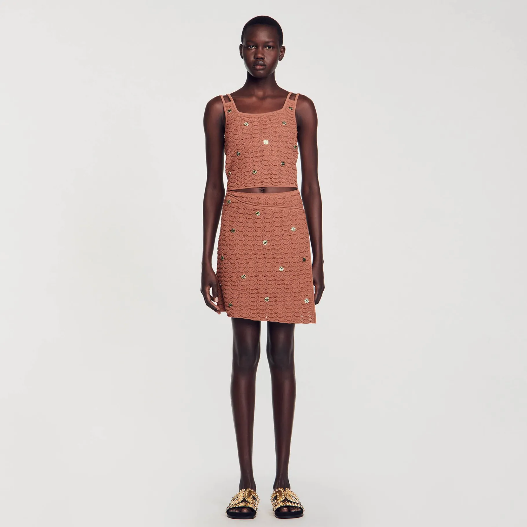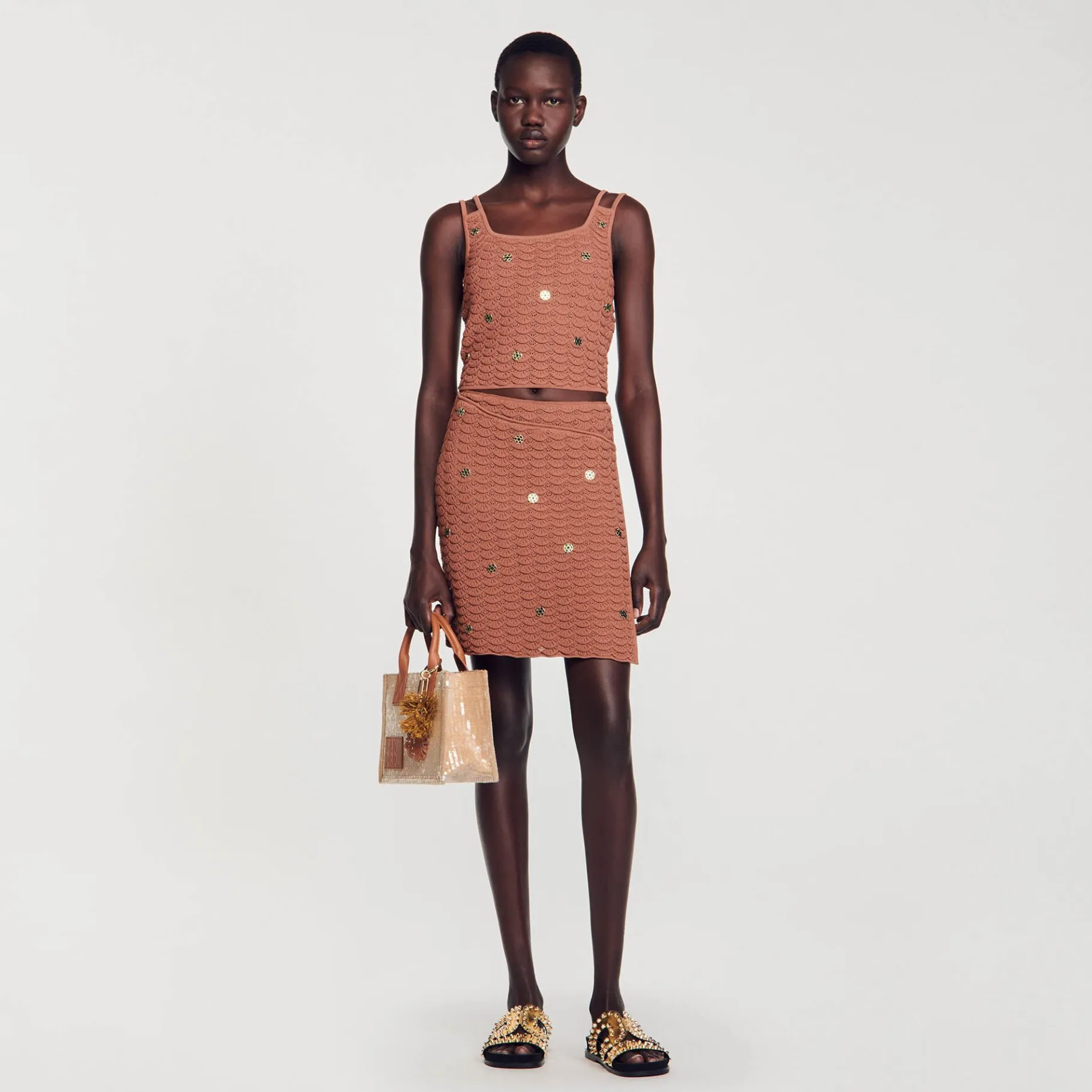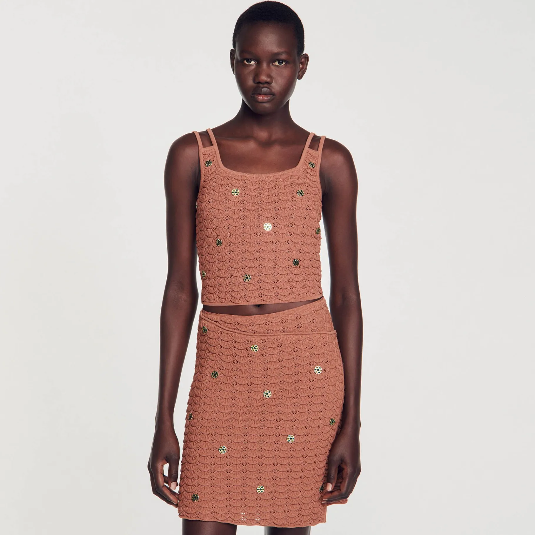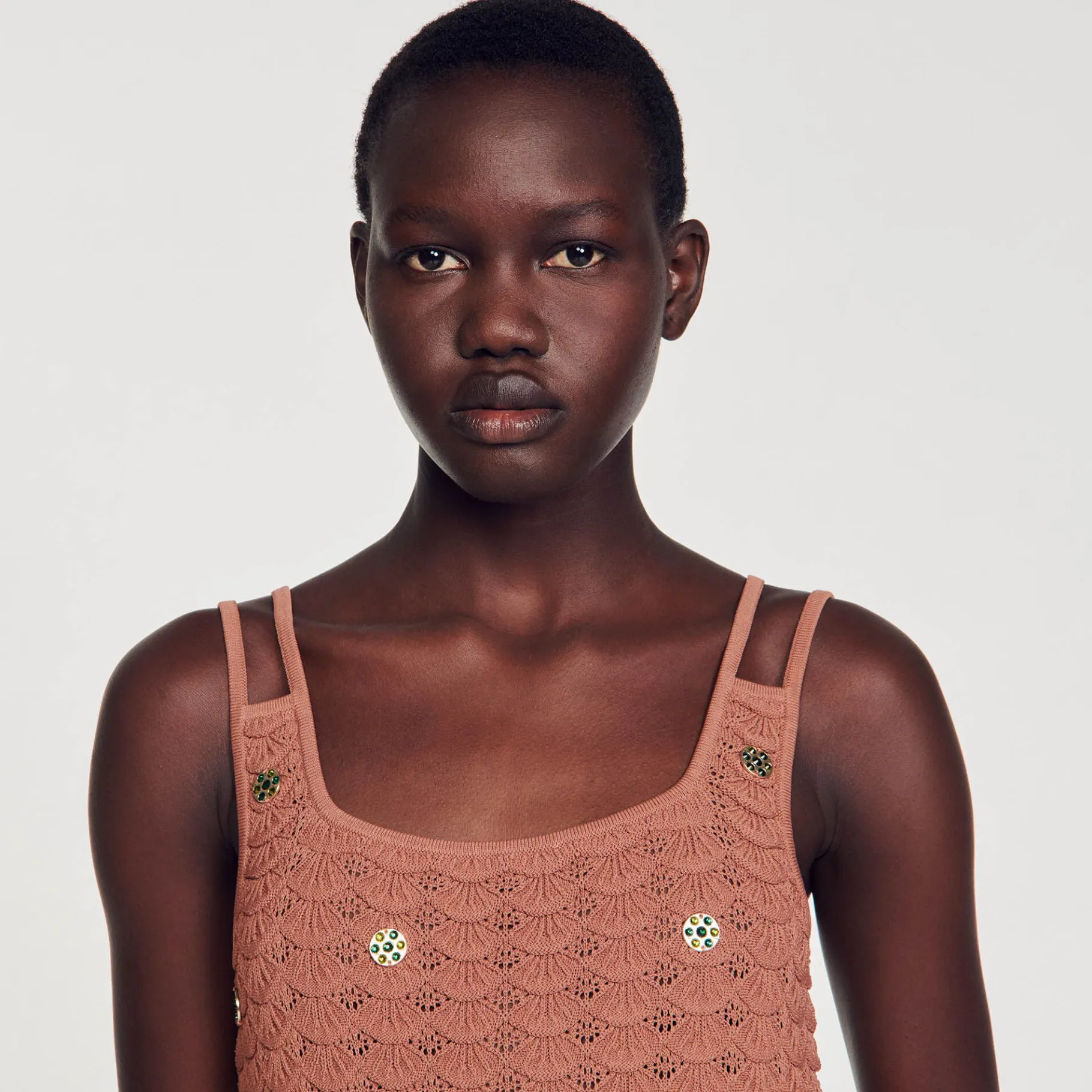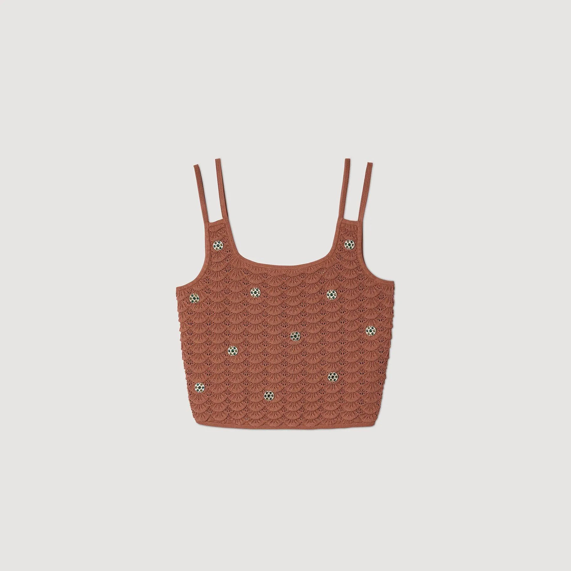 Top Curto Em Malha Texturizada Decorado Com Peças Metálicas Brilhantes E Alças Duplas Vazadas.