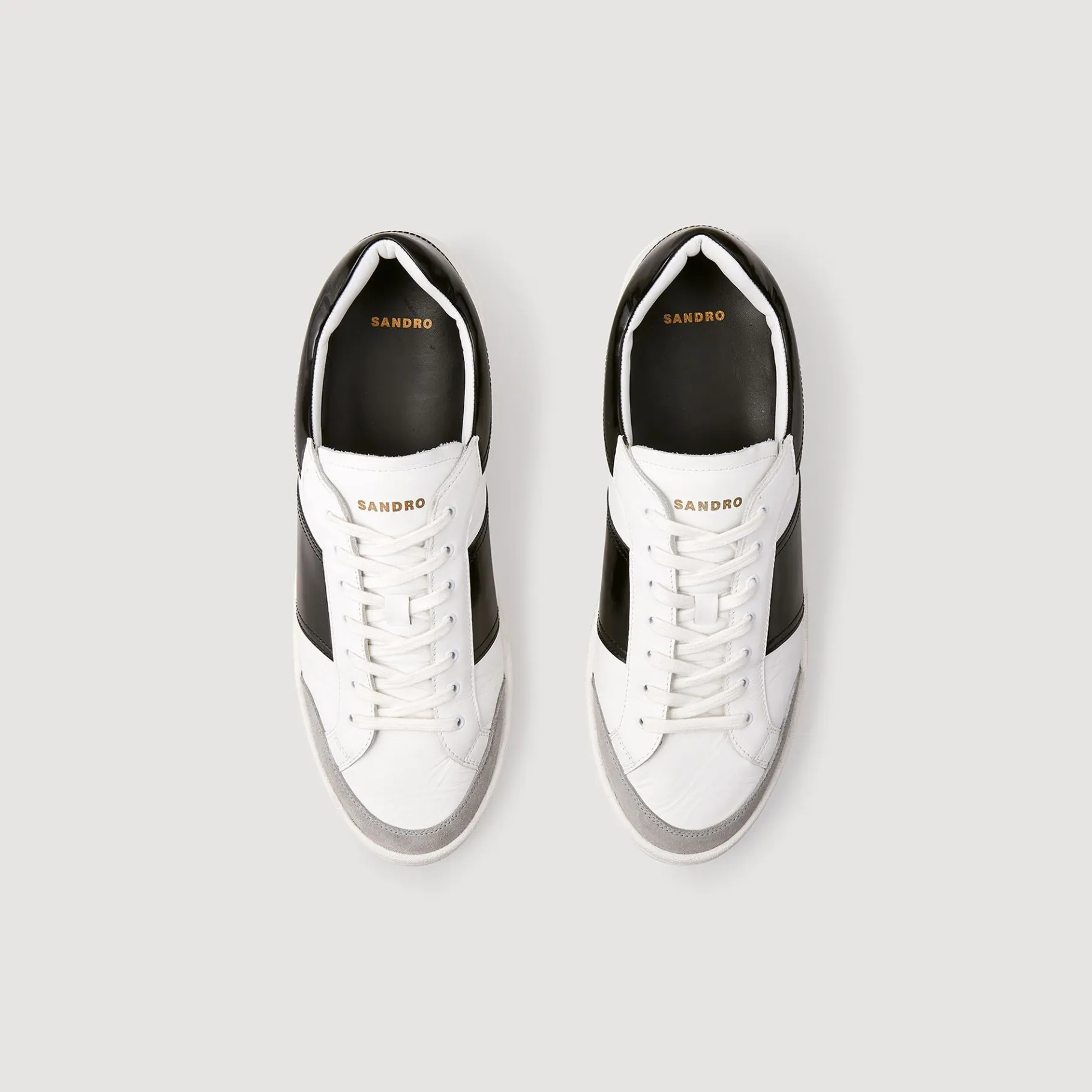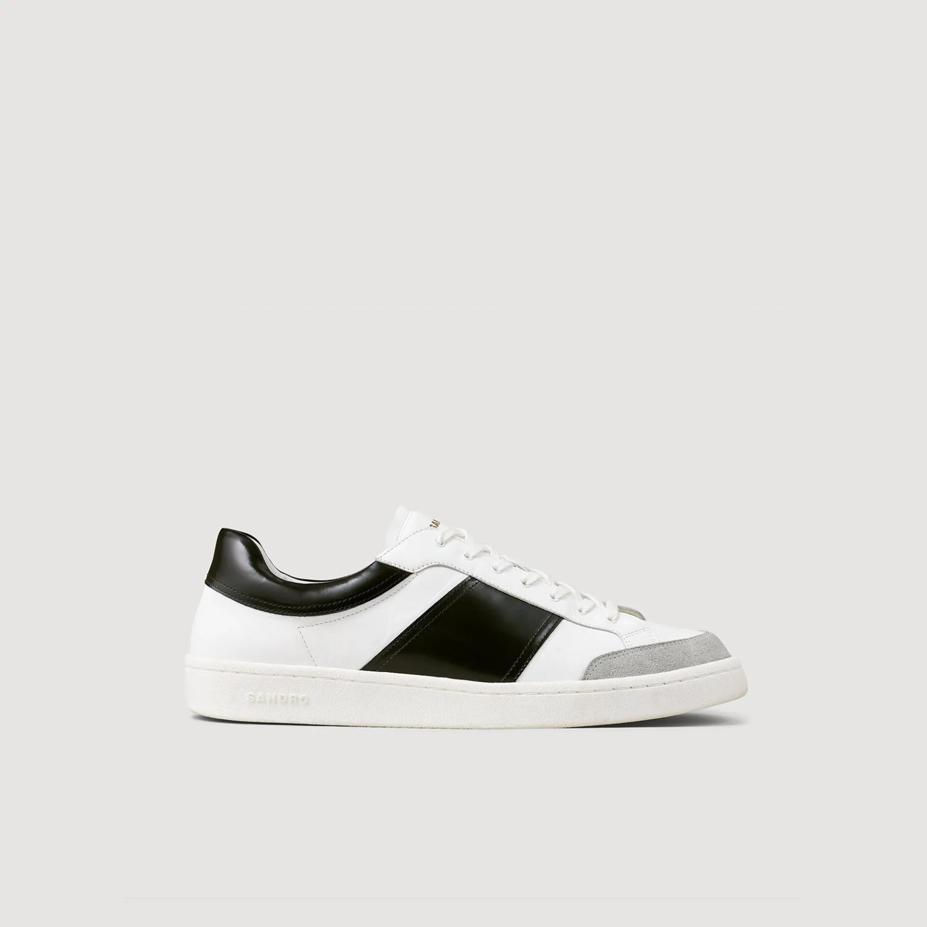 Tênis De Couro Estilo Vintage Levemente Elevado, Com Detalhe De Aplicação De Couro Envernizado Contrastante No Tornozelo E Nas Laterais, Aplicação De Camurça Na Frente, Atacadores Nos Mesmos Tons E Sola De Borracha Com Logotipo Sandro Gravado Na Lateral.