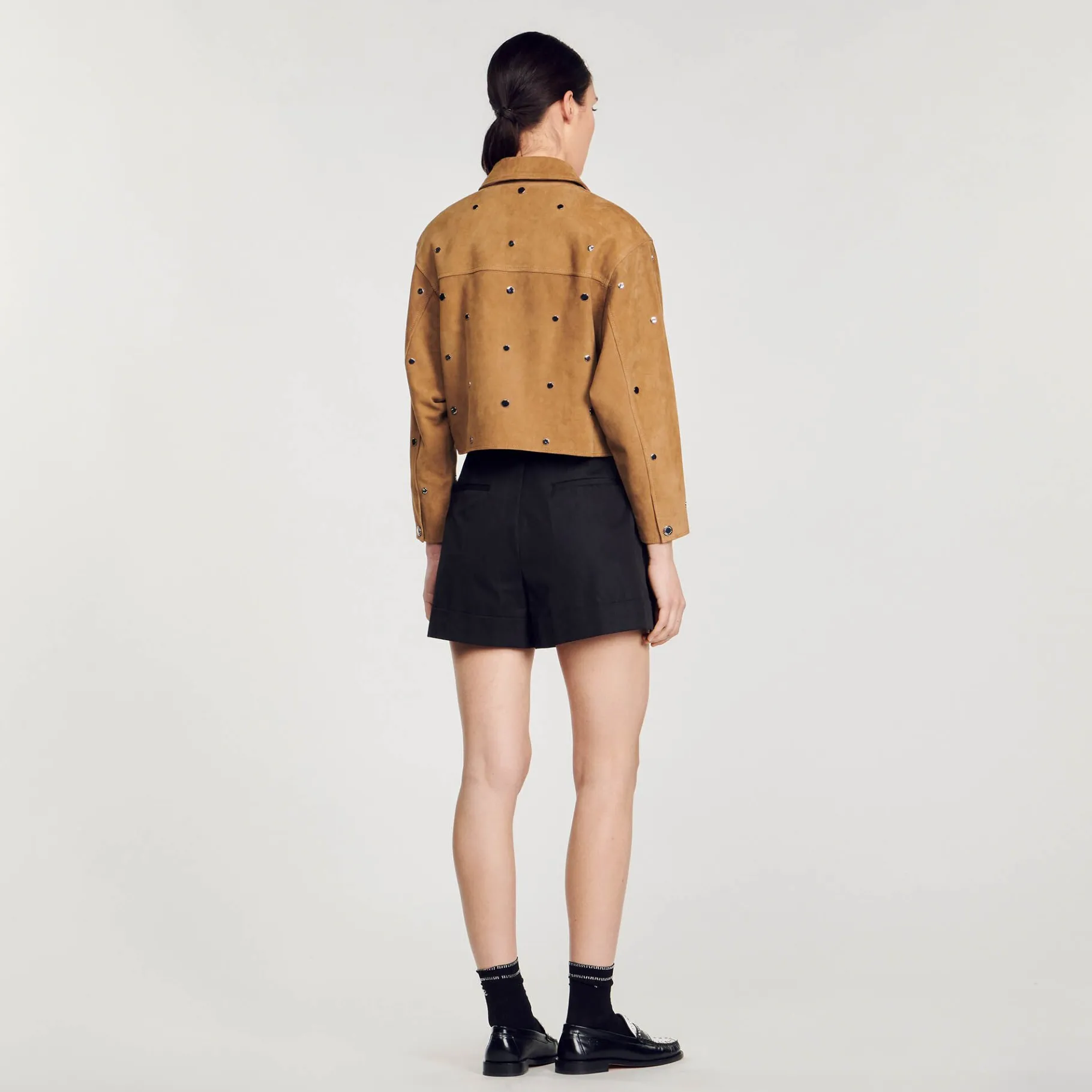 Casaco De Camurça Decorado Com Tachas, Gola De Camisa, Manga Comprida, Fecho De Correr E Bolso Com Fecho De Correr.