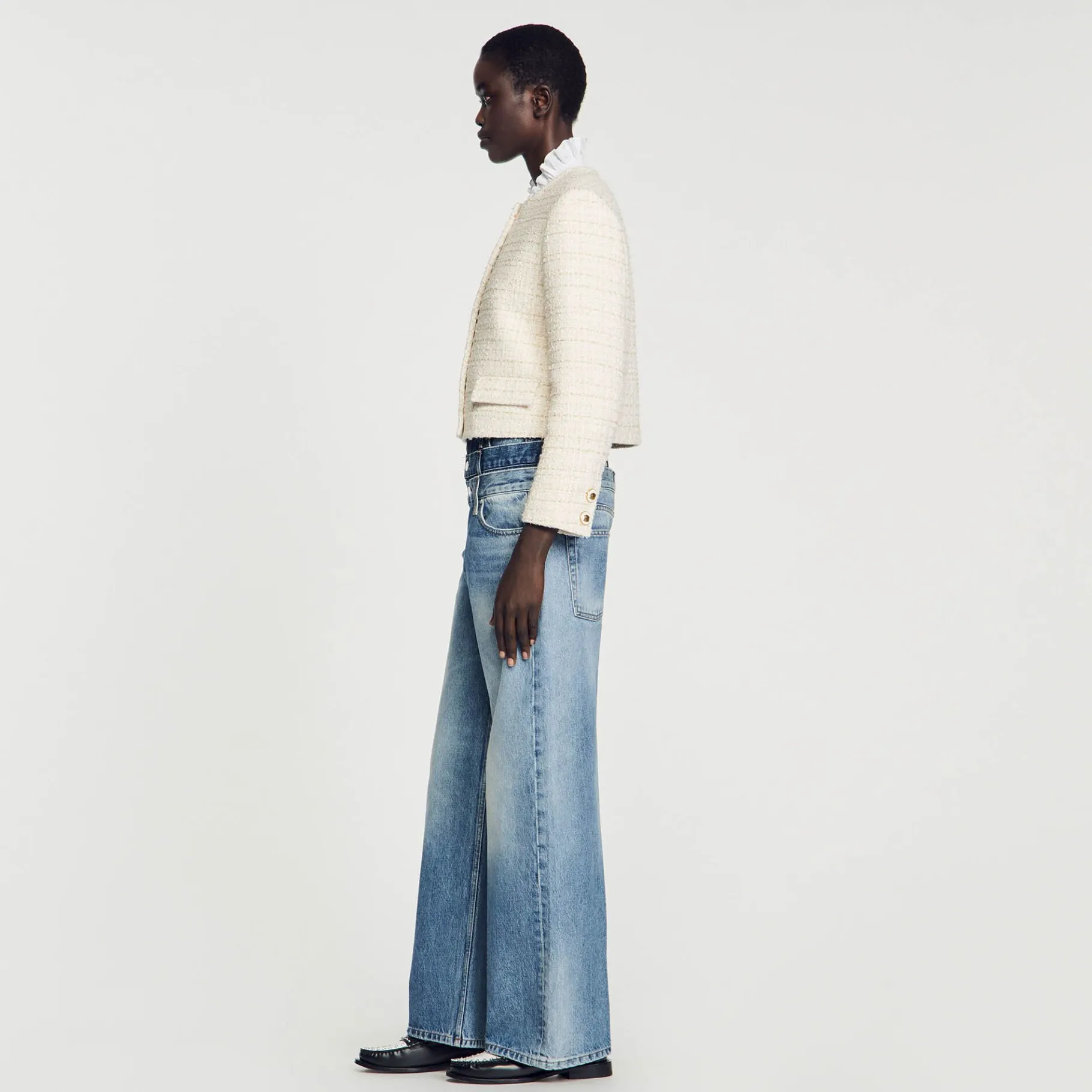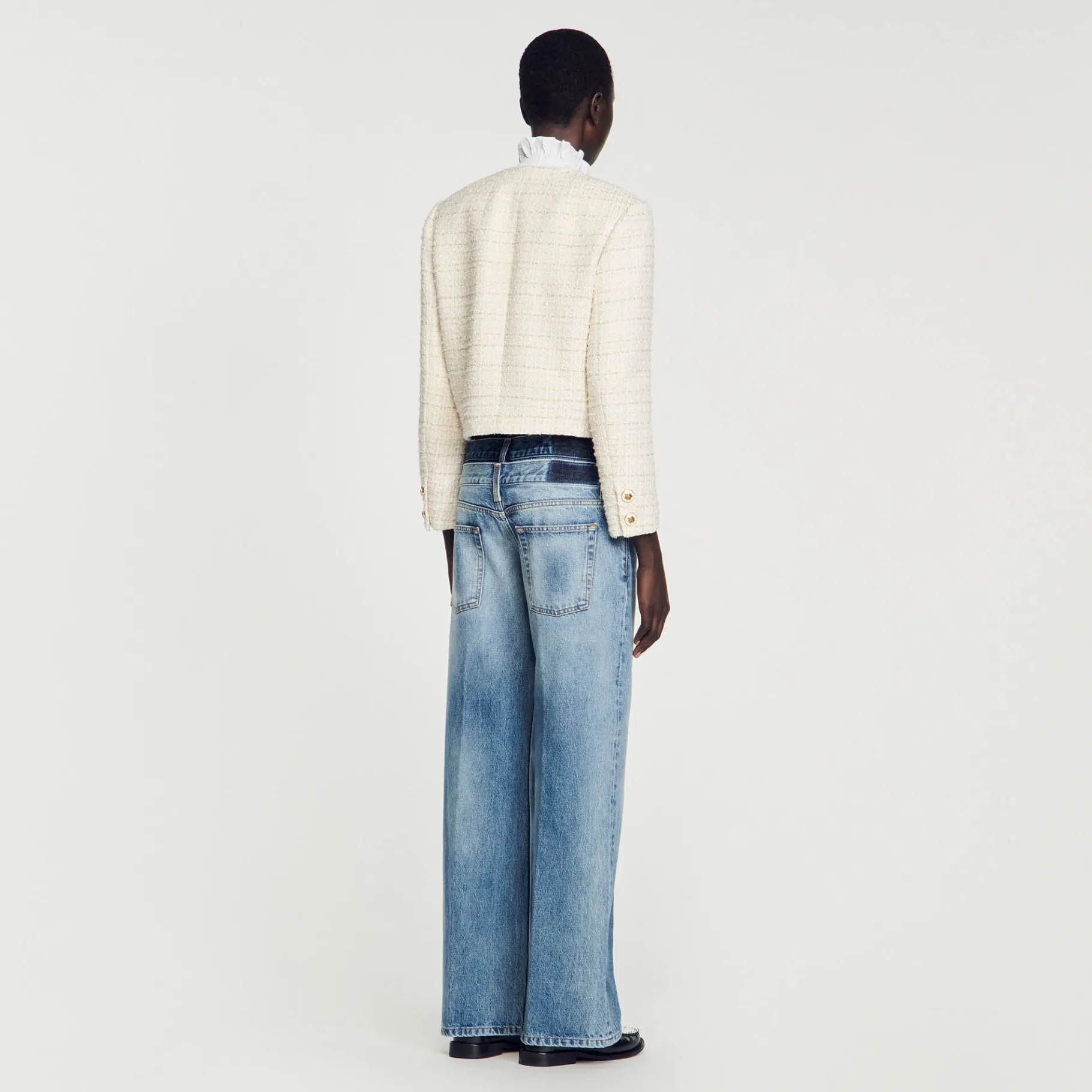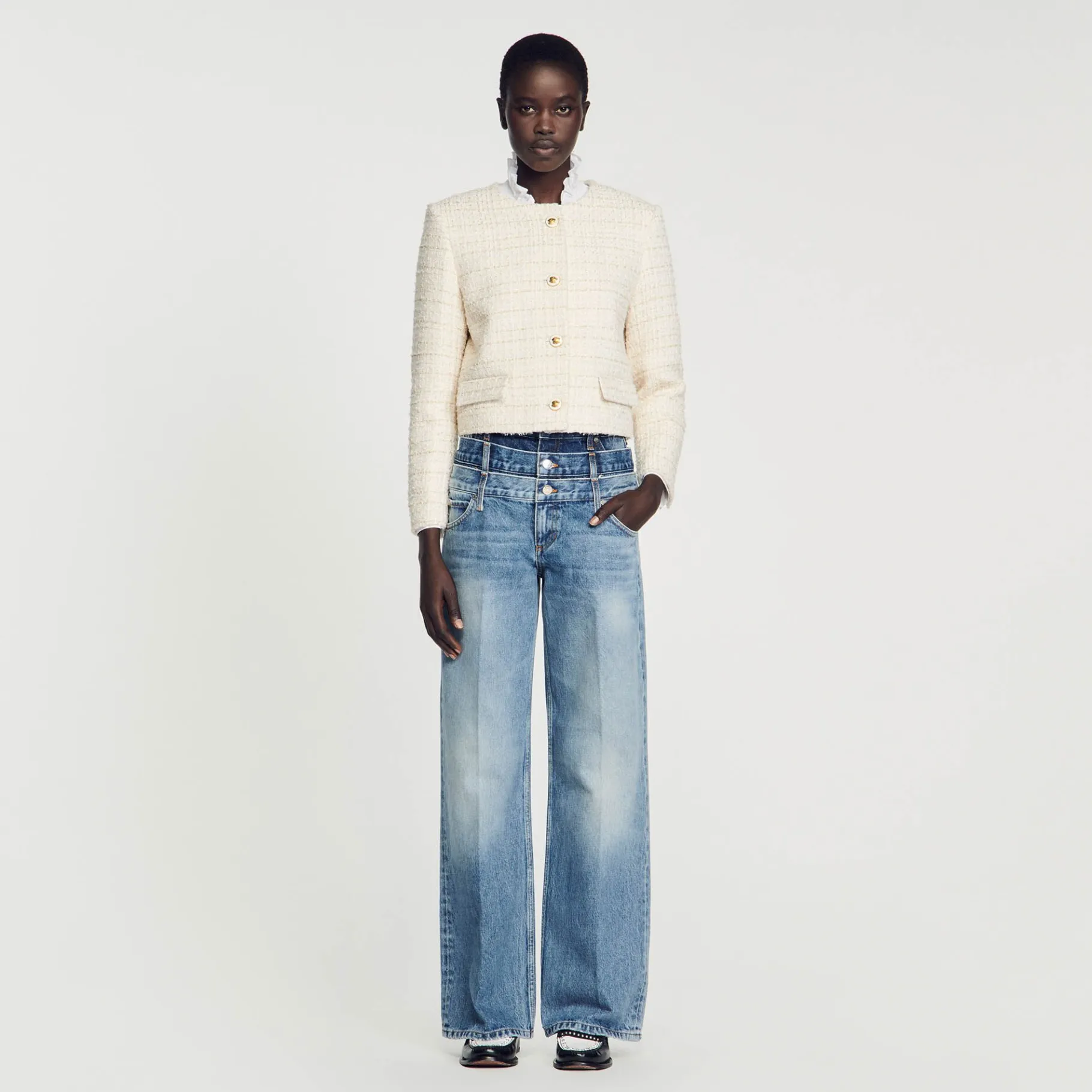 Jaqueta Curta De Sarja Elegante Com Decote Redondo, Mangas Compridas Com Abertura Nos Punhos E Fecho De Botão Elegante.
