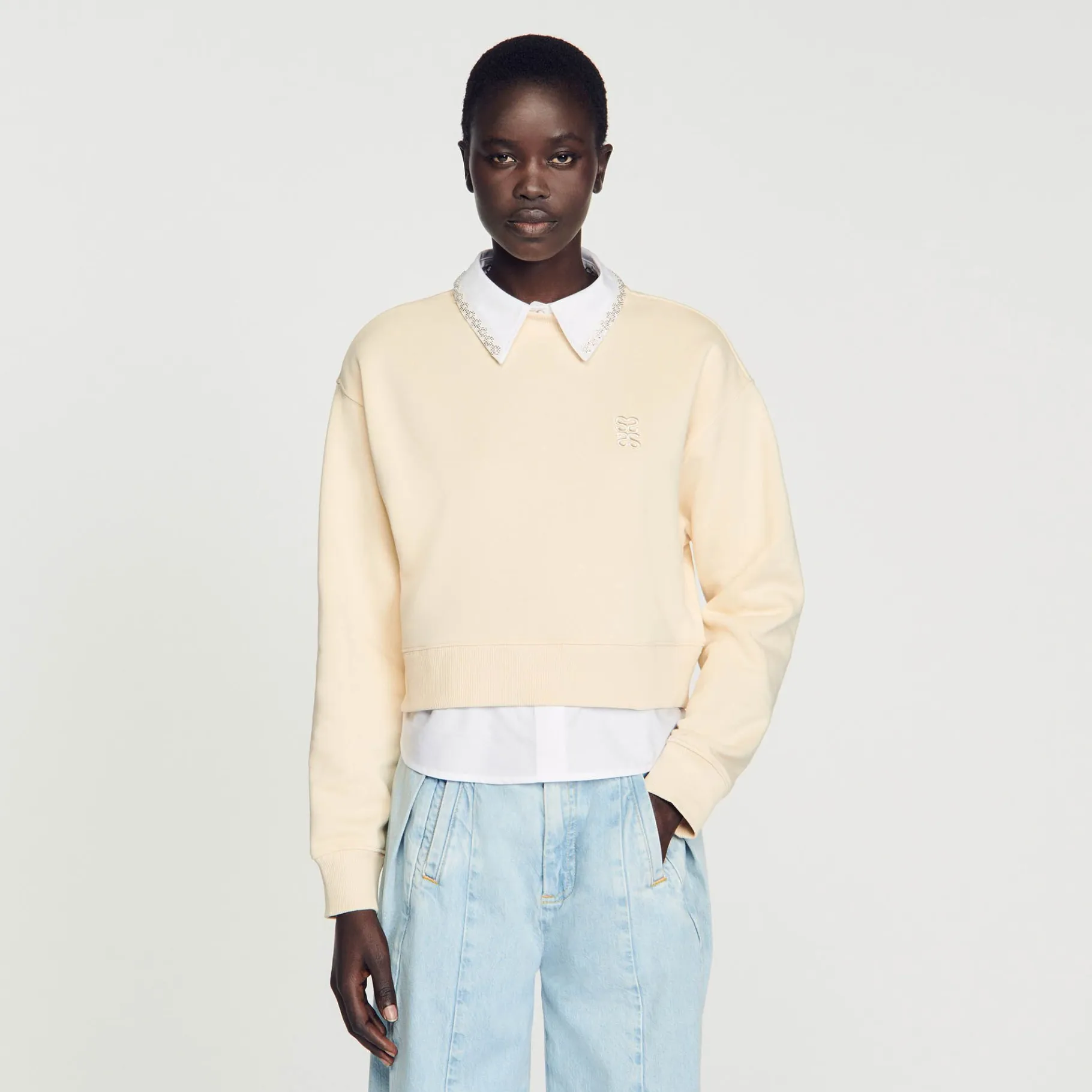 T-Shirt Sweatshirt Com Efeito 2 Em 1 Com Gola Decorada Com Strass, Manga Comprida E Bordado Duplo S No Peito.
