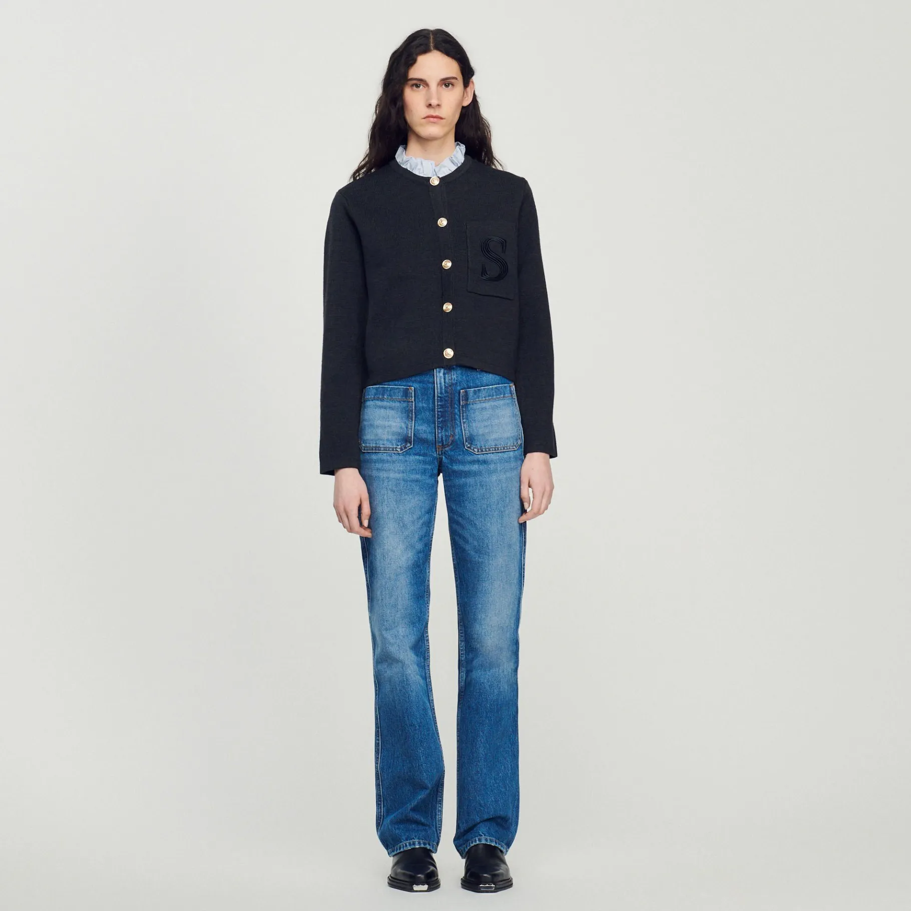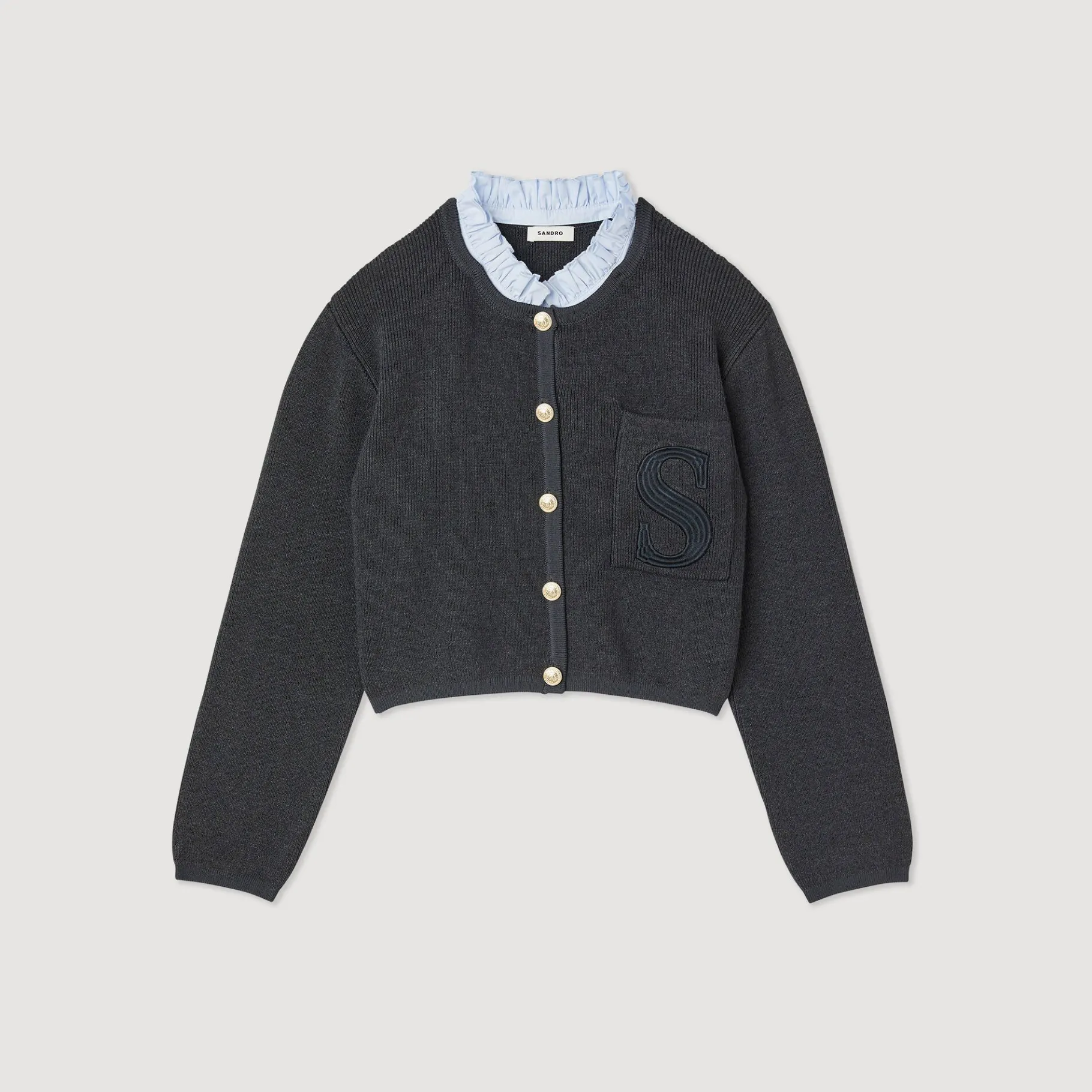 Cardigã De Malha Com Gola De Babado Contrastante, Manga Comprida, Carcela De Botões E Bolso De Aplicação No Peito Com Bordado S