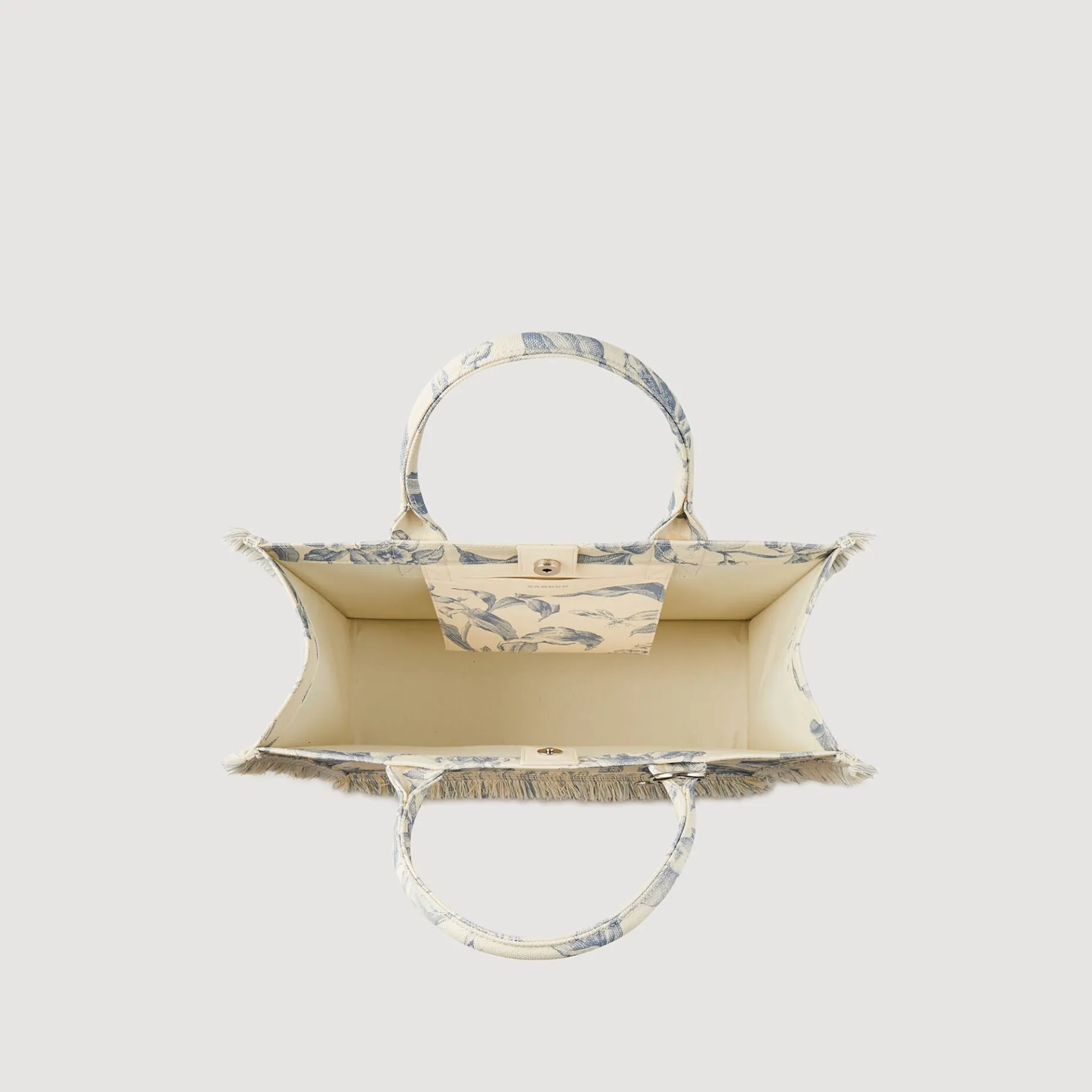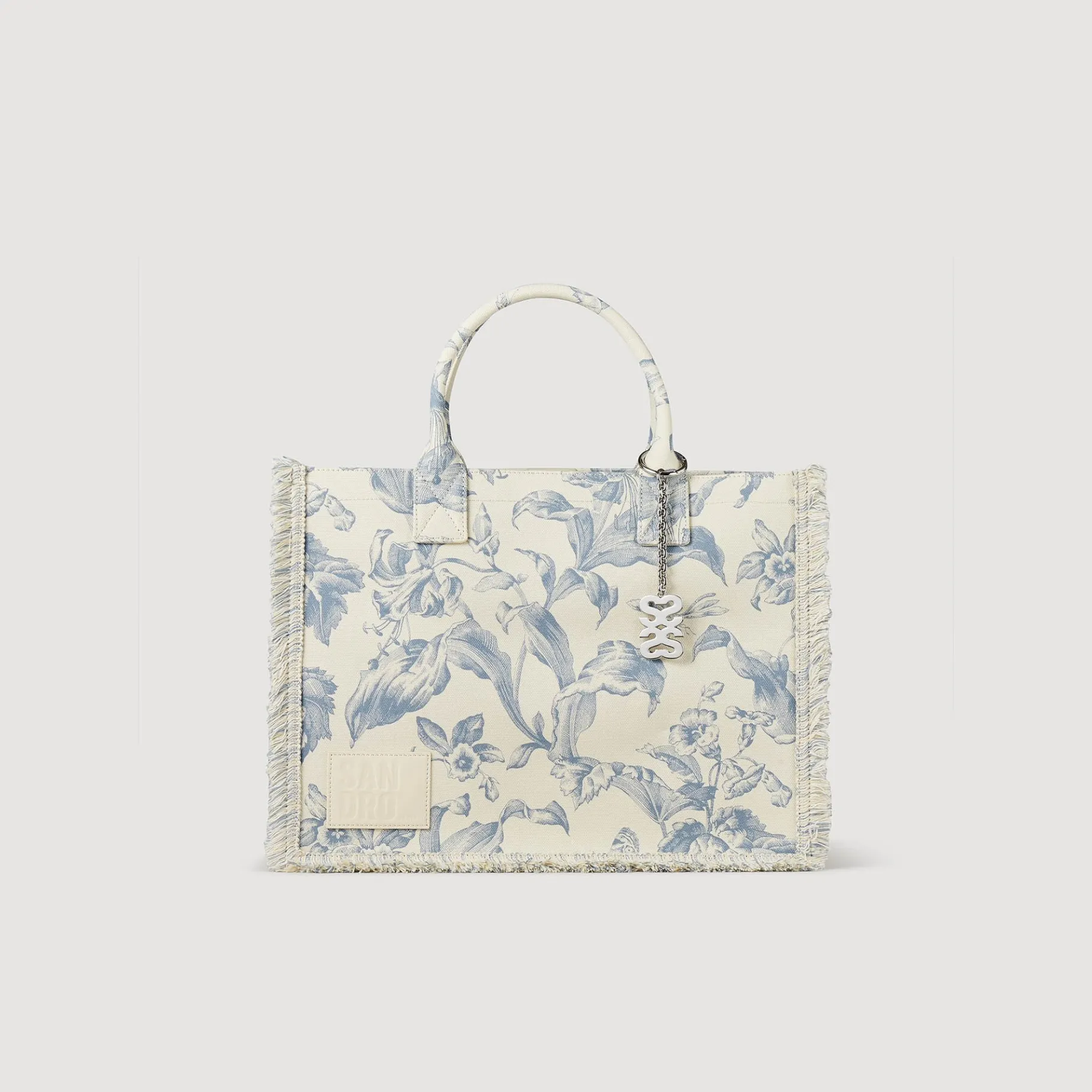 Bolsa De Tecido Estilo “Toile De Jouy” Com Motivos Florais, Alças, Fecho Magnético, Pingente Removível E Pequeno Detalhe De Franjas Nas Bordas