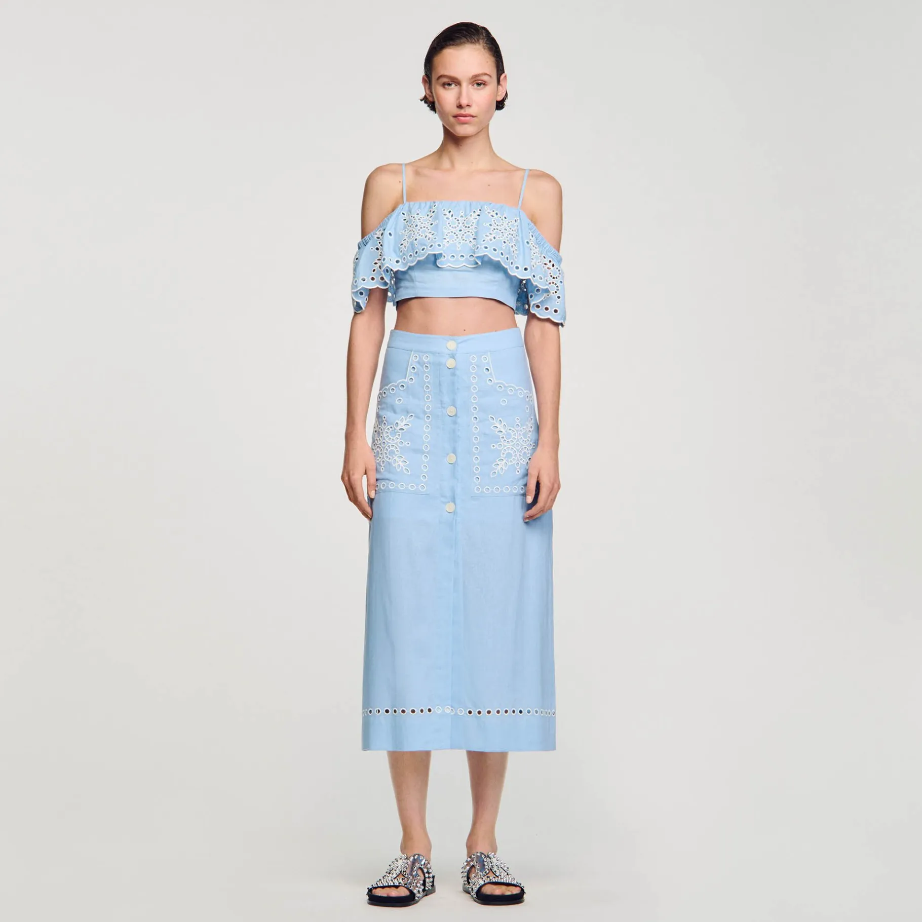 Saia Longa Com Botões E Detalhe De Bordado Inglês Com Flores Em Contraste Nos Bolsos E Na Barra.