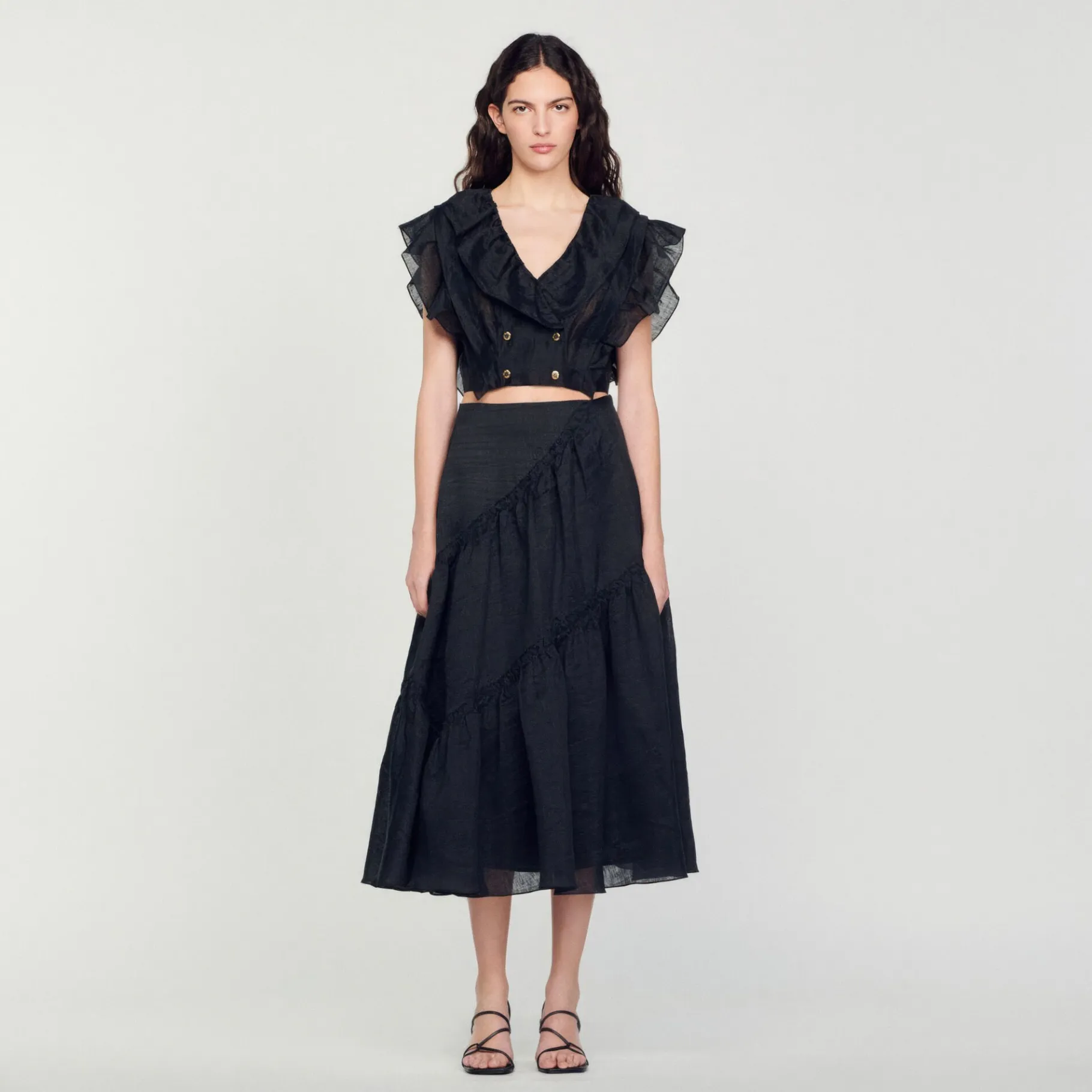 Saia Longa Levemente Larga Com Babados E Franzidos E Fechamento Por Zíper Na Lateral.