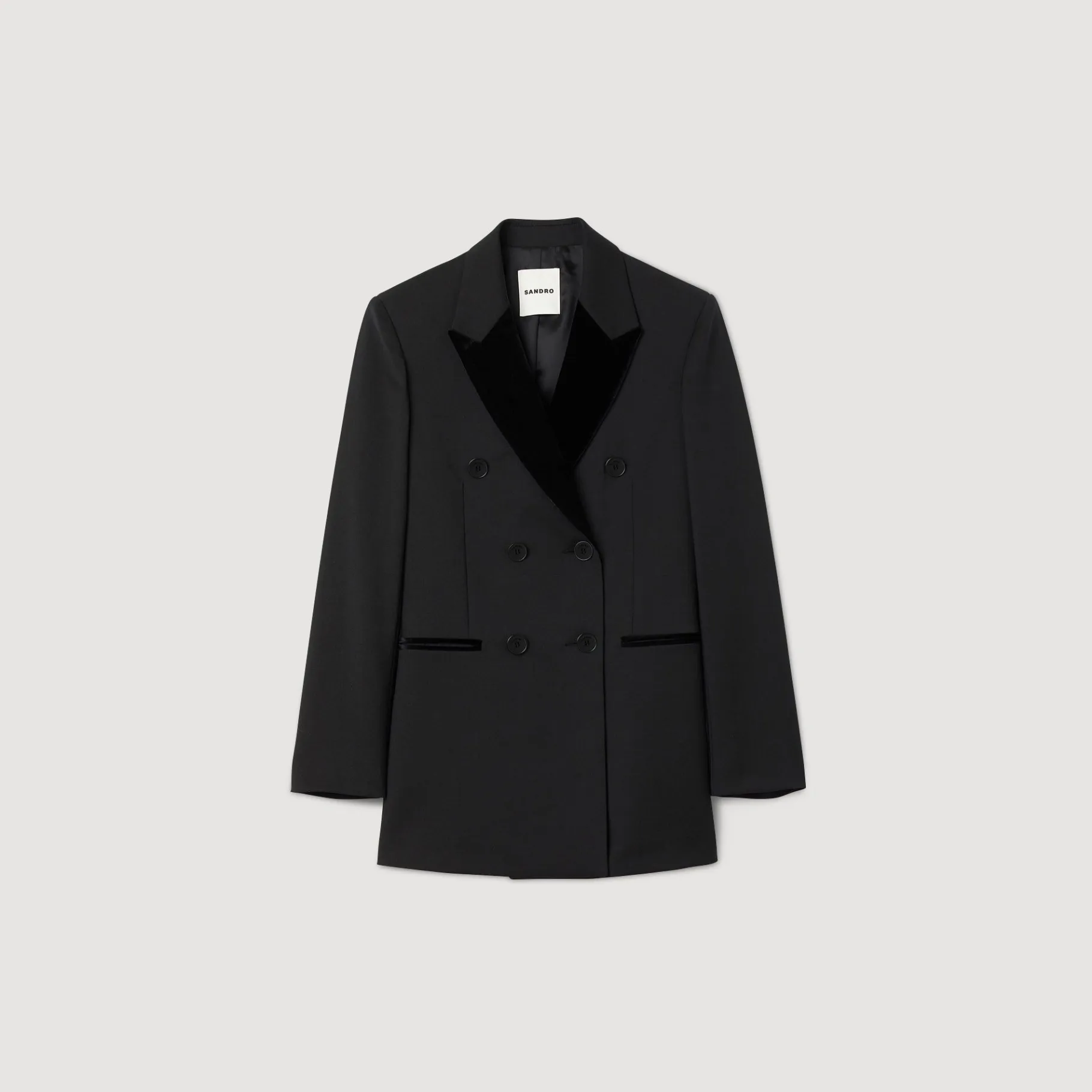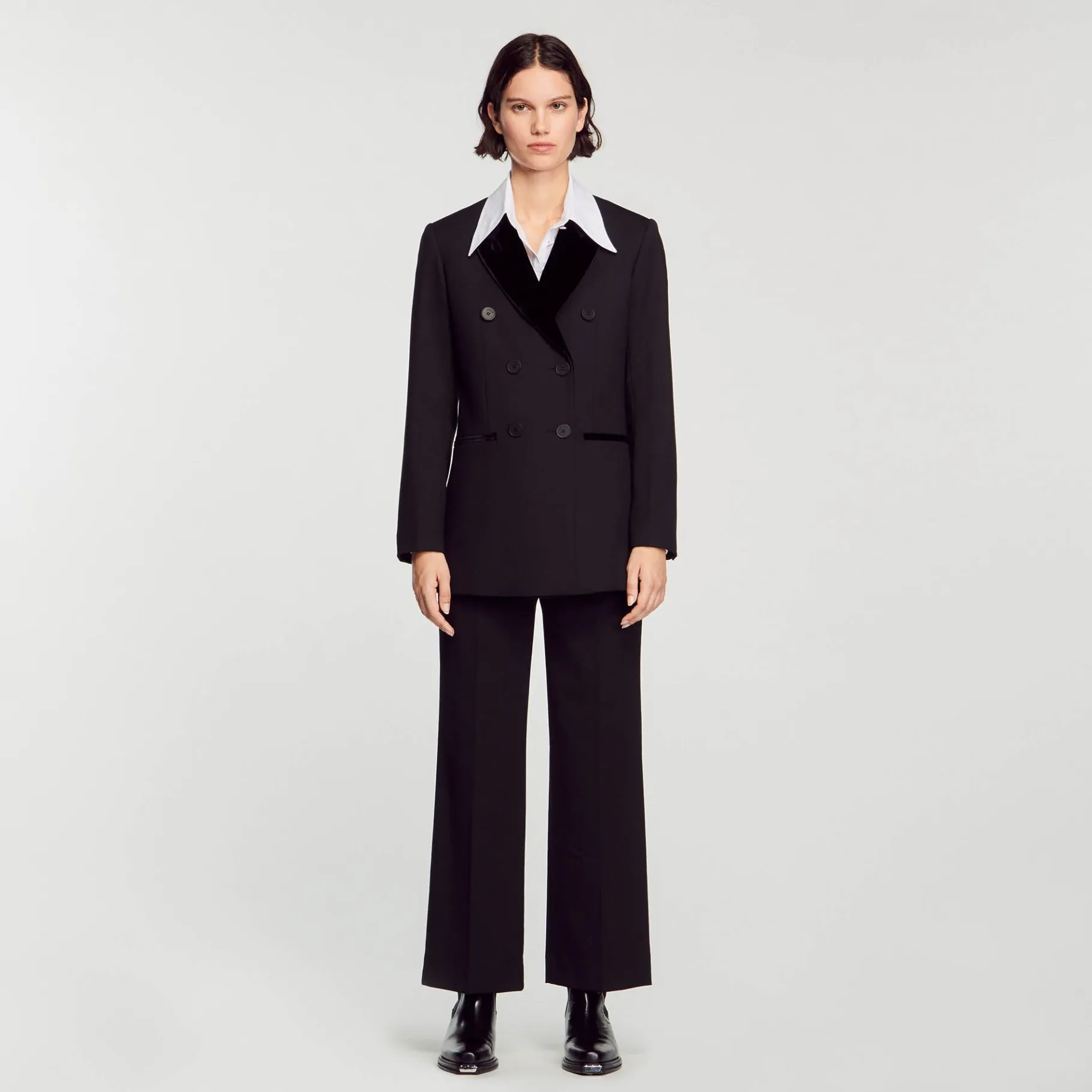 Jaqueta De Cauda Com Mangas Compridas E Gola Larga De Veludo, Com Botões Trespassados E Bolso De Casa De Botão.
