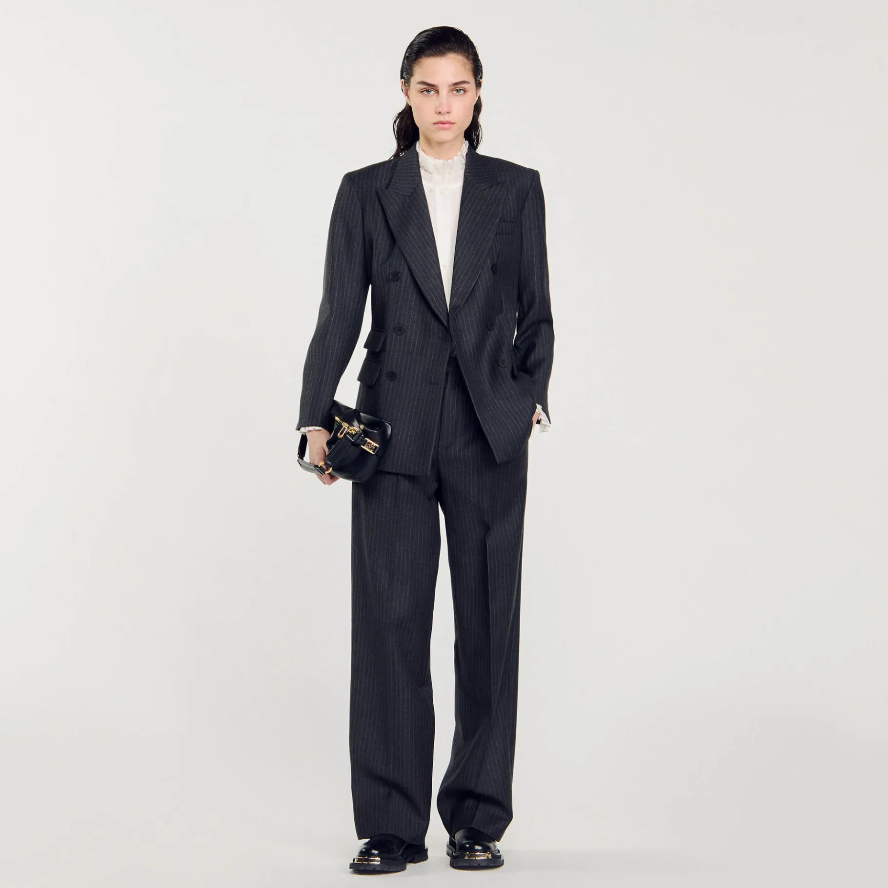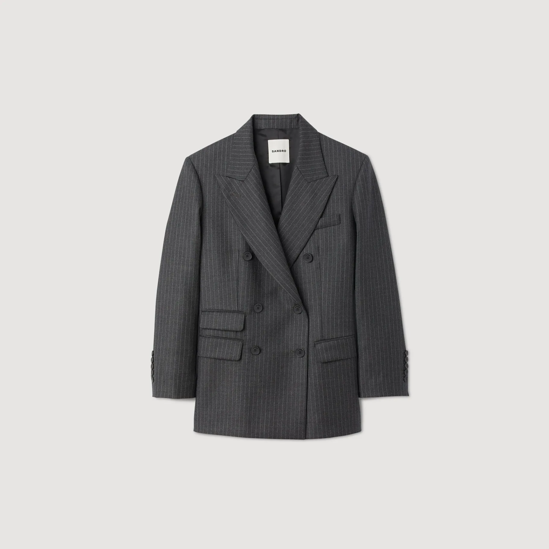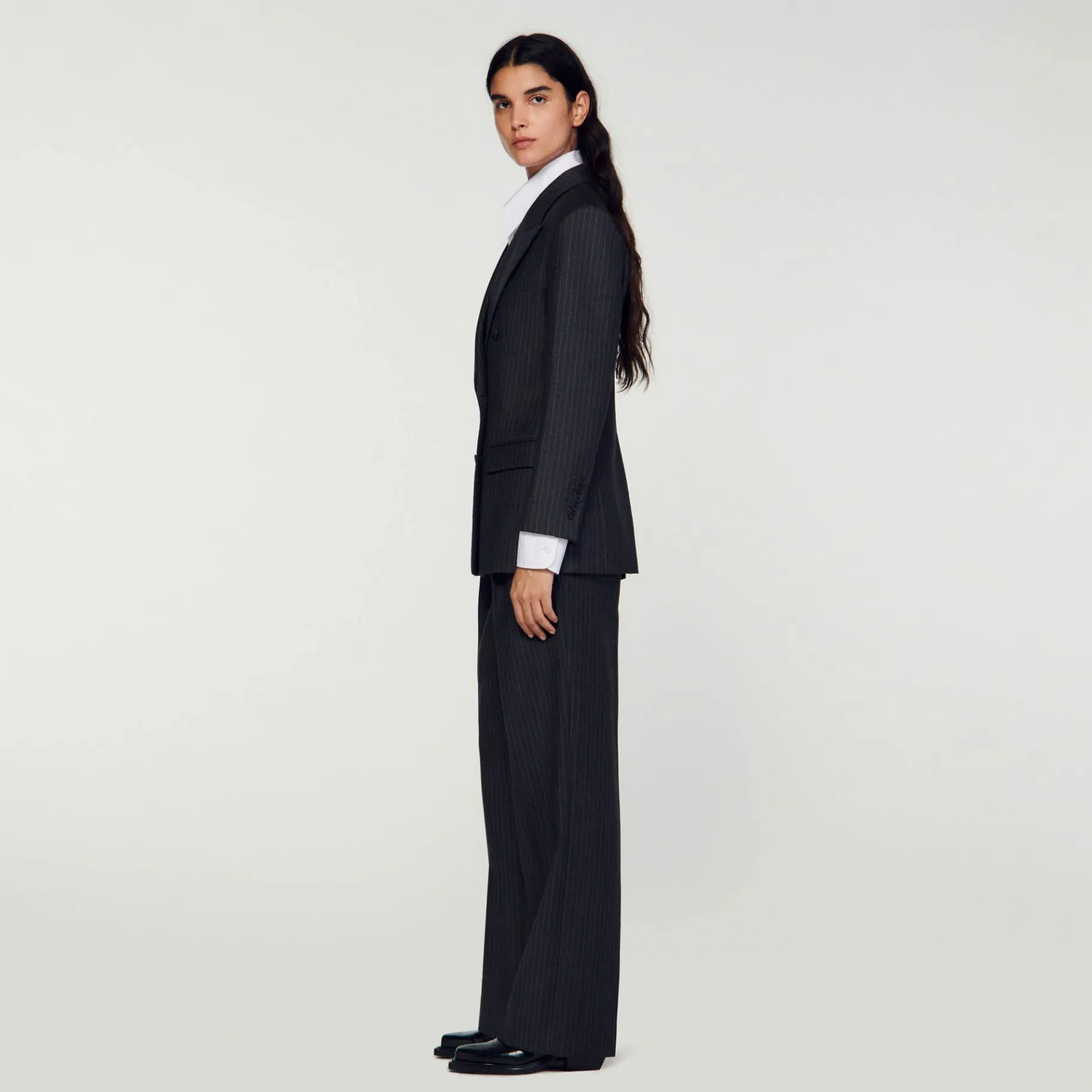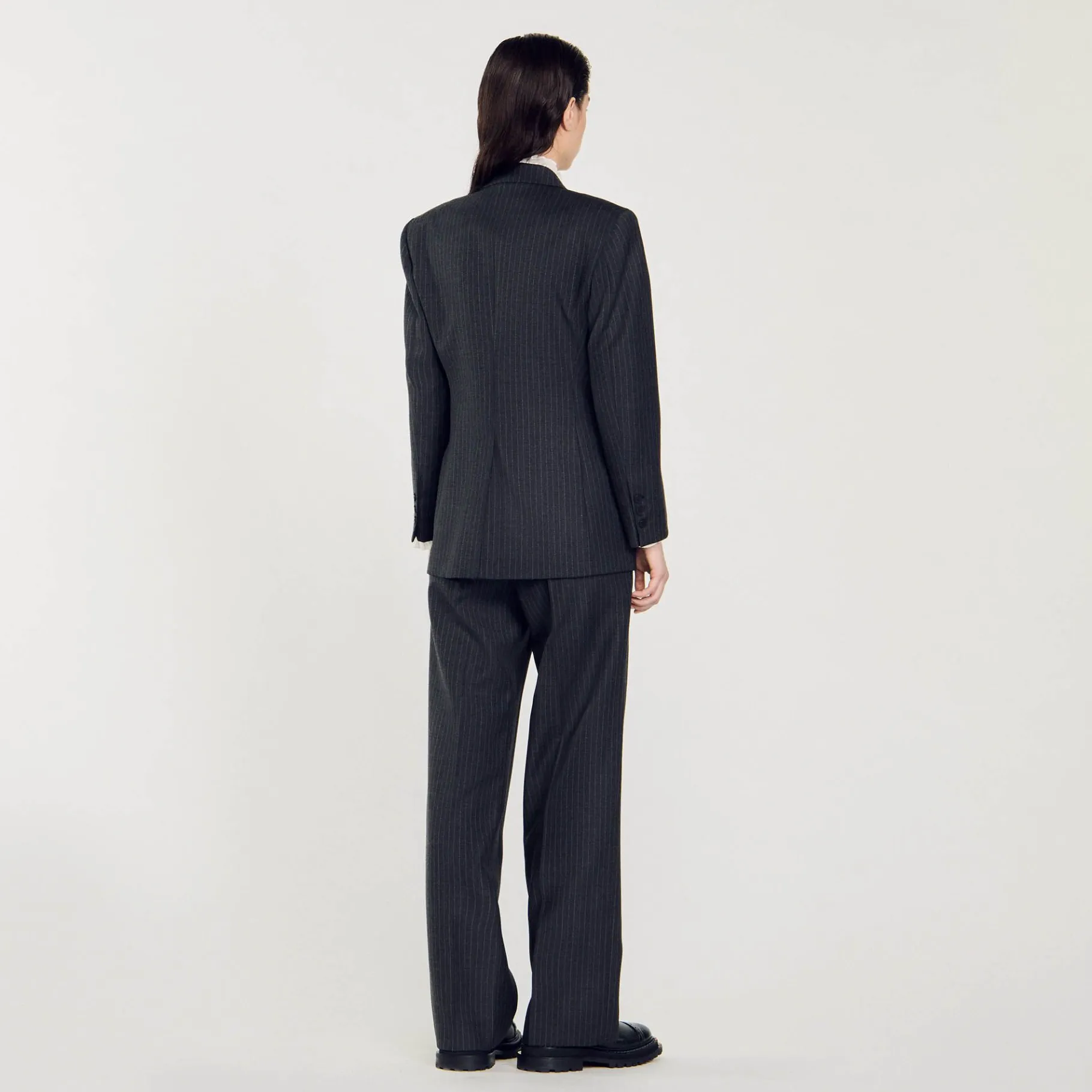 Paletó Justo Com Riscas De Giz, Gola Alta Com Lapelas, Fecho De Botão Trespassado, Manga Comprida E Bolsos De Debrum.