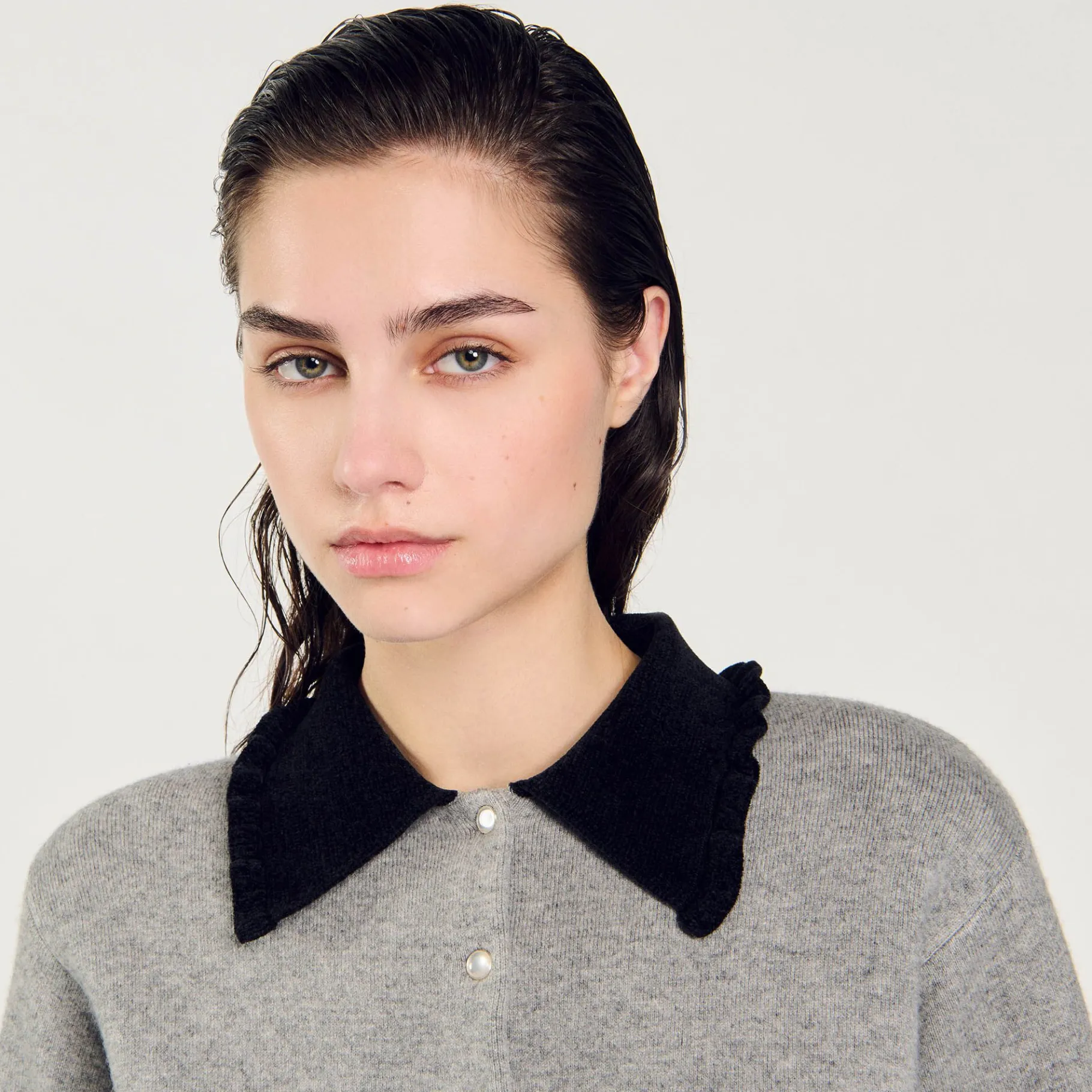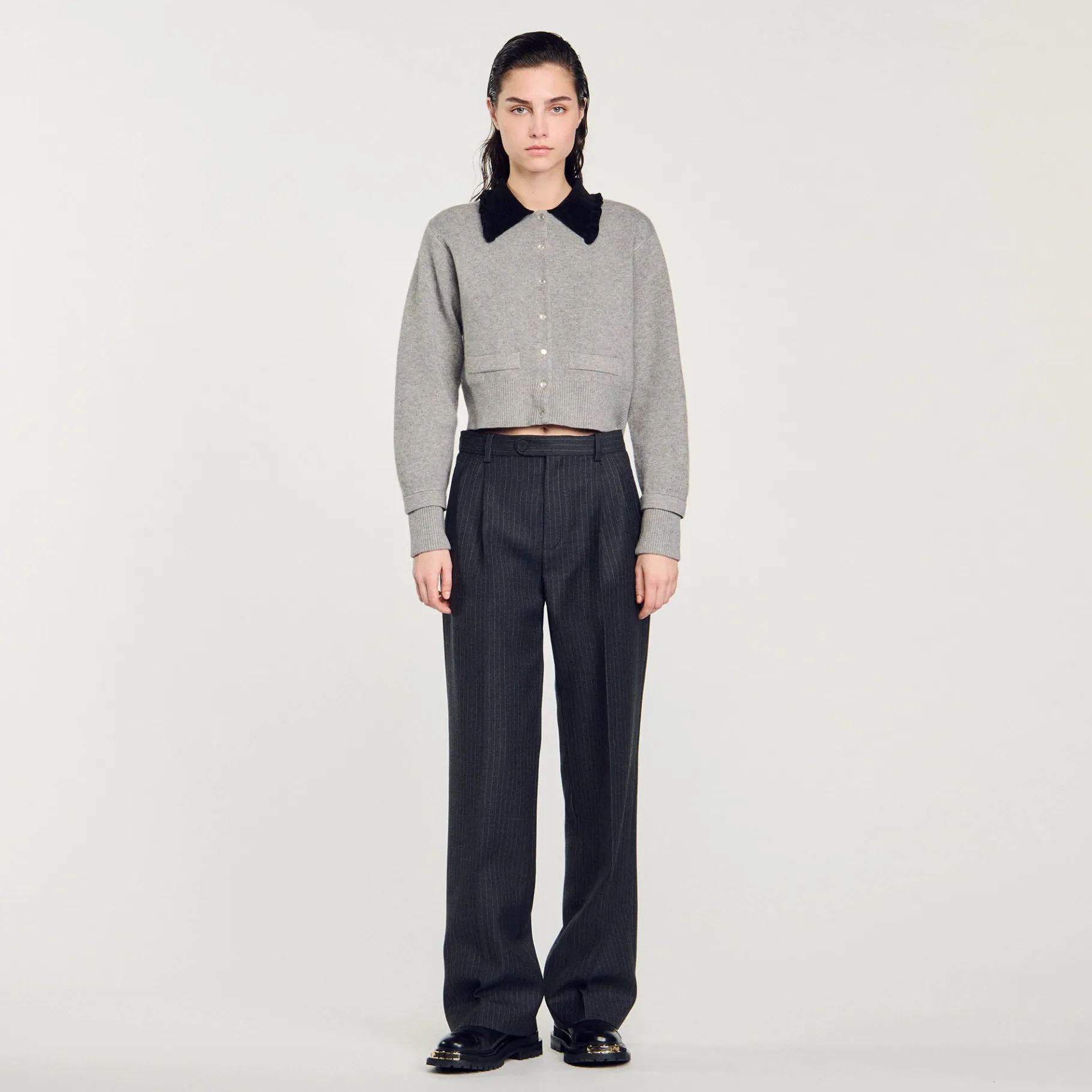 Cardigã Curto Estilo Camisa Com Mangas Compridas E Gola De Veludo Contrastante, Com Fecho De Botão.