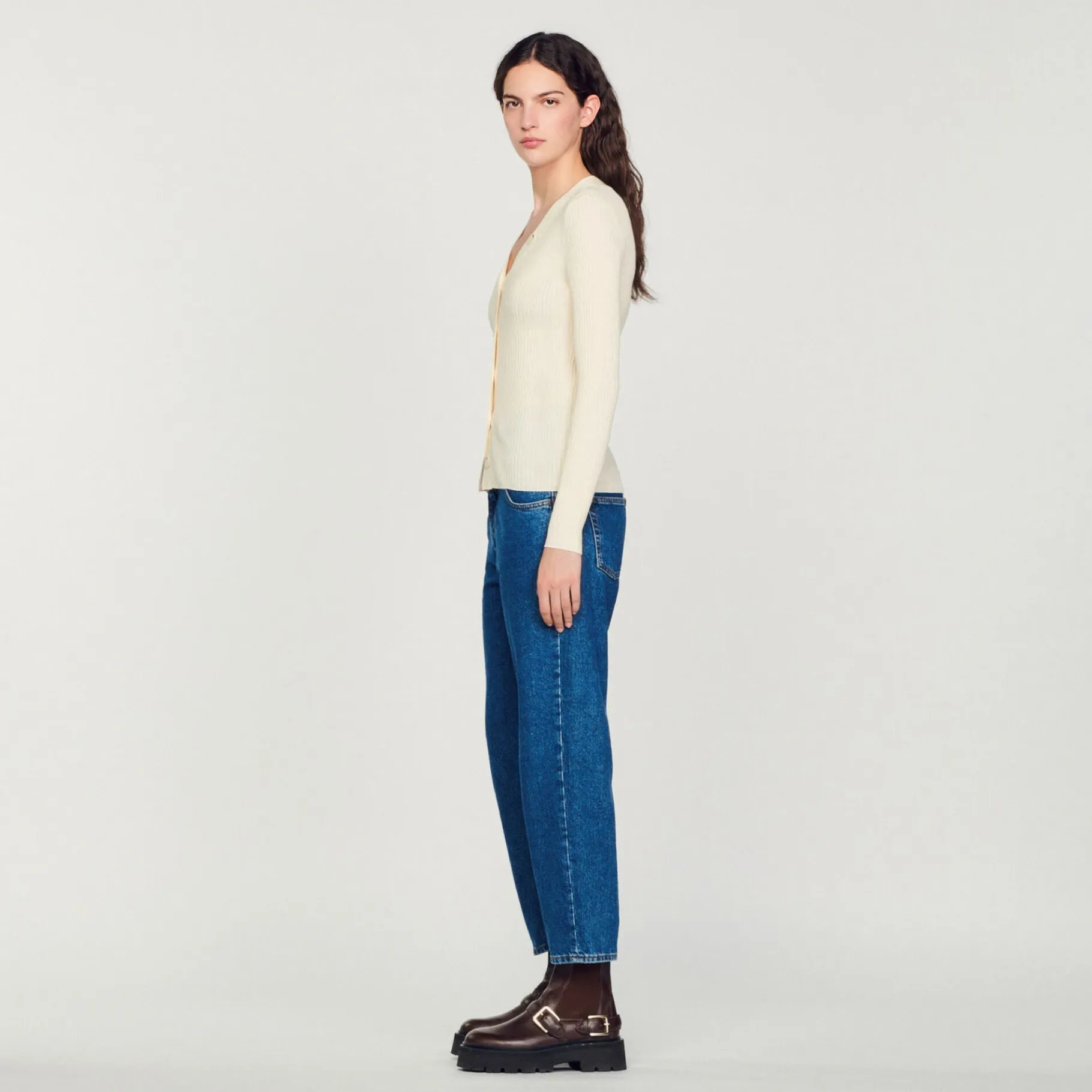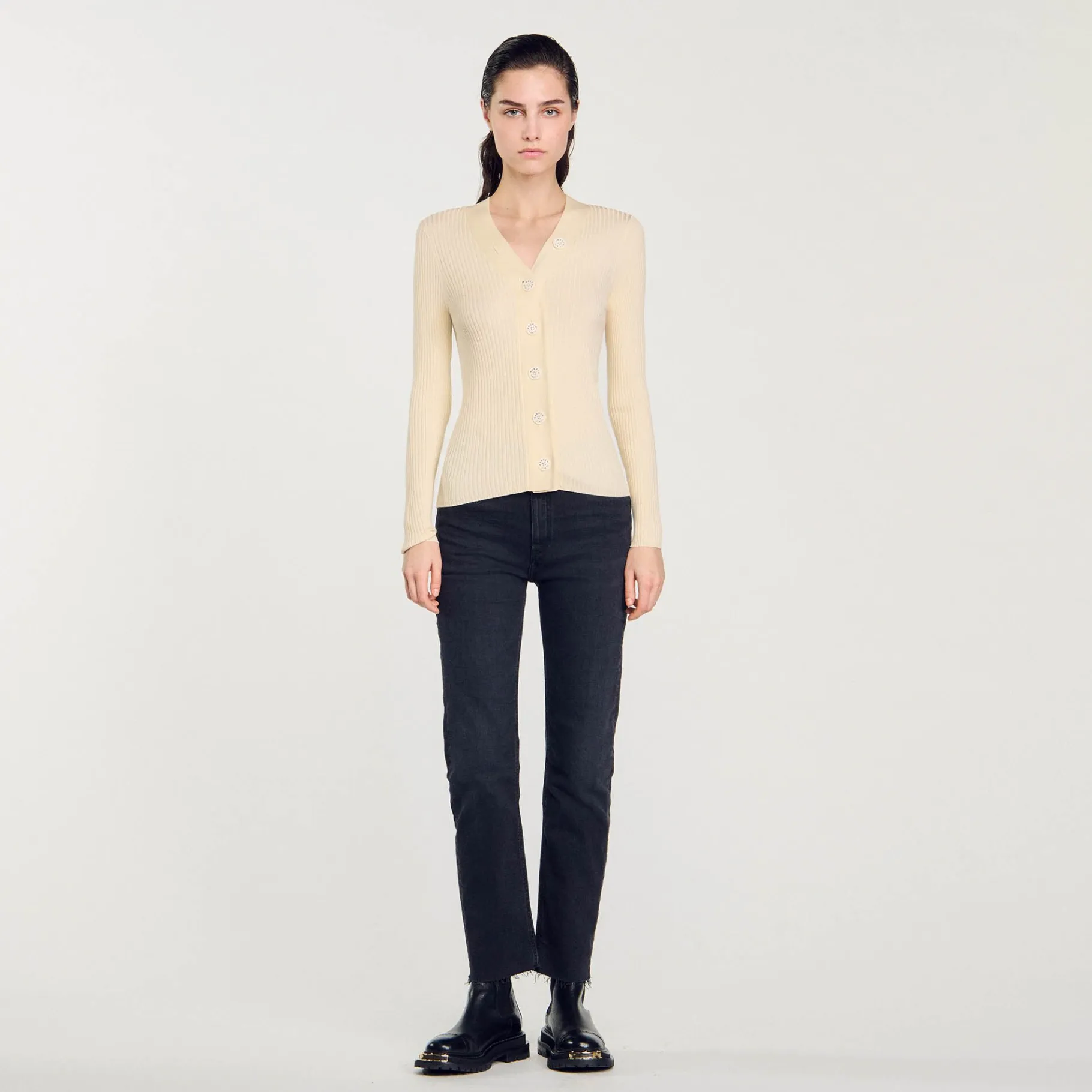 Cardigã De Manga Comprida Com Decote Em V Em Malha Canelada Fina Com Fecho De Botão.