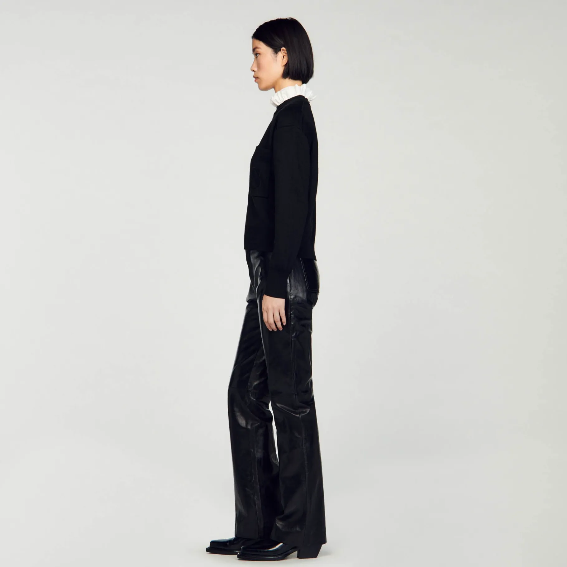 Suéter De Malha Dupla Face Com Gola Alta Contrastante Com Babados, Manga Comprida E Bolso De Aplicação No Peito Decorado Com Bordado Duplo S Em Veludo.