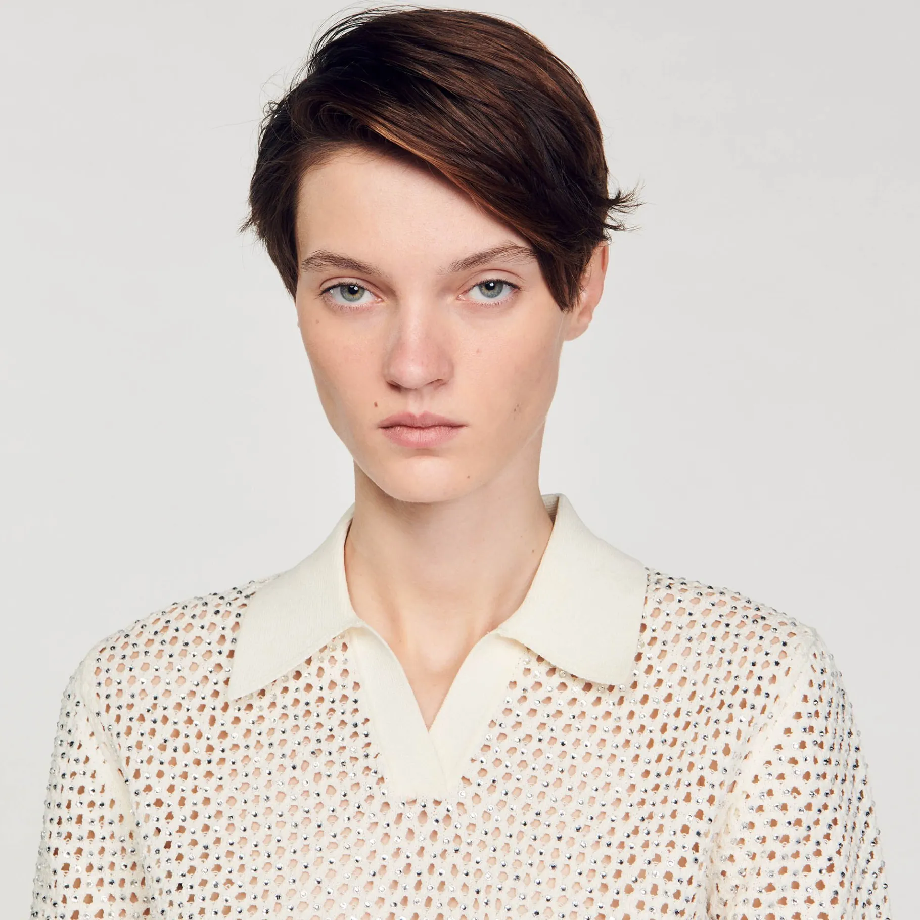 Camisola Curta Em Malha De Malha Com Detalhe De Strass, Gola Pólo, Mangas Curtas E Bainha Canelada.