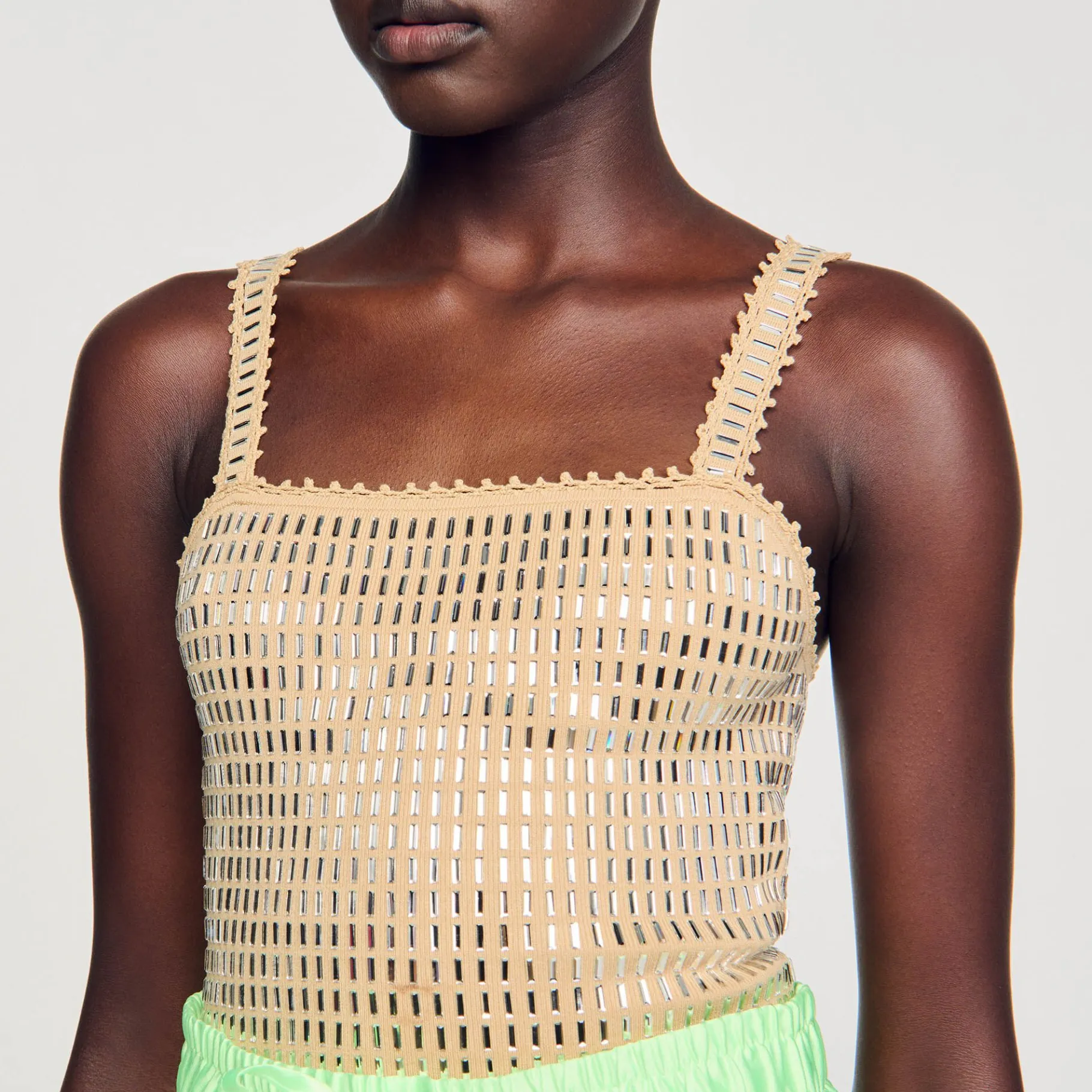 Top Curto Em Malha Com Detalhe De Strass, Decote Reto E Alças.
