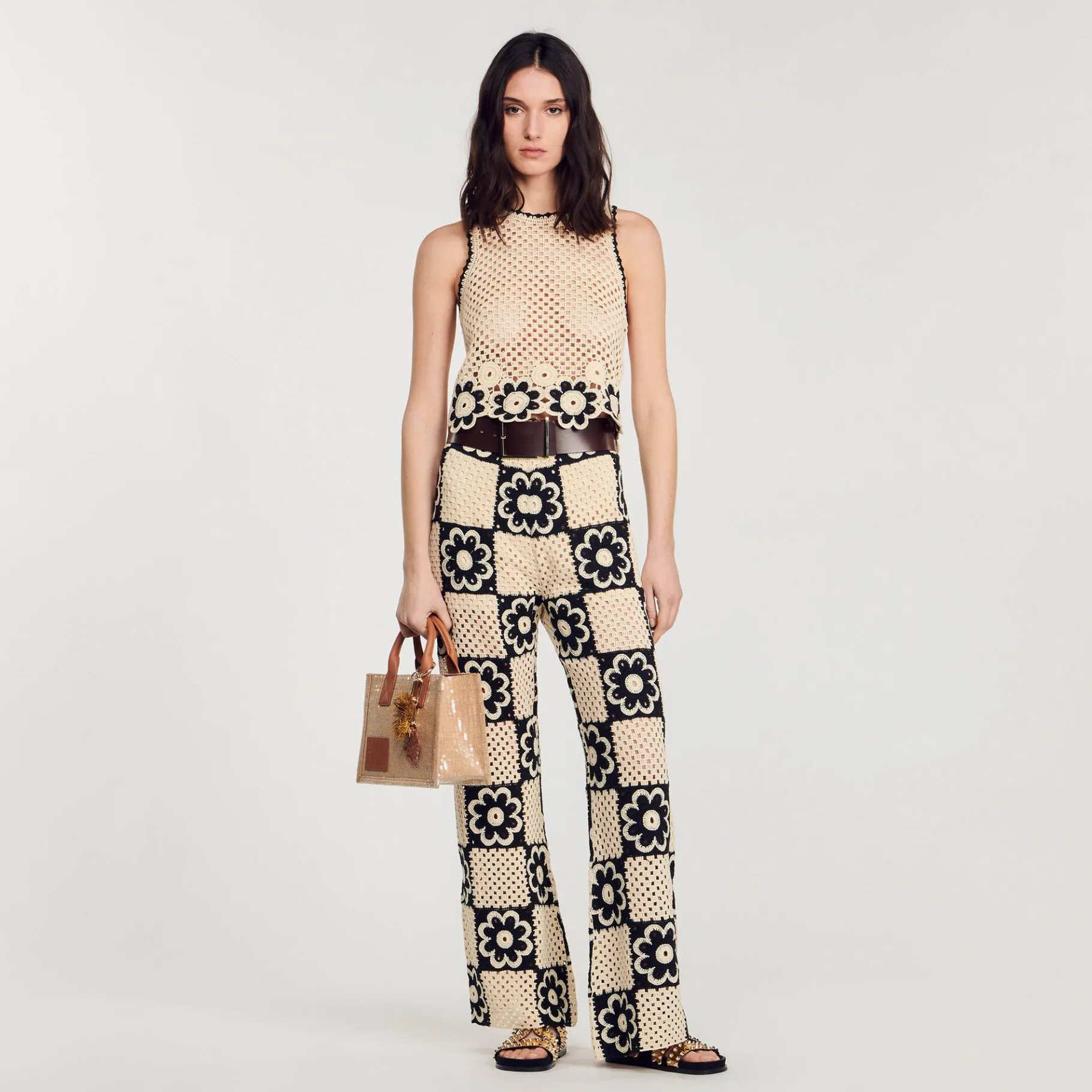 Pulôver Sem Mangas Em Malha De Crochê Com Detalhe De Motivos Florais Em Contraste E Bordas Recortadas.