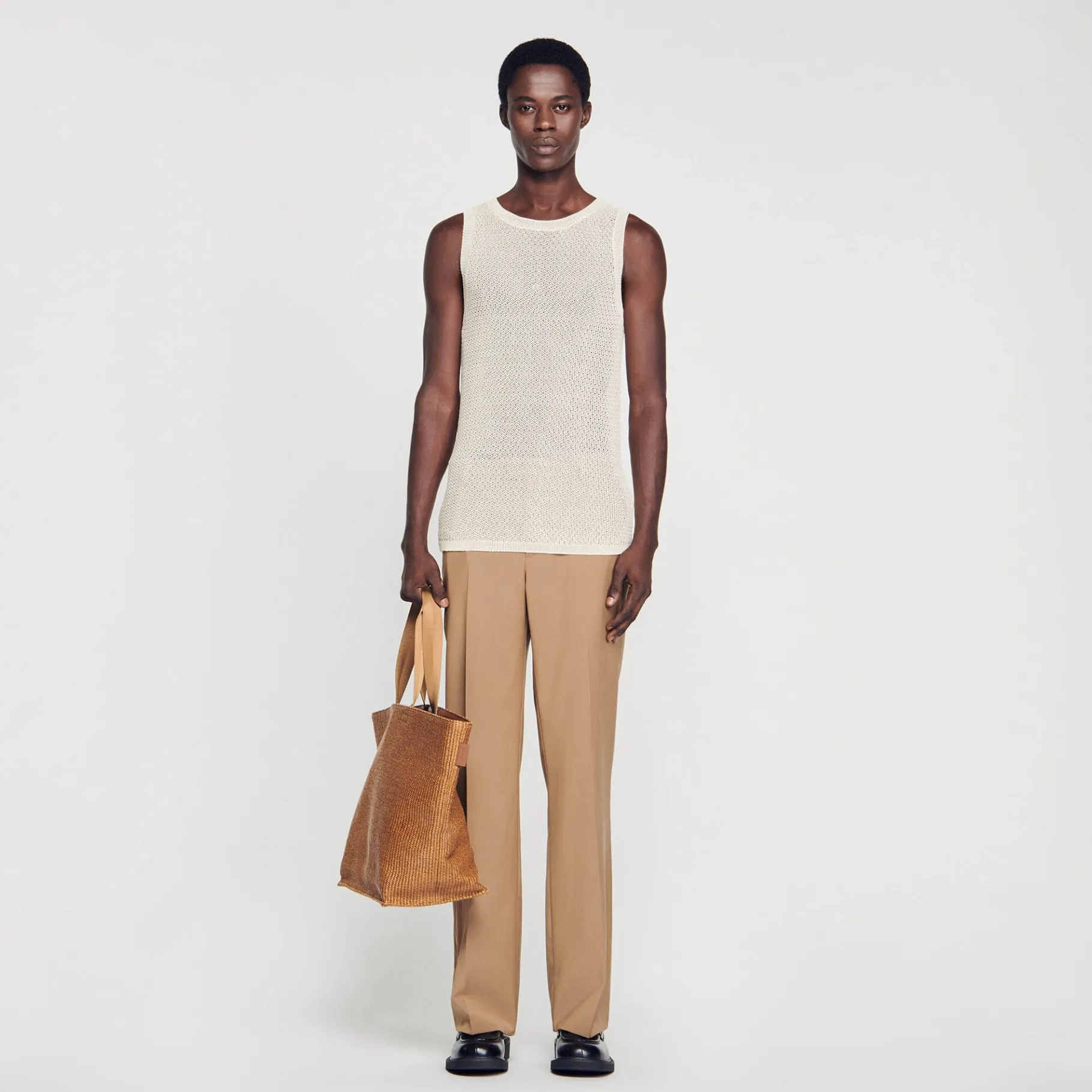 Camisola Sem Mangas Em Malha Perfurada Ligeiramente Brilhante, Com Decote Redondo E Orlas Finamente Caneladas.