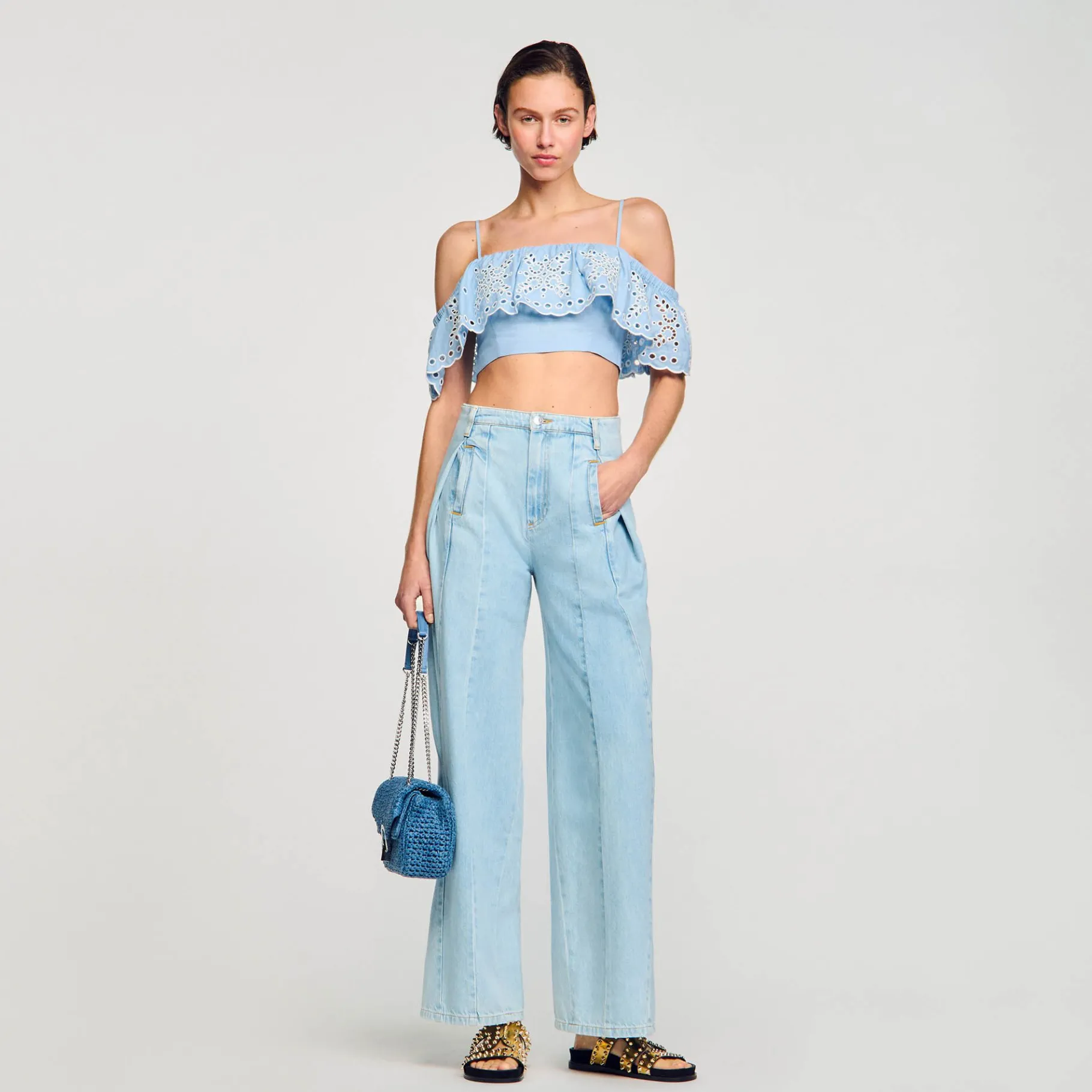 Top Cropped Com Alças Finas Ajustáveis, Babado Nos Ombros E Bordado Inglês Contrastante.