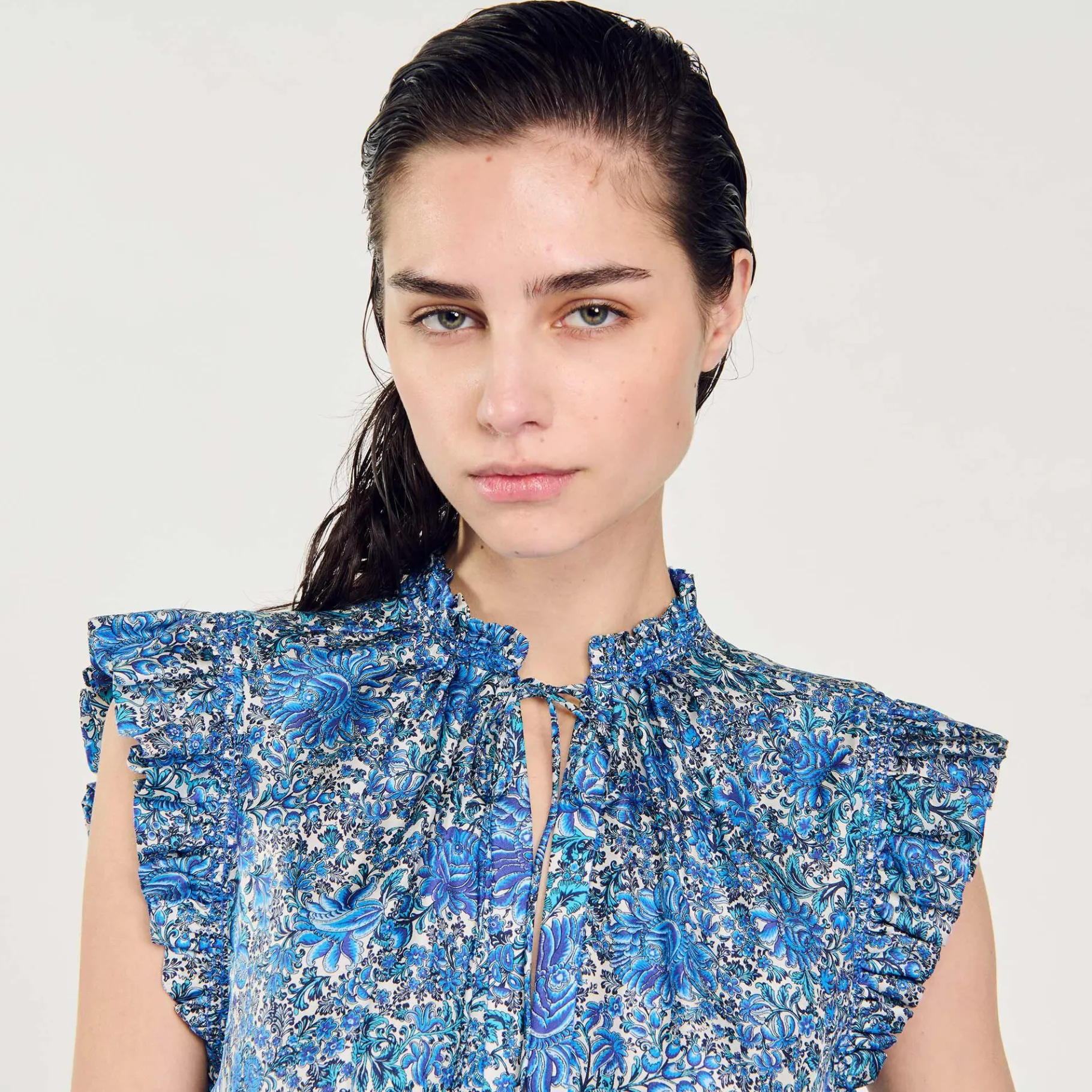 Top Fluido Com Estampa Floral, Decote Em V Com Alças E Mangas Franzidas.