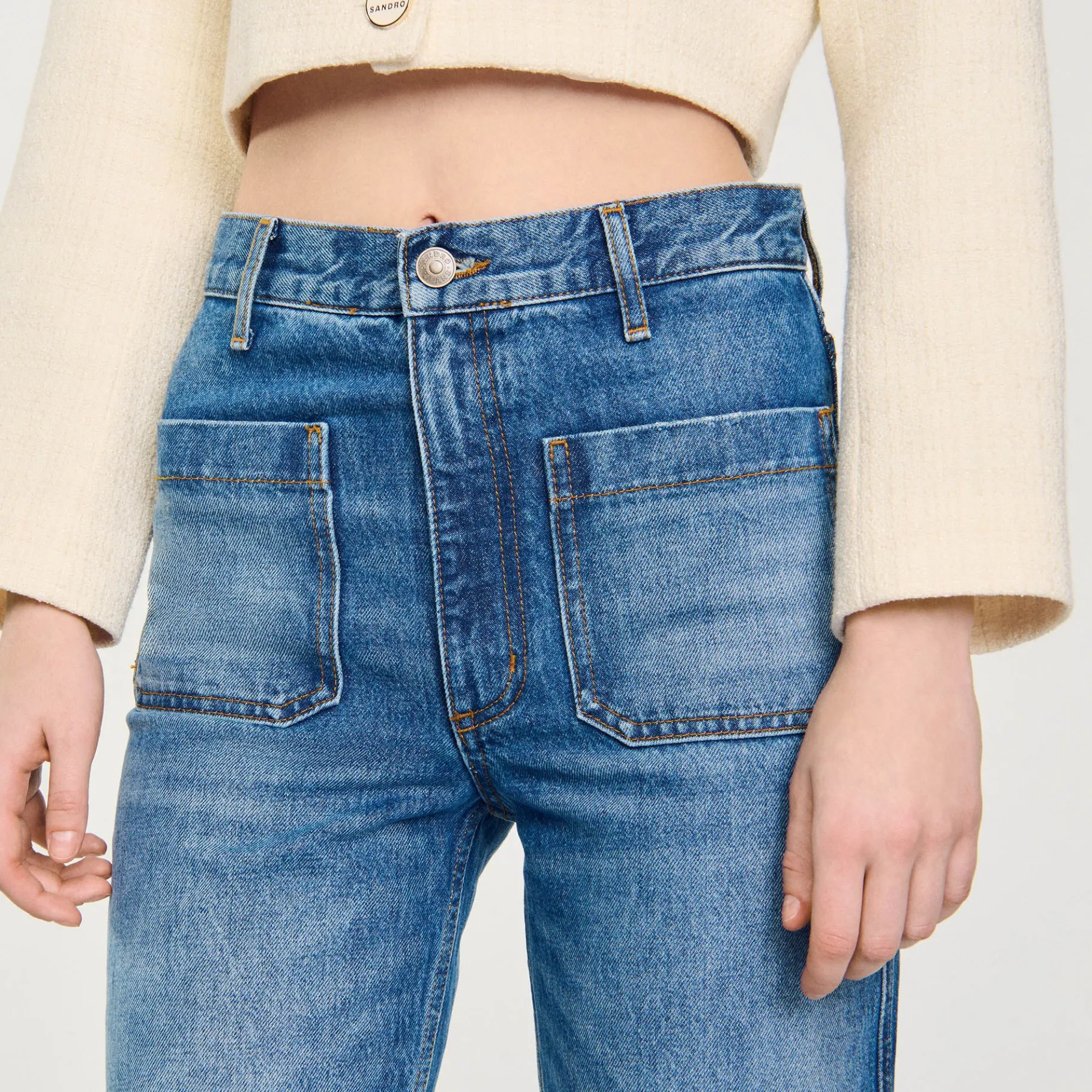 Sandro Está Comprometido Com Uma Moda Mais Responsável. Como Parte Do Nosso Projeto De Rastreabilidade Em Colaboração Com A Fairly Made, Reportamos Com Total Transparência A Origem, O Fabrico E O Impacto Ambiental Das Nossas Peças De Vestuário. Todas As Etapas De Alfaiataria E Produção Deste Jeans Foram Realizadas Em Türkiye. Foi Usado Algodão De Campos Cultivados Localmente.A Modelo Tem 177 Cm De Altura E Veste Tamanho 36