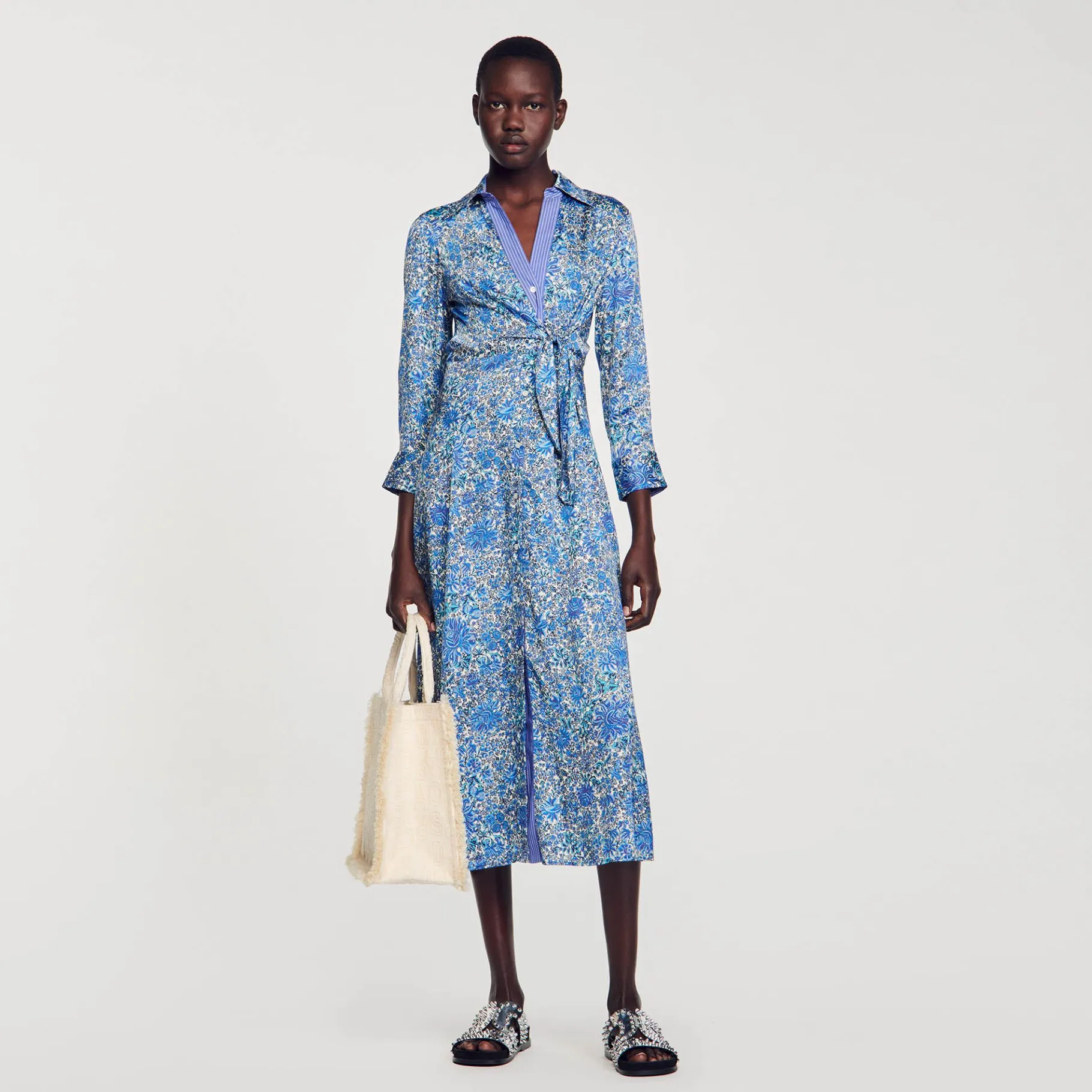Vestido Camisa Midi Em Cetim Com Estampa Floral, Gola Camisa, Manga Longa Com Punhos Abotoados E Alças Para Amarrar Nas Laterais.