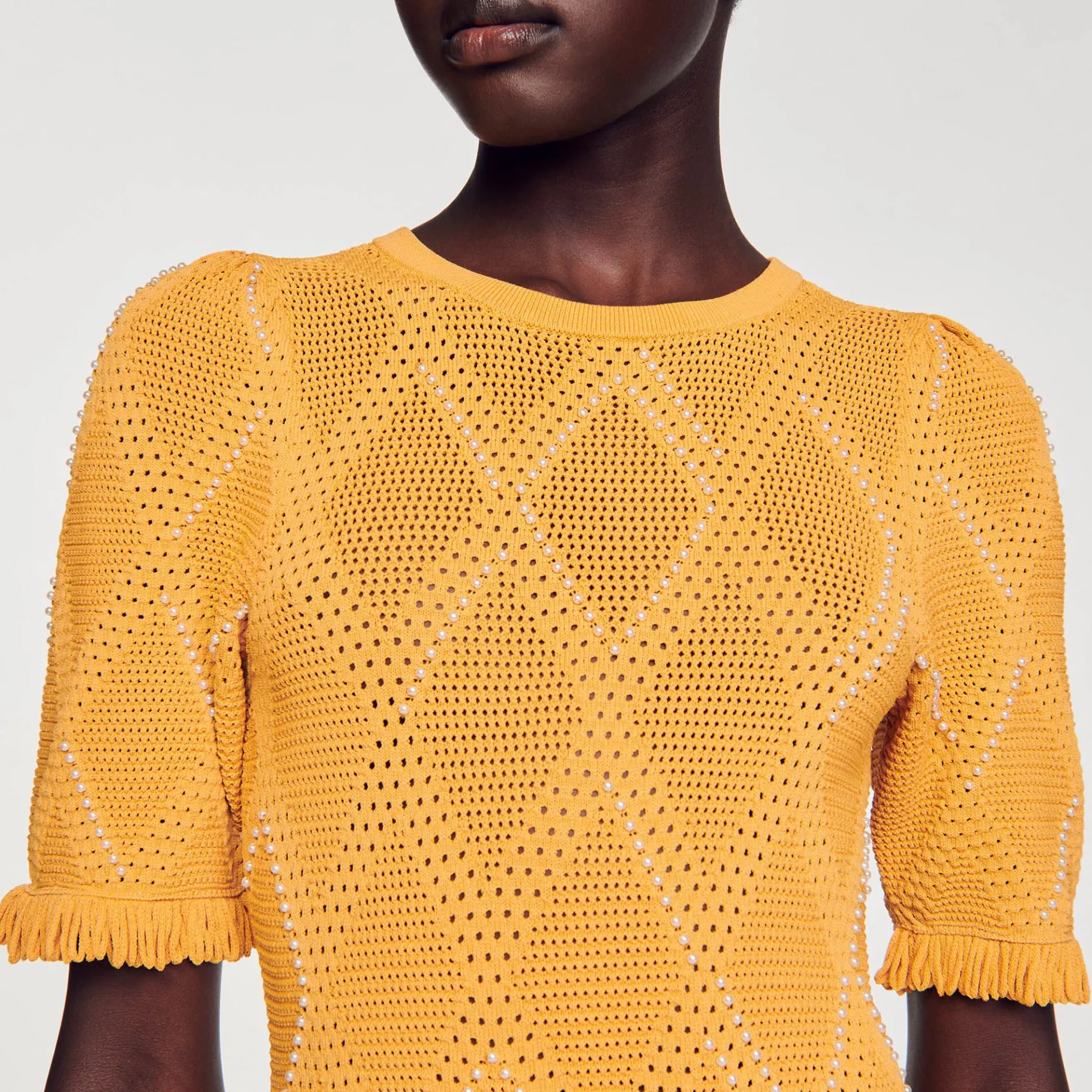 Vestido Curto Em Malha Texturizada Com Estampa De Diamantes Decorado Com Pérolas, Decote Redondo E Manga Curta Com Franjas.