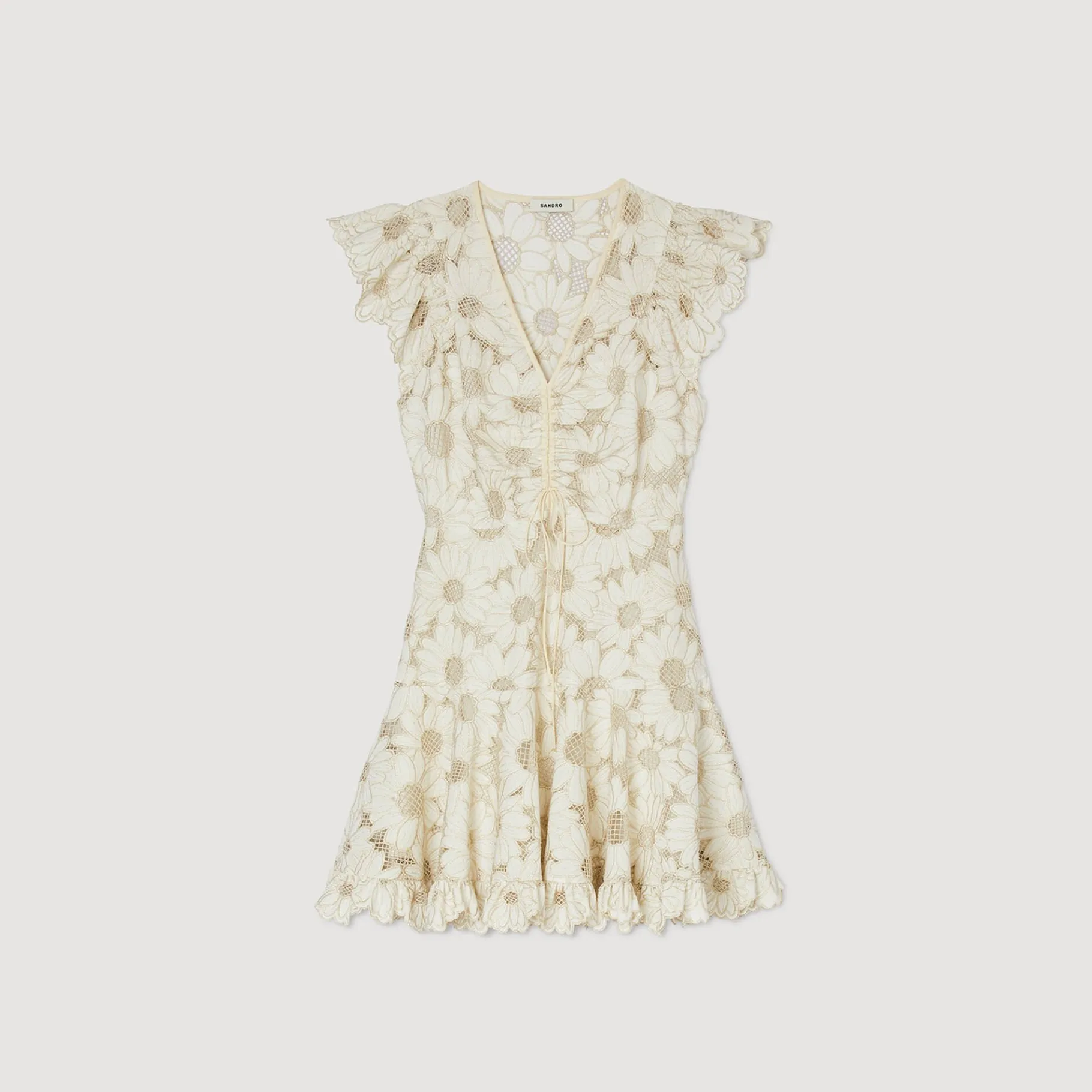 Vestido Curto Em Guipura Com Margaridas, Decote Em V Com Fitas Ajustáveis, Manga Curta E Bainha Larga E Recortada Com Folhos.