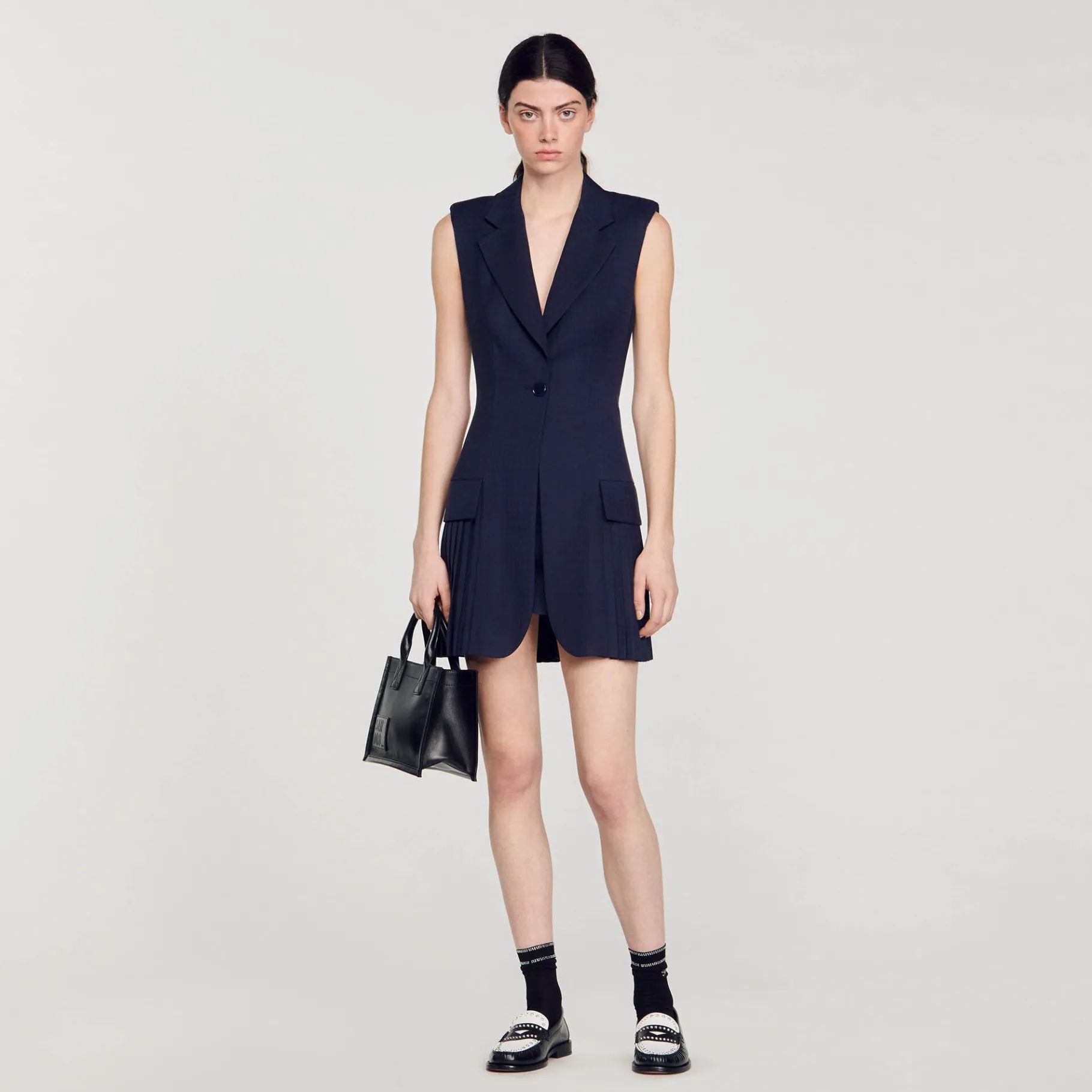 Vestido Curto Estilo Paletó Sem Mangas, Gola Sob Medida Com Lapelas Em V, Fecho De Um Botão, Bolsos Com Aba E Saia Plissada.
