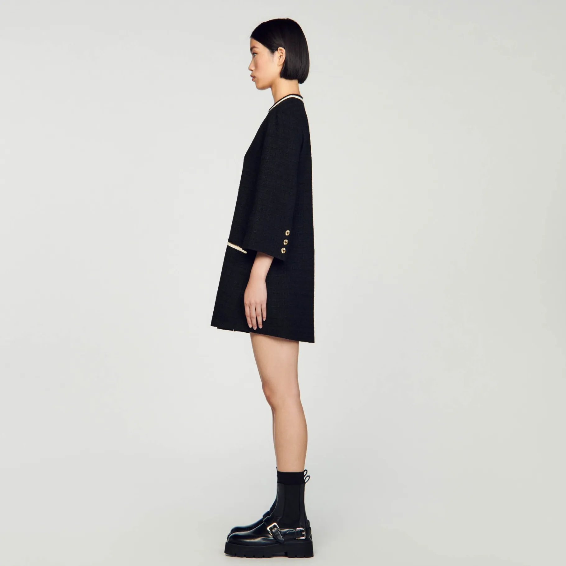 Vestido Evasê De Tweed Com Decote Redondo E Mangas Largas, Decorado Com Trança Contrastante Na Bainha E Nos Bolsos, E Carcela De Botões Dourados Com Duplo S.