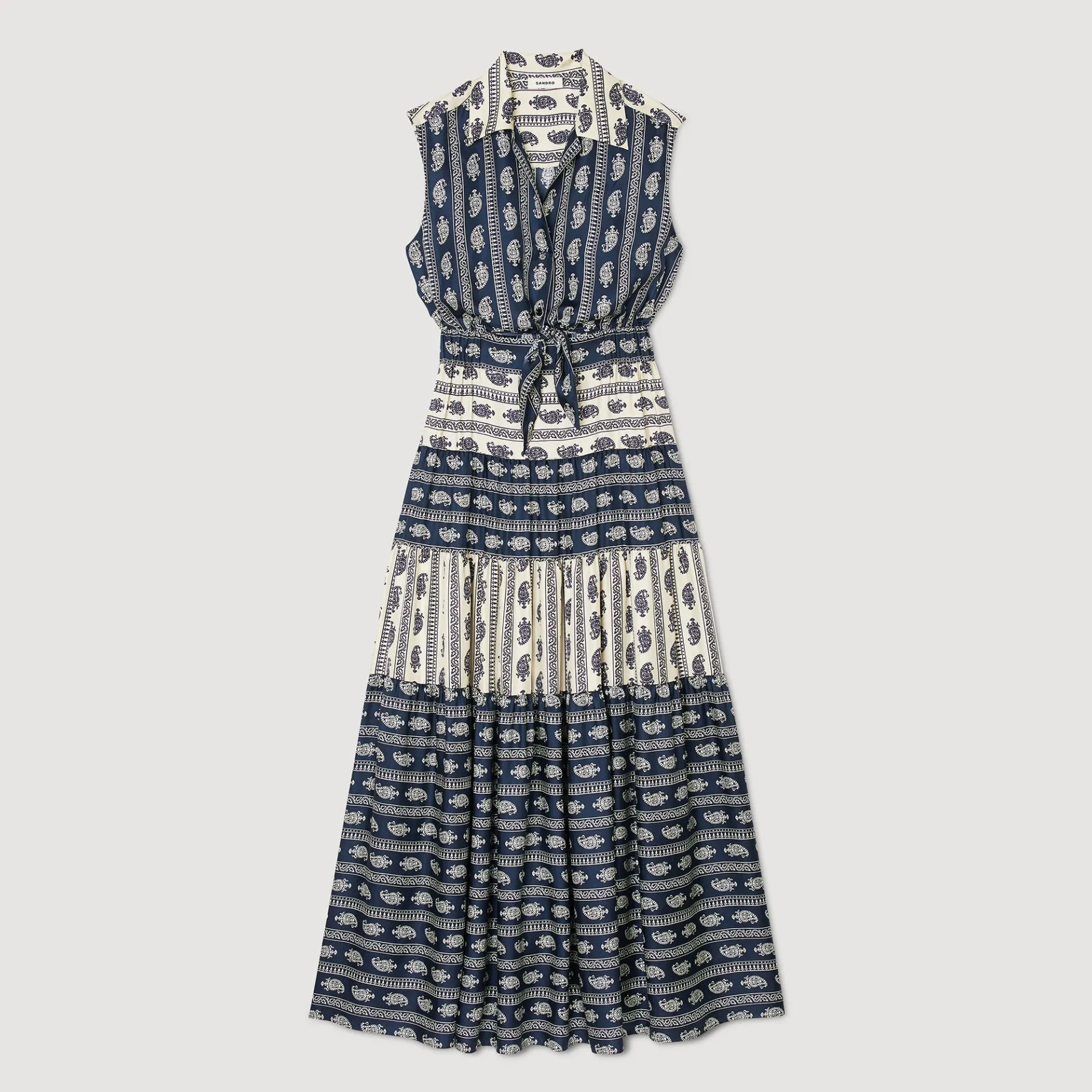 Vestido Longo Sem Mangas Com Top Tipo Camisa Com Abertura, Botões E Laço Na Frente, Saia Larga E Estampa Paisley.
