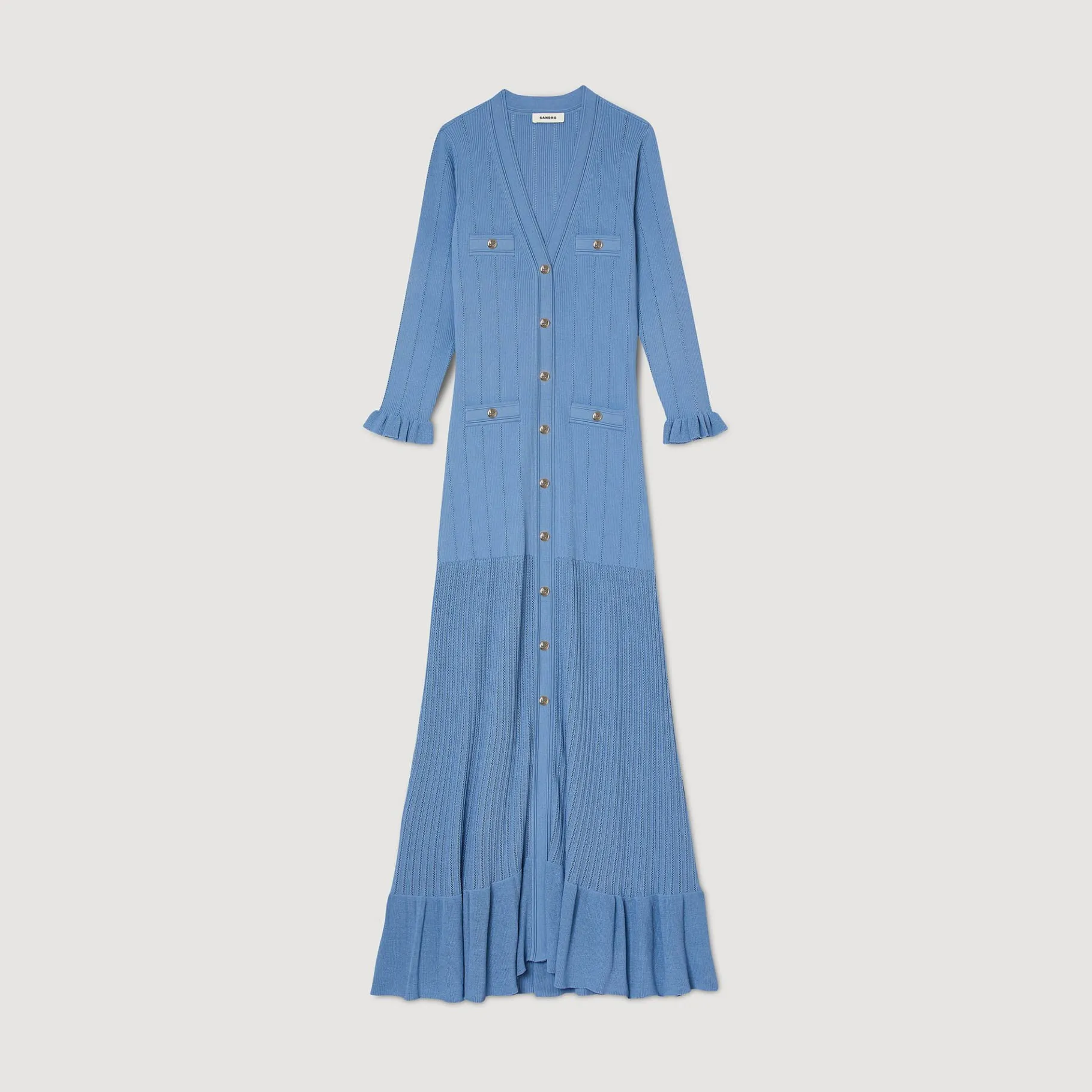 Vestido Longo De Manga Comprida Com Punhos Franzidos E Decote Em V Em Malha, Com Botões Dourados E Folho Na Parte Inferior Da Saia.