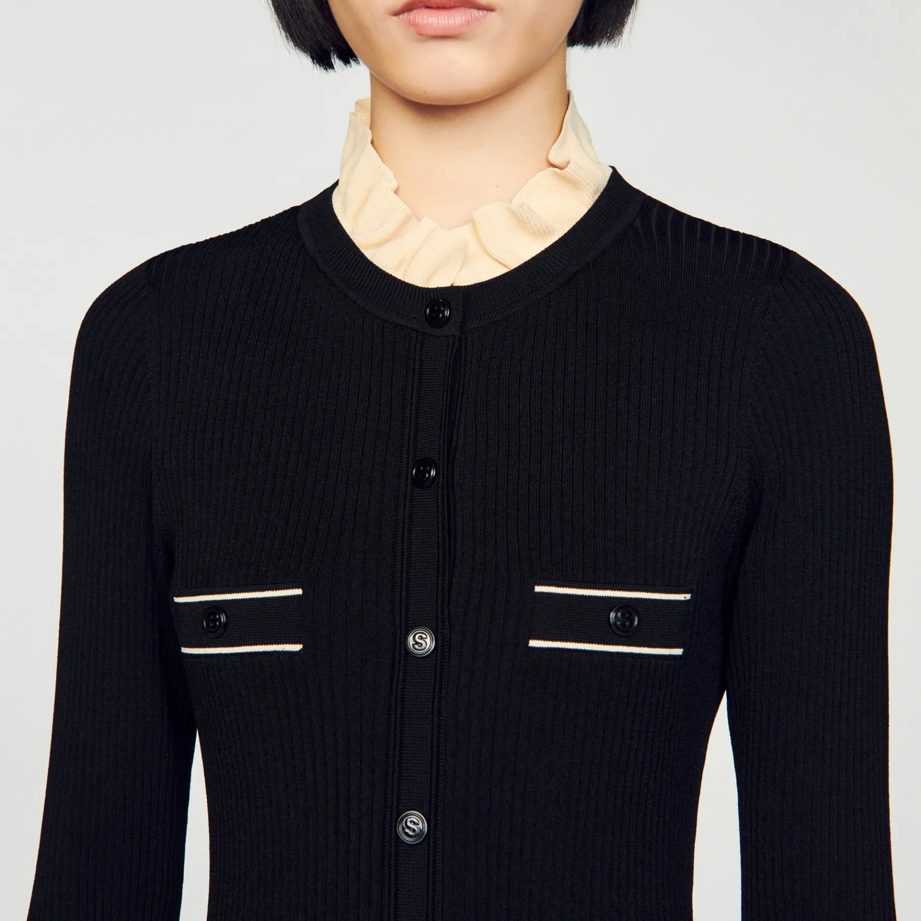 Vestido Longo De Malha Canelada Com Corte Muito Justo, Gola Alta Com Babados Contrastantes, Mangas Compridas, Bolsos Falsos Contrastantes E Fecho De Botão Elegante.