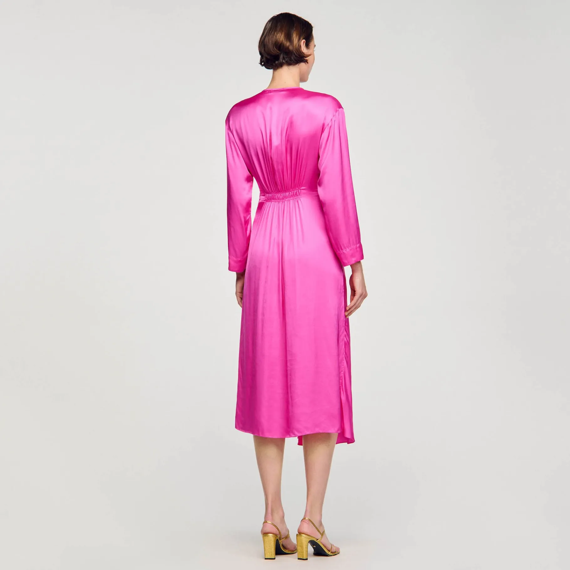 Vestido Longo Fluido E Em Cetim Com Decote Em V Drapeado E Franzido, Manga Comprida E Costas Franzidas.