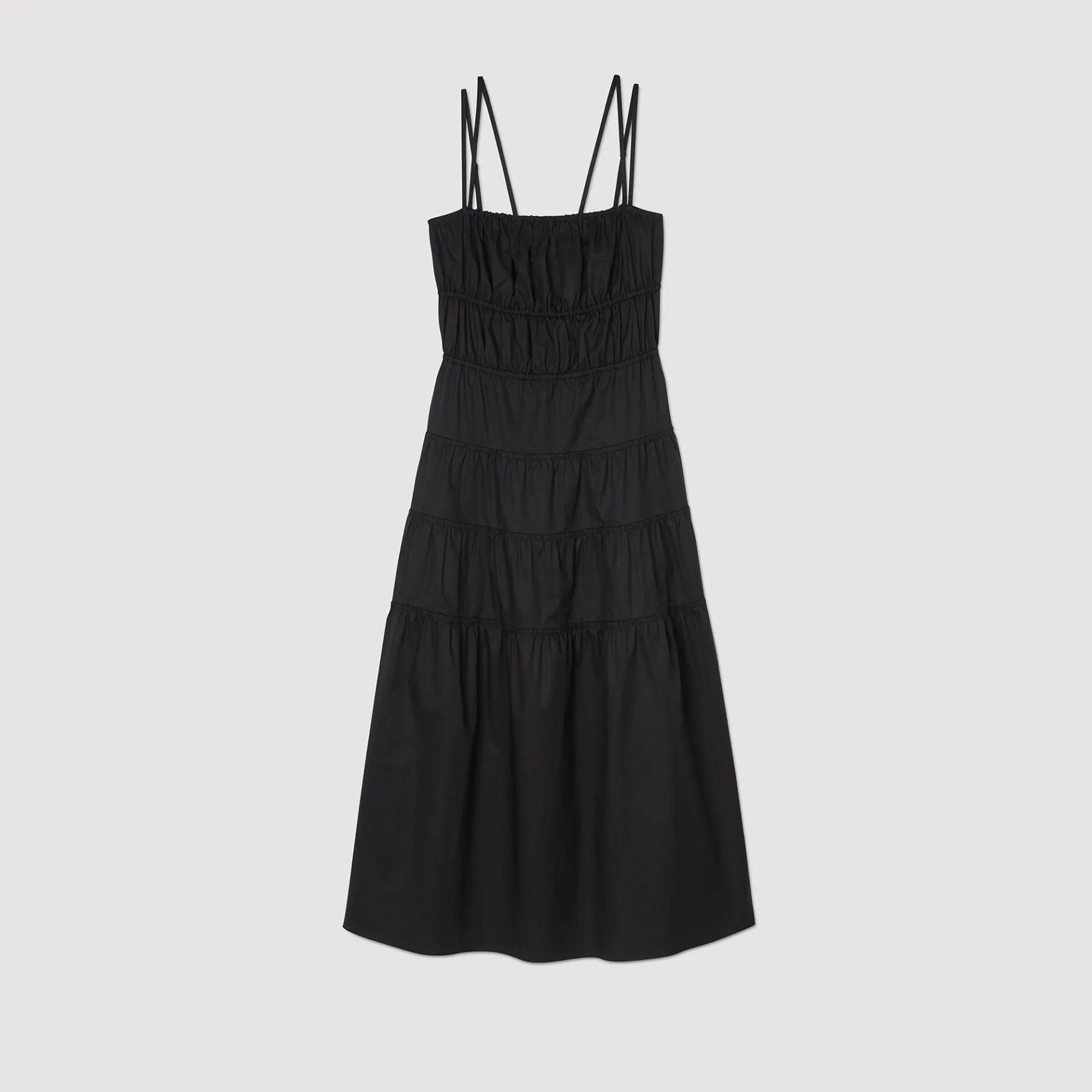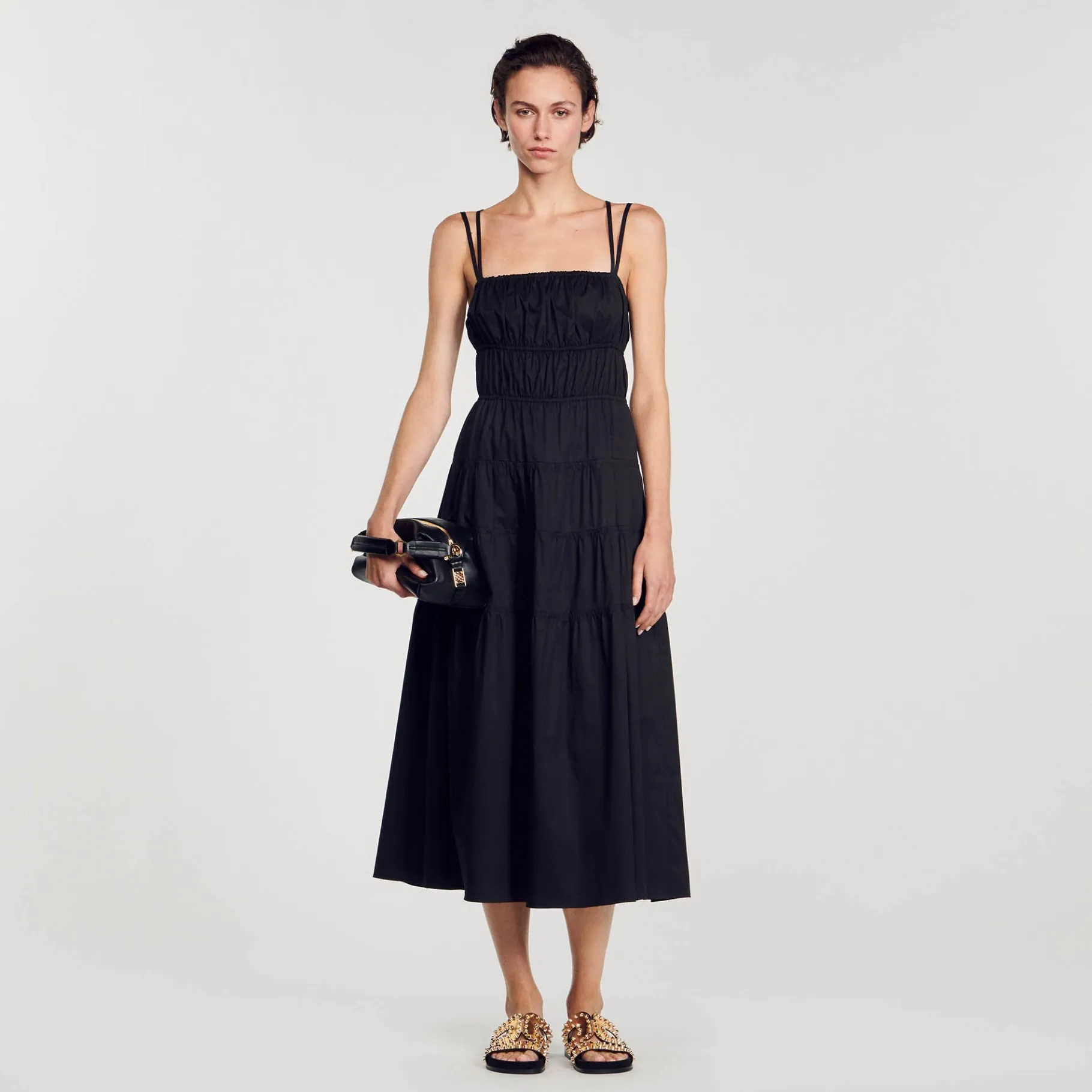 Vestido Midi De Algodão Com Elástico Franzido, Alças Duplas, Decote Reto E Saia Rodada.