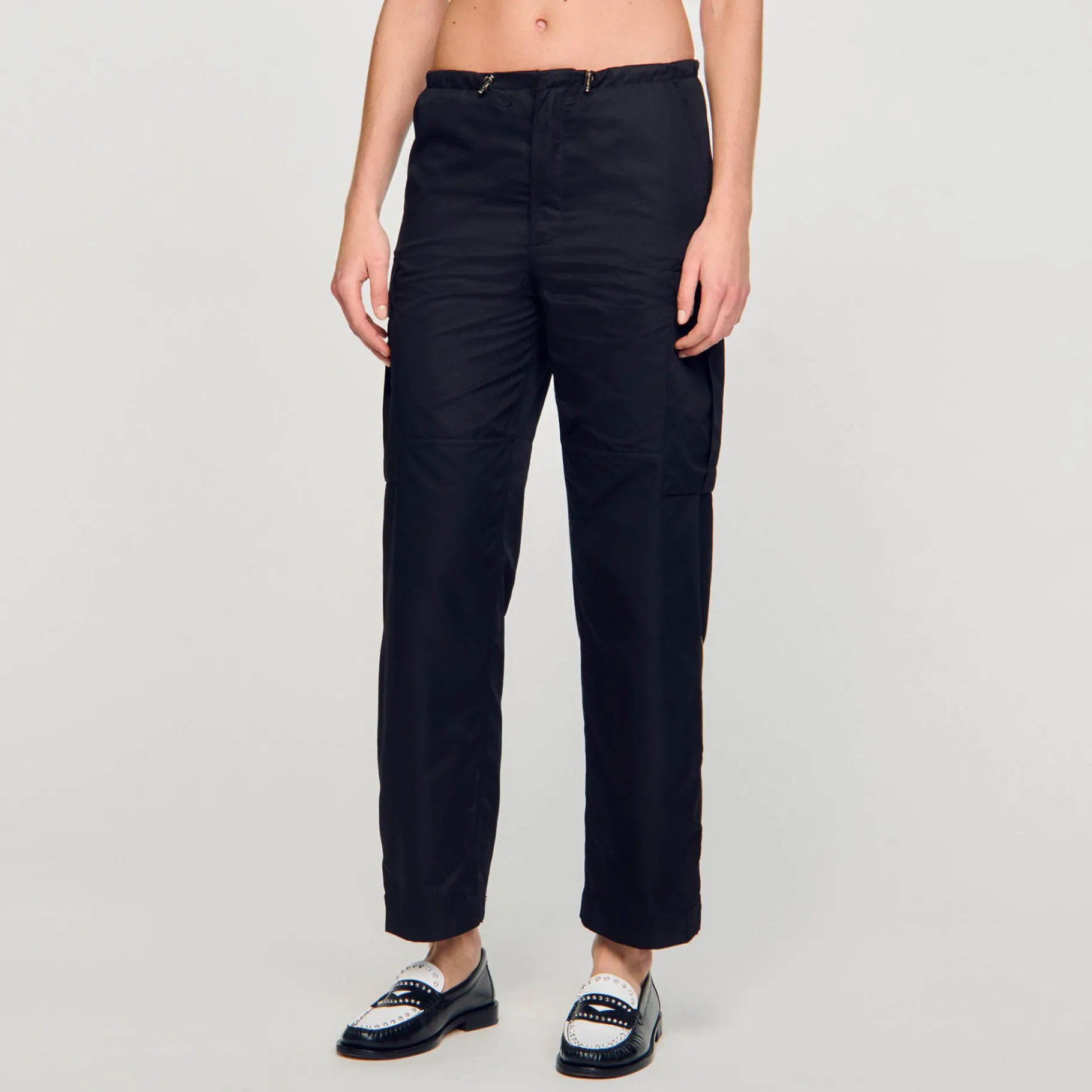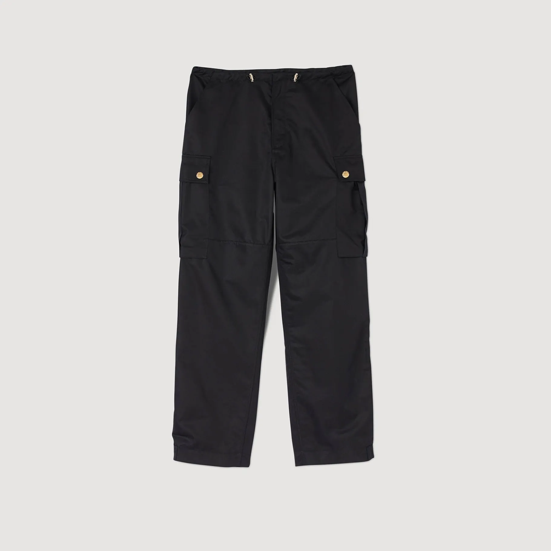 Calças Cargo Em Mistura De Algodão Com Cós Elástico Franzido Com Rolhas, Botões De Pressão Com Iniciais E Aberturas Com Zíper Na Bainha.