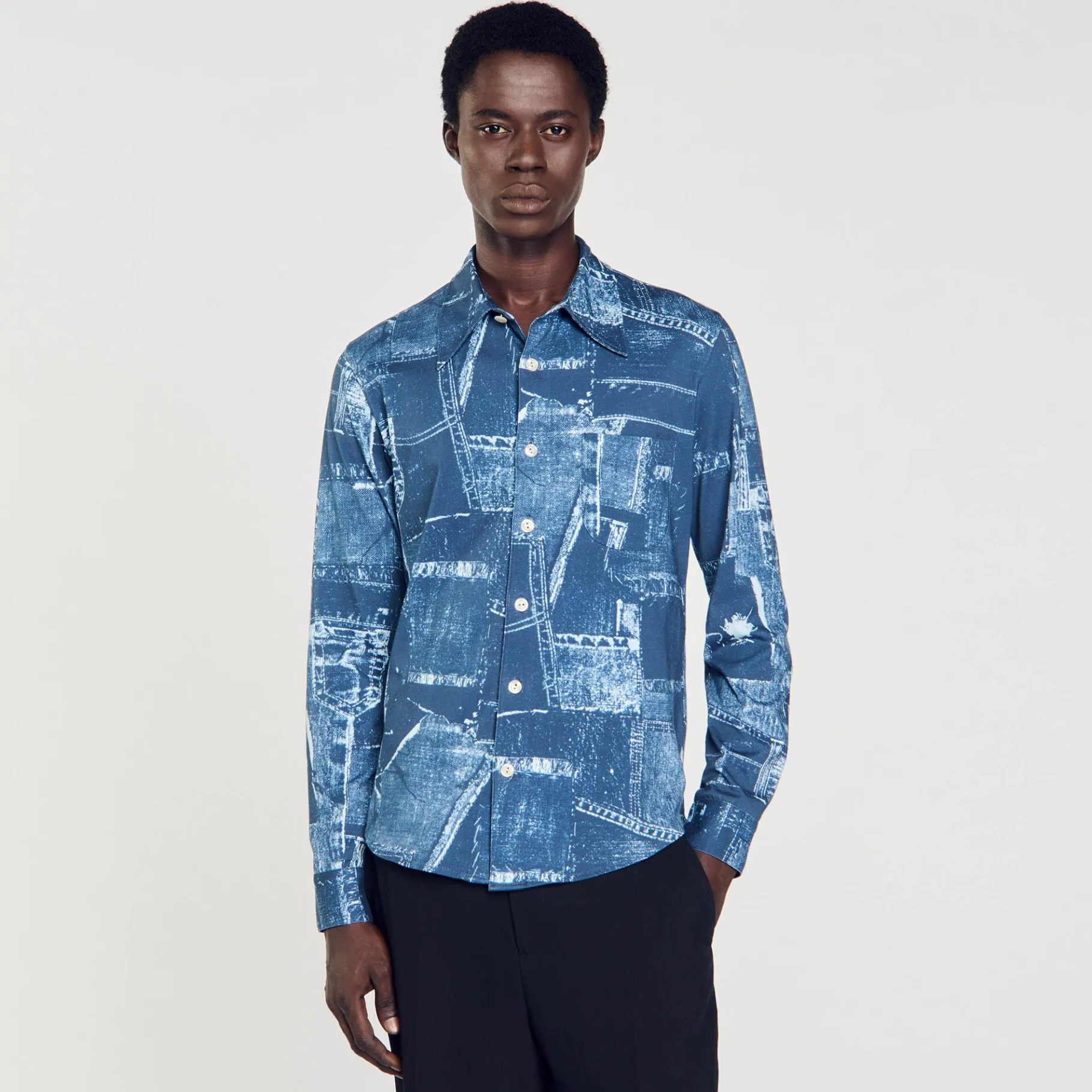 Camisa De Algodão Com Gola Clássica, Manga Comprida, Fecho De Botão E Detalhe De Estampa Patchwork.