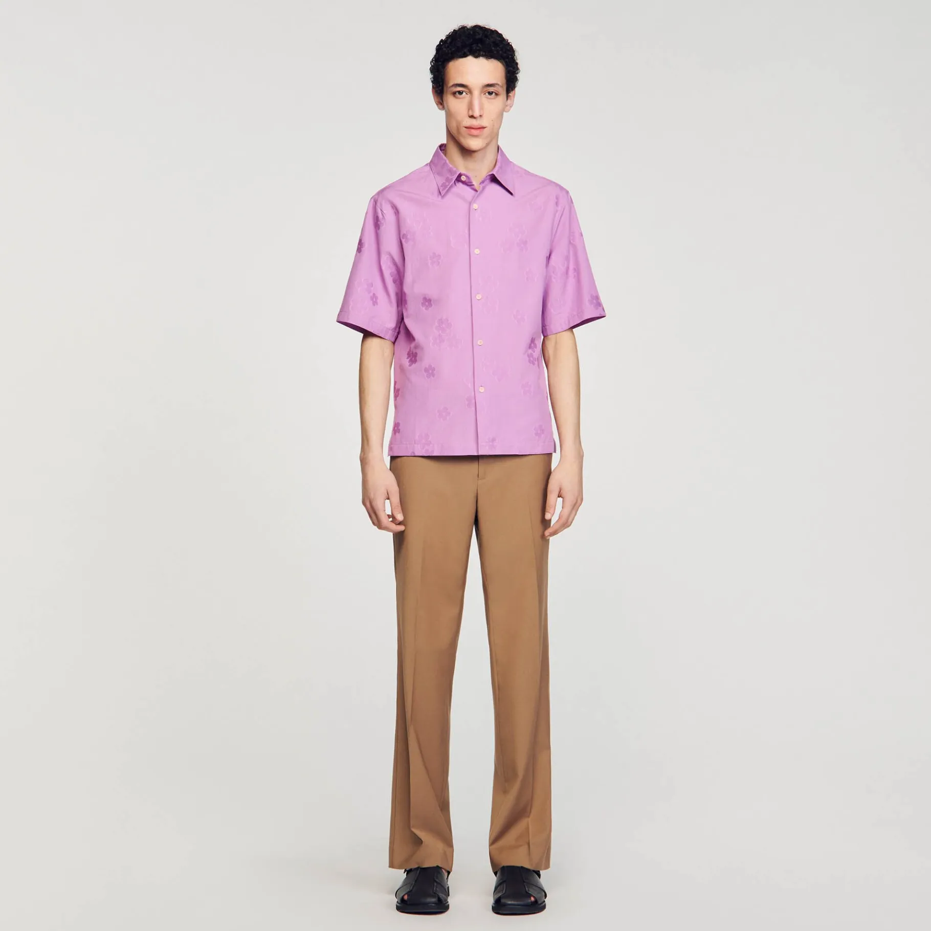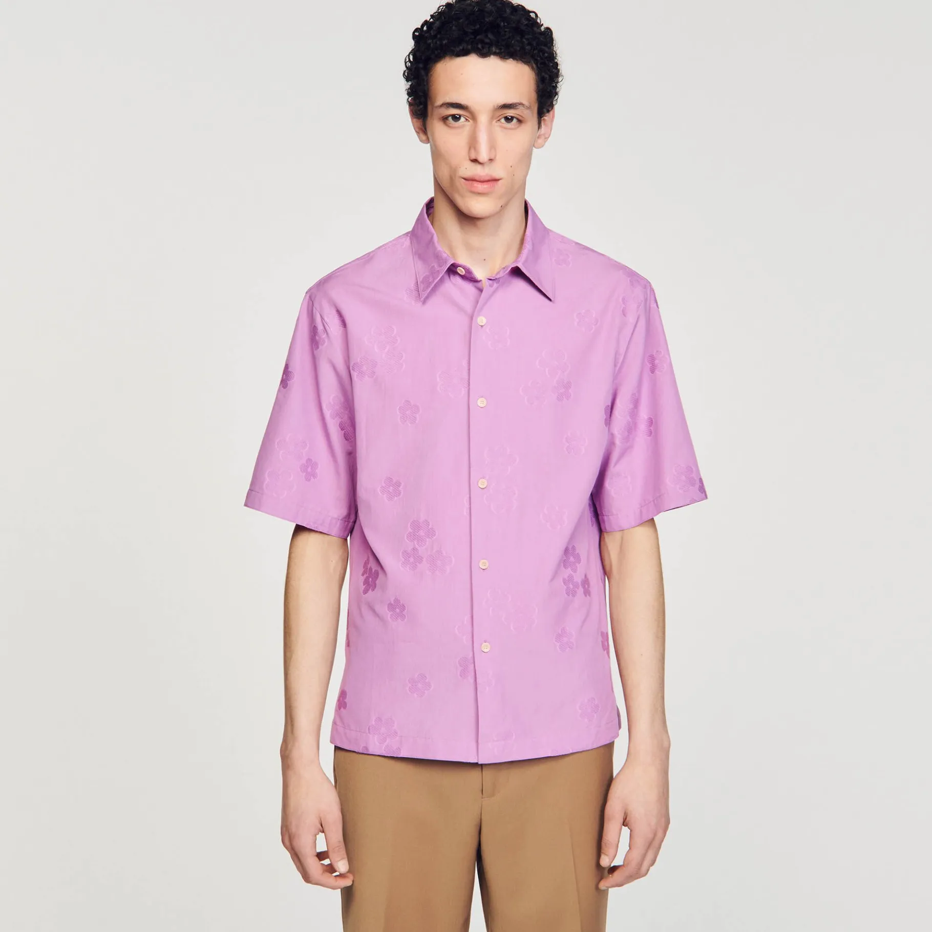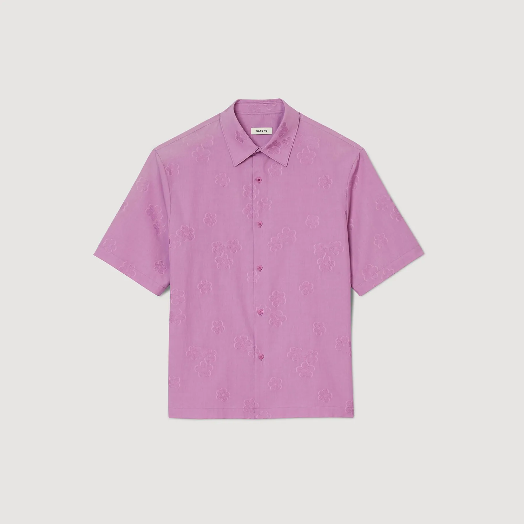 Camisa Oversized De Algodão Com Jacquard Floral, Gola, Manga Curta E Fecho De Botão.