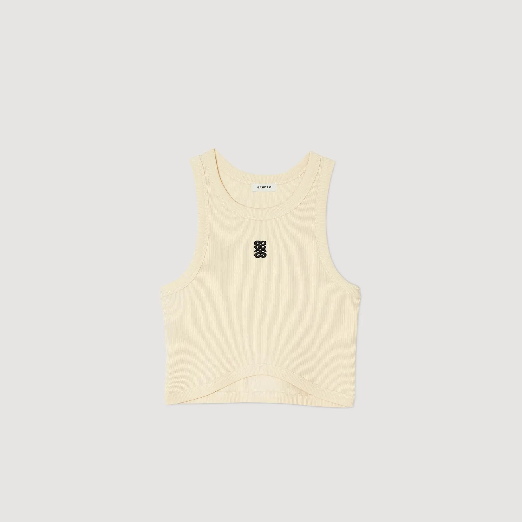 Regata Recortada Em Malha Canelada, Com Decote Redondo E Detalhe De Bordado Duplo S Contrastante.