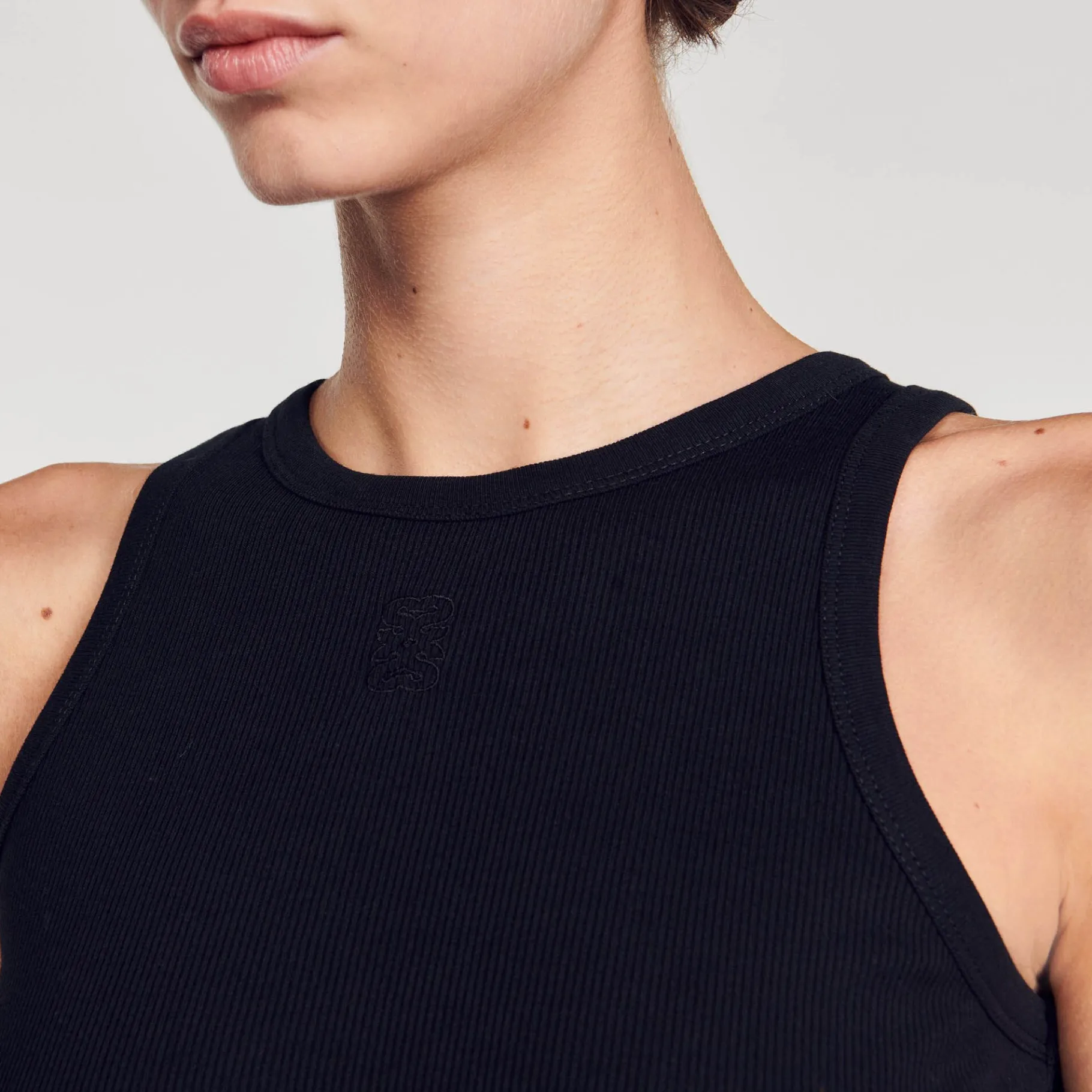 T-Shirt Sem Mangas Com Decote Redondo, Cavas Americanas E Pormenor Bordado No Peito.