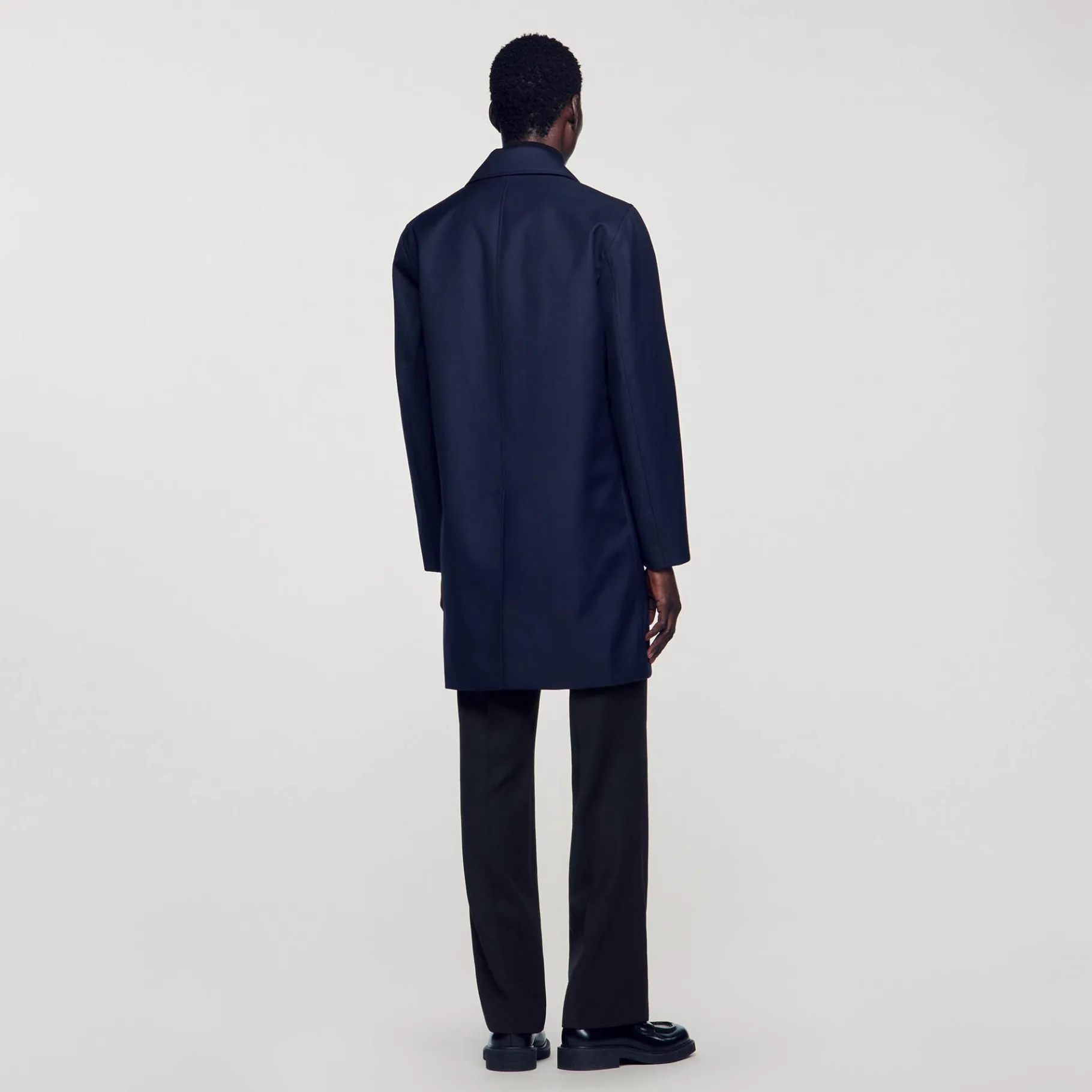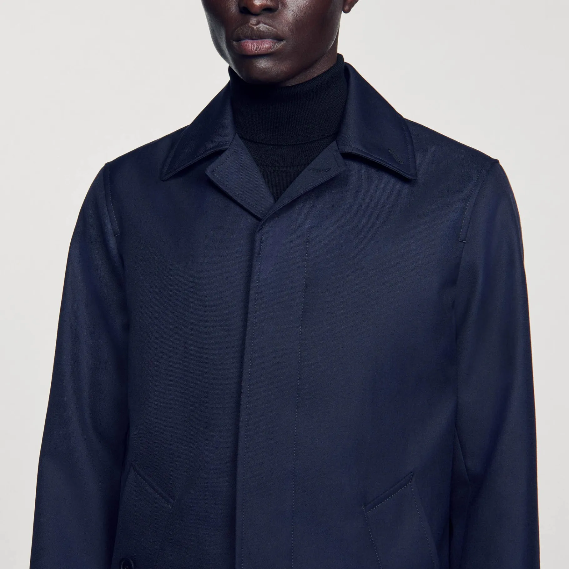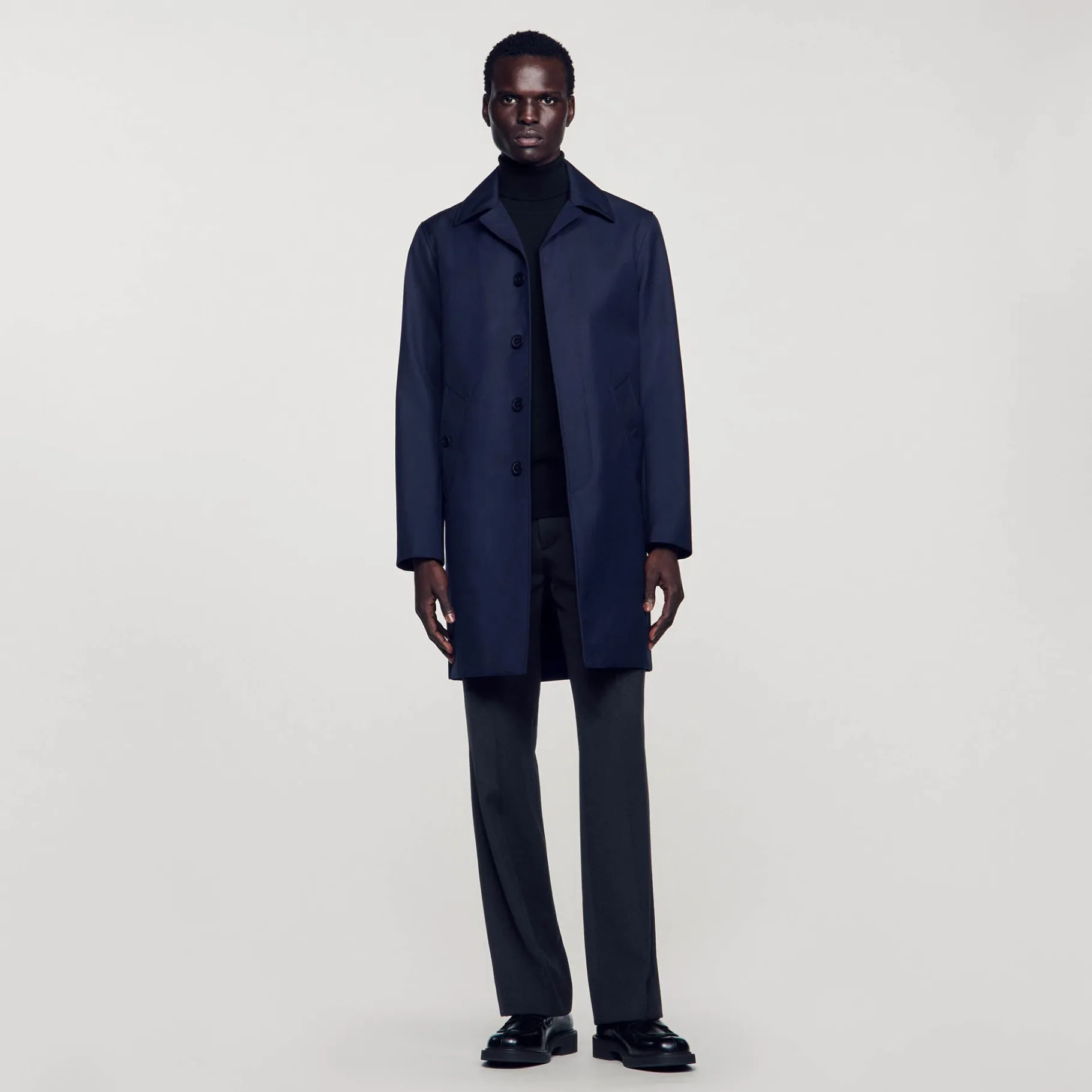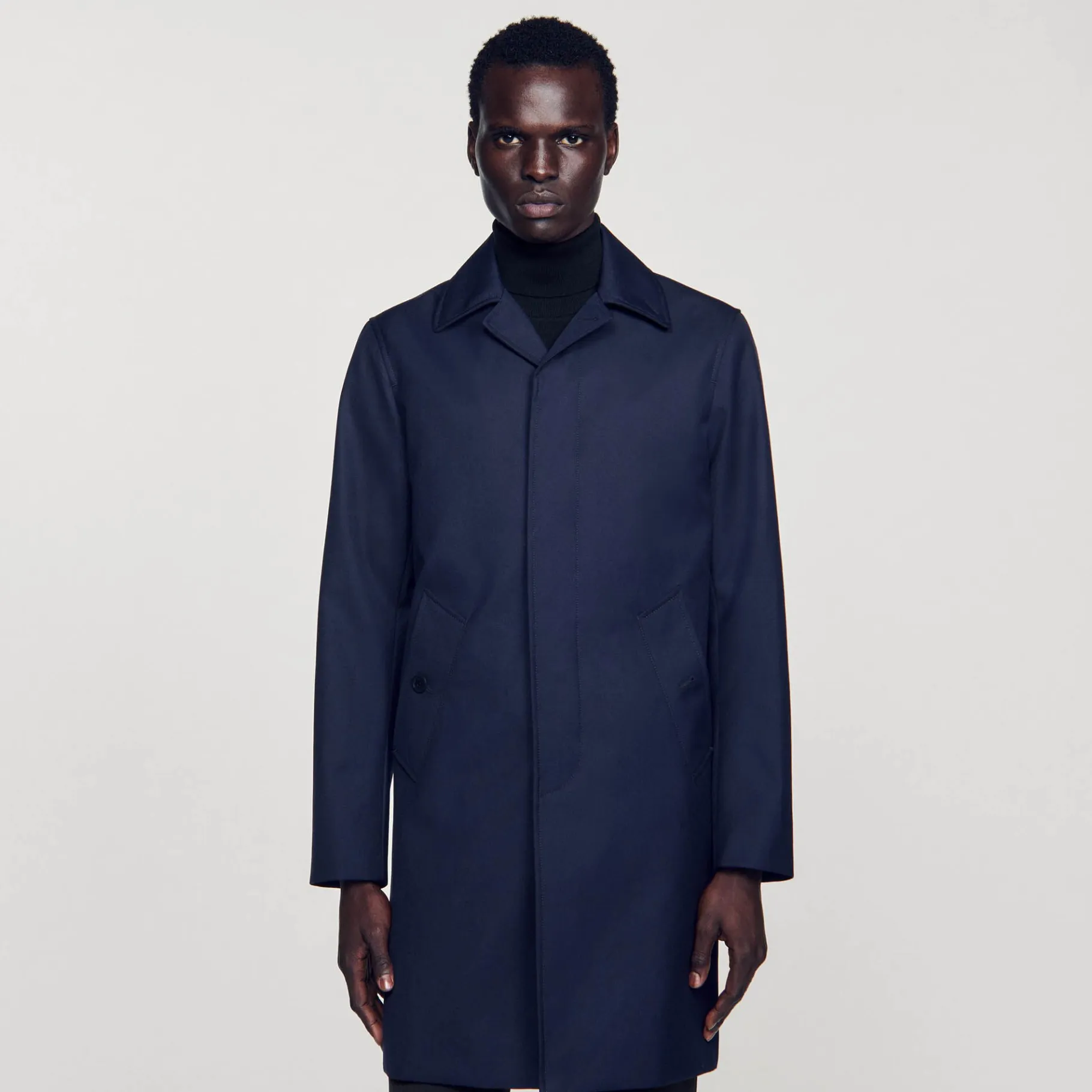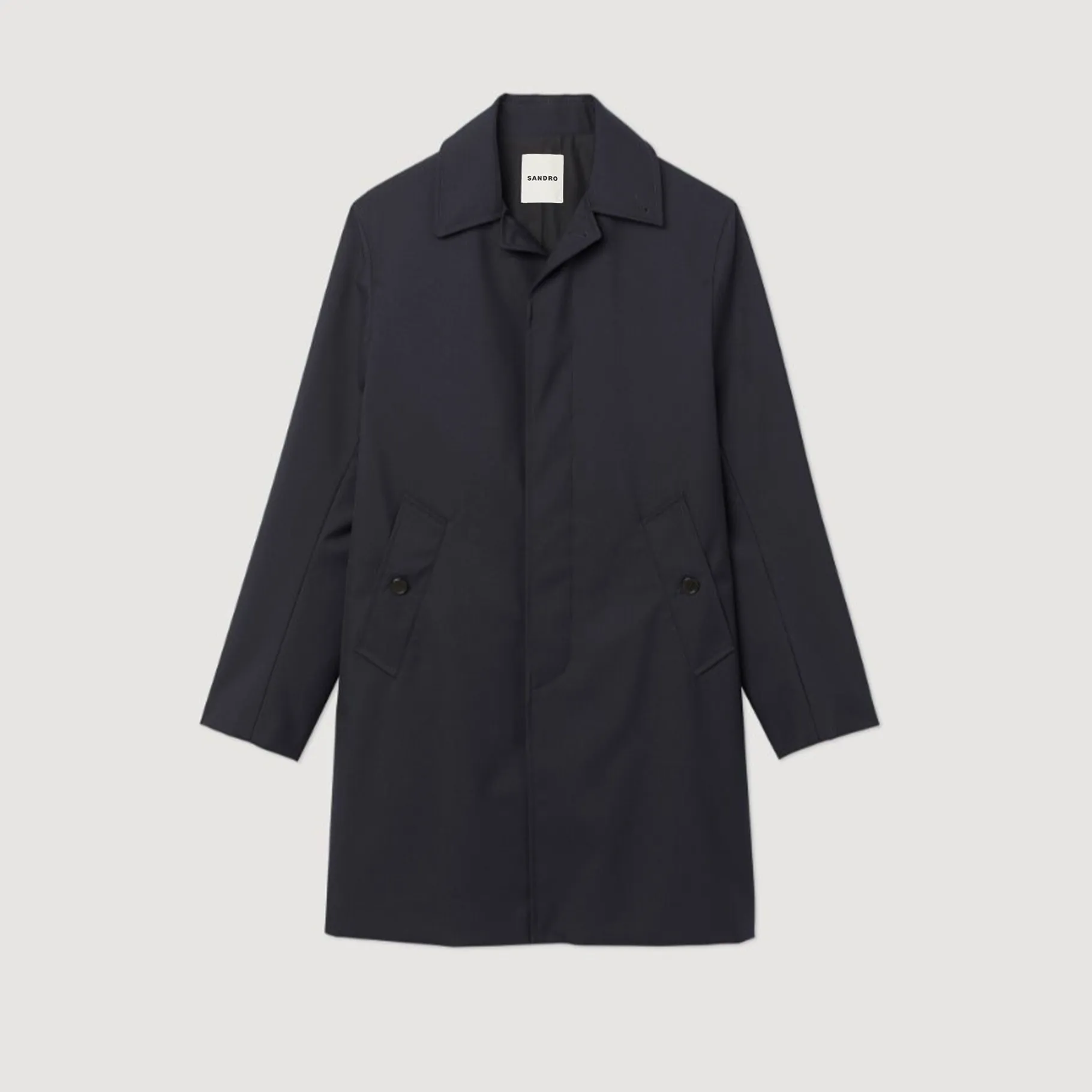 Capa De Chuva Em Tecido Técnico Com Manga Comprida, Gola De Lapela, Fecho De Carcela Forrada Com Botões E Bolsos Diagonais.