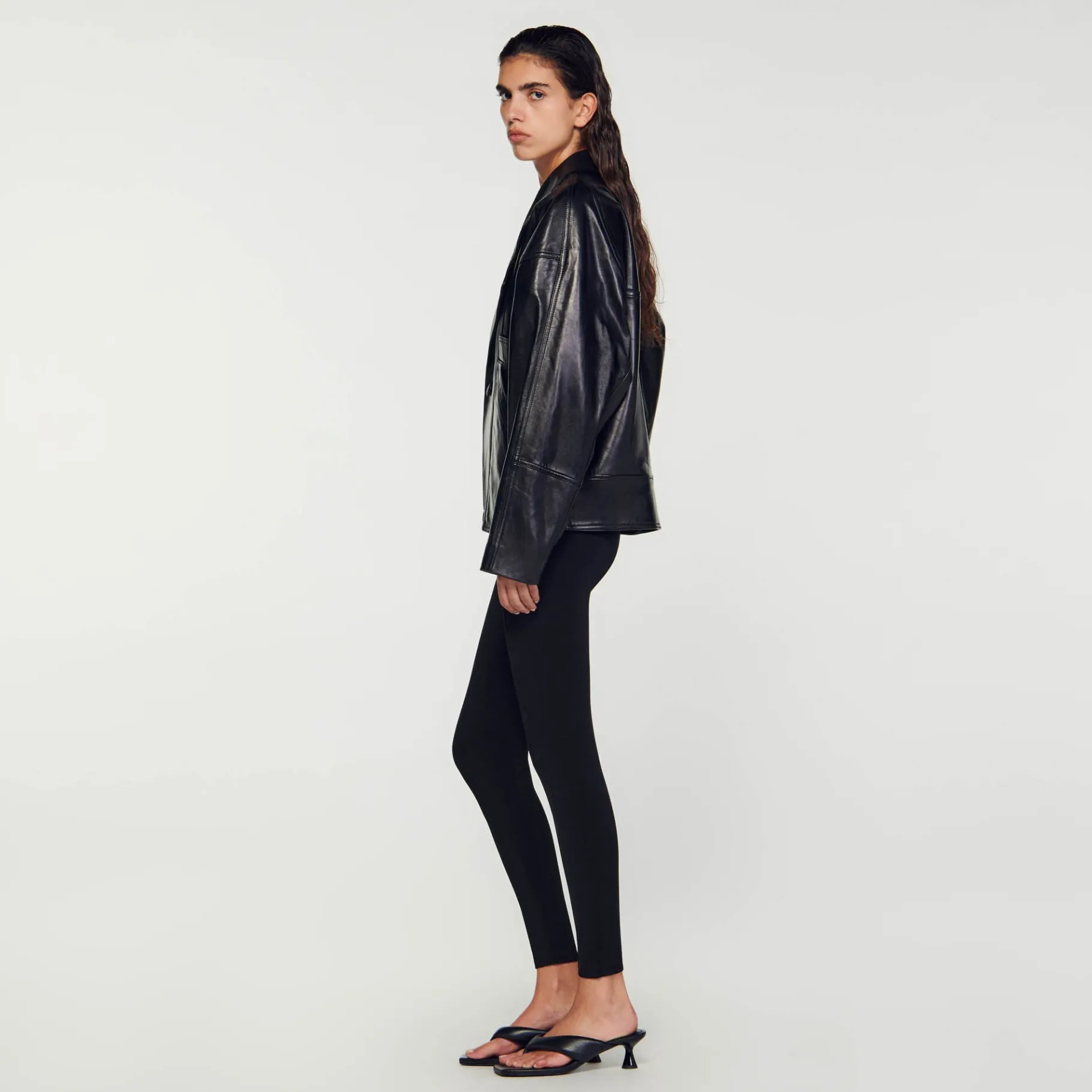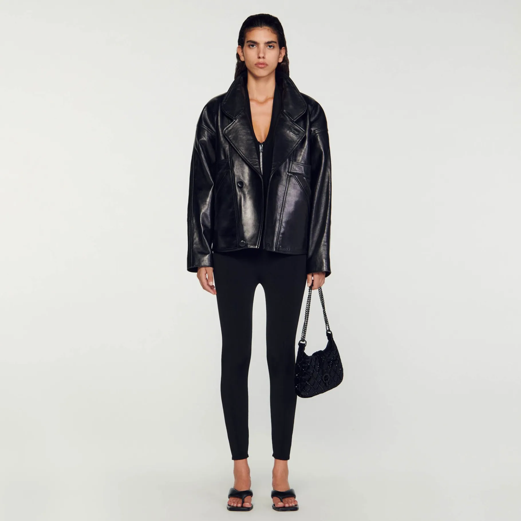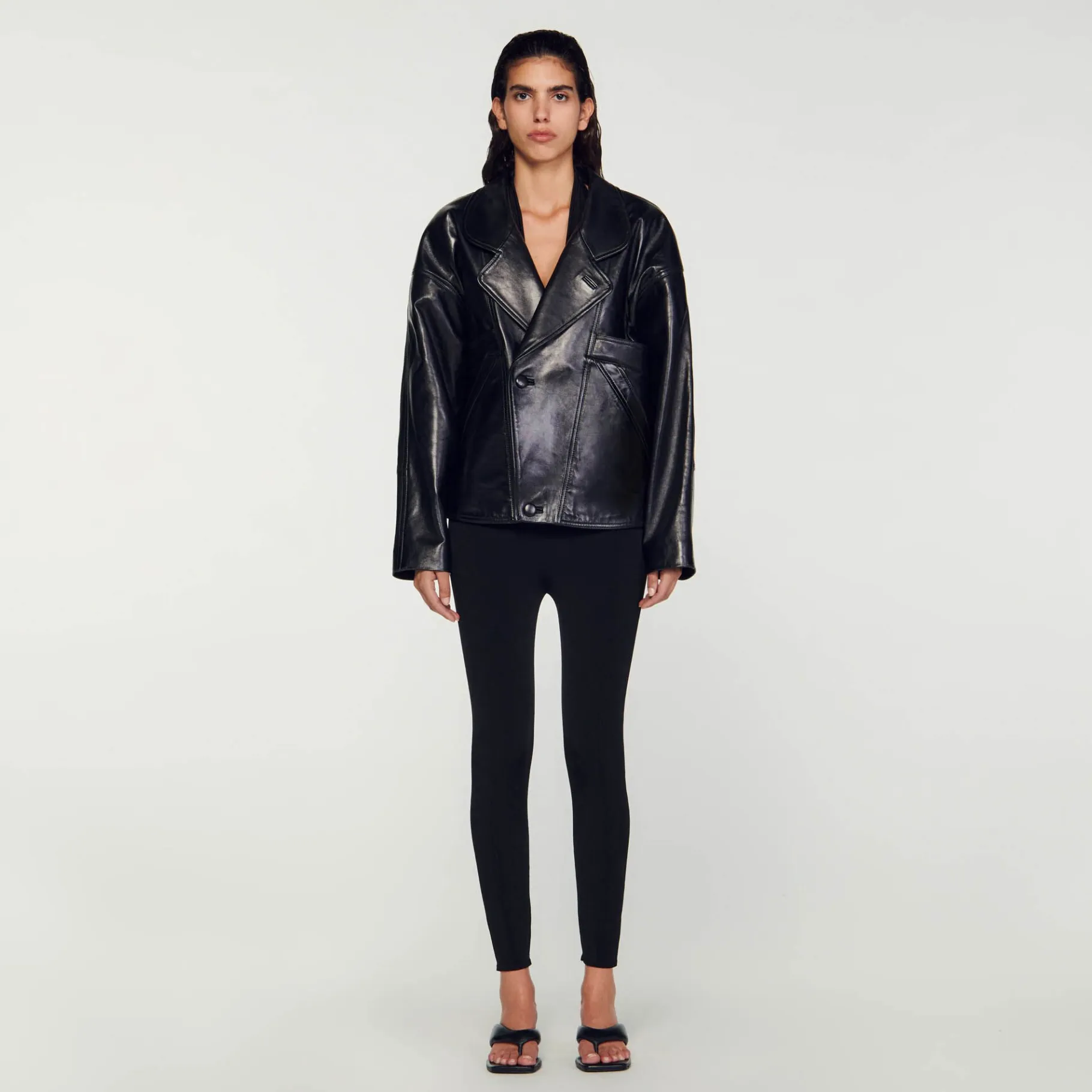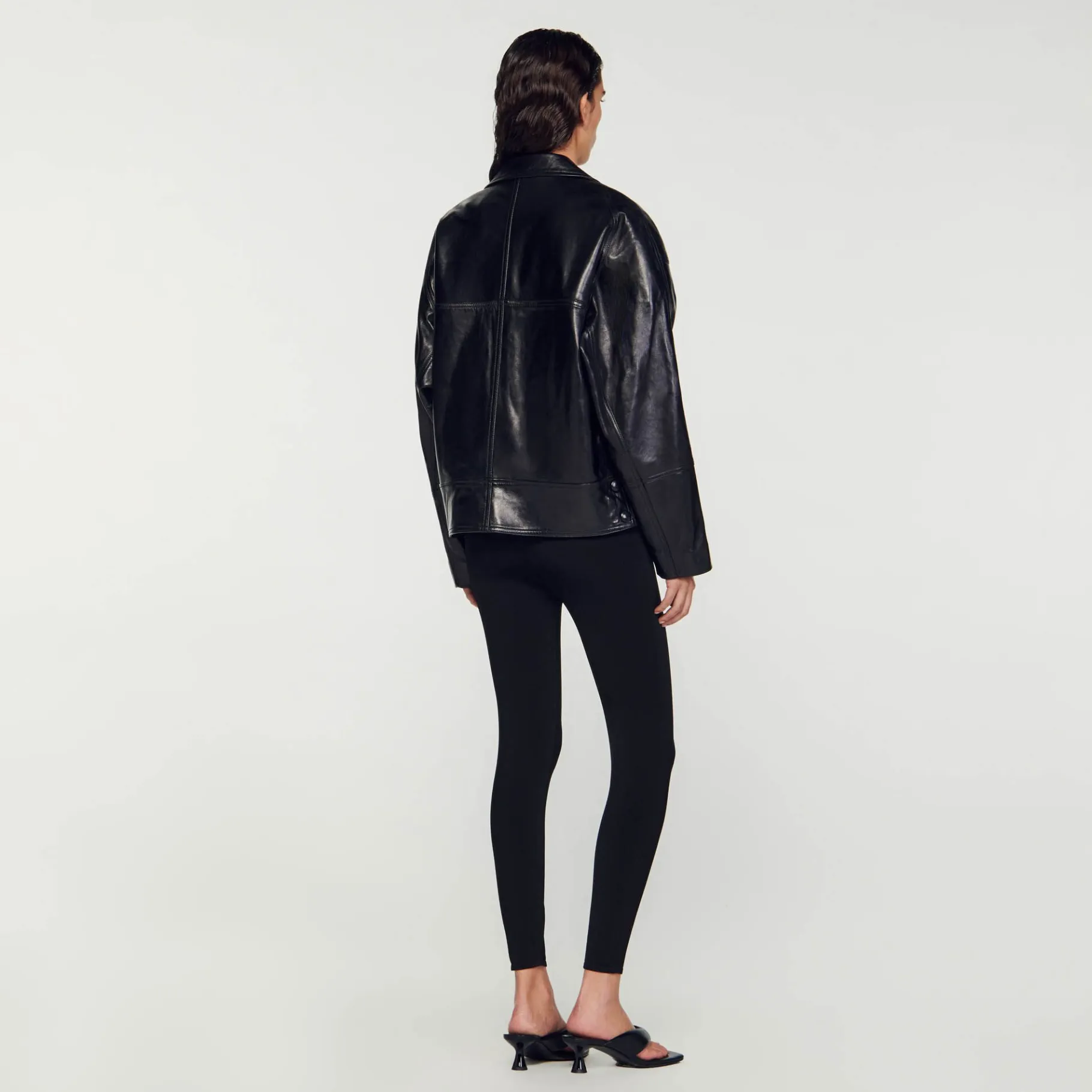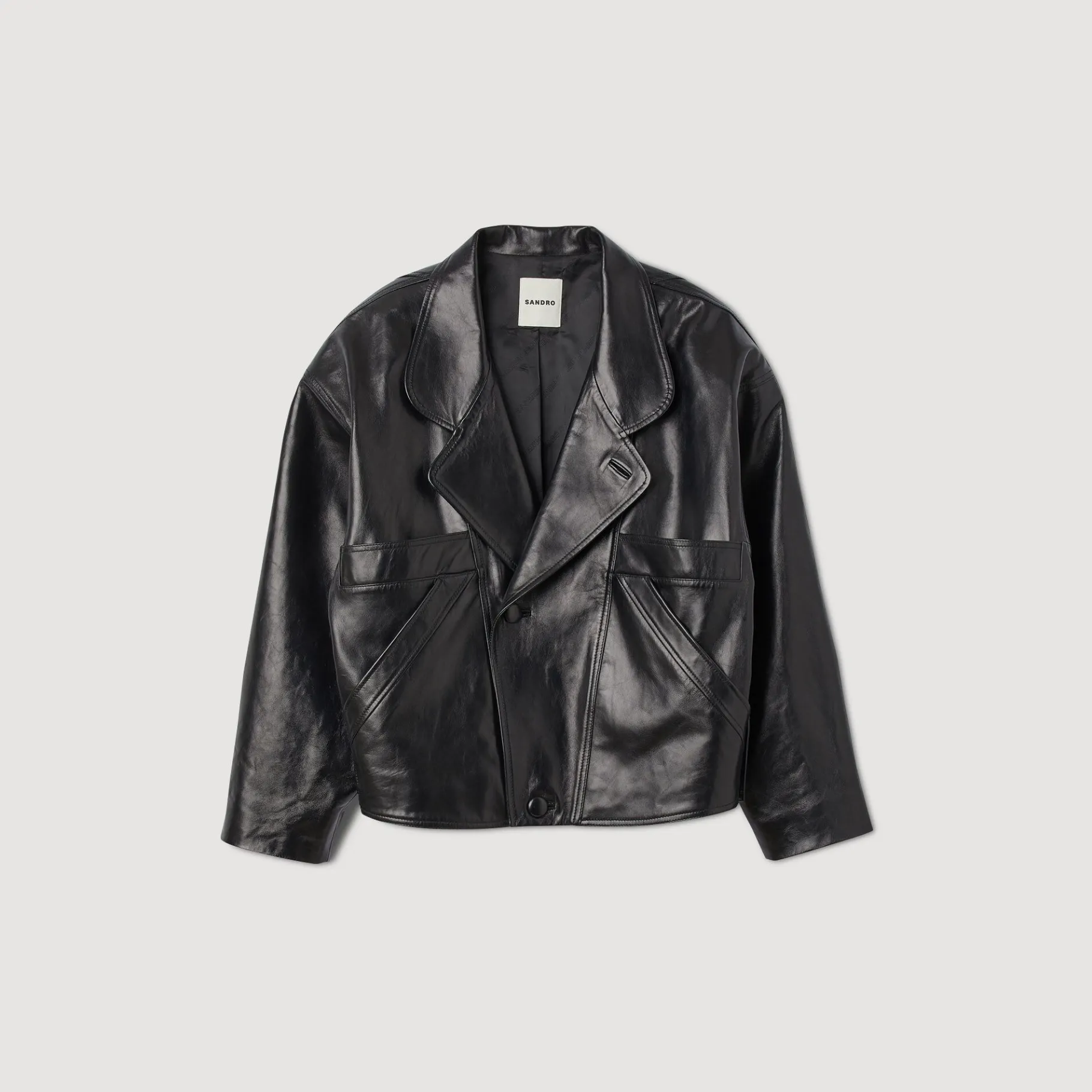 Jaqueta De Couro Oversized Com Gola Sob Medida, Mangas Compridas, Fecho De Botão Trespassado E Conjunto De Recortes Na Frente.