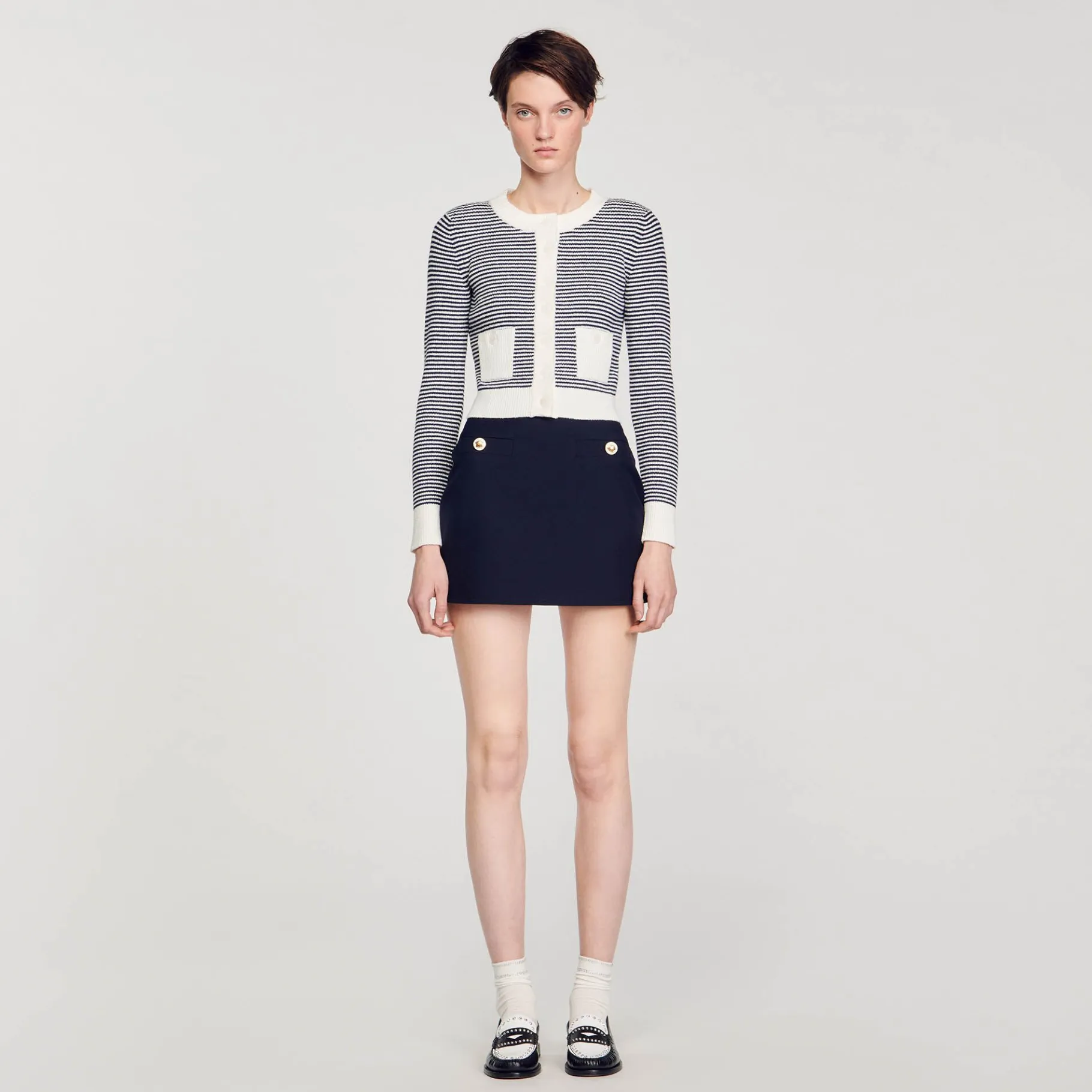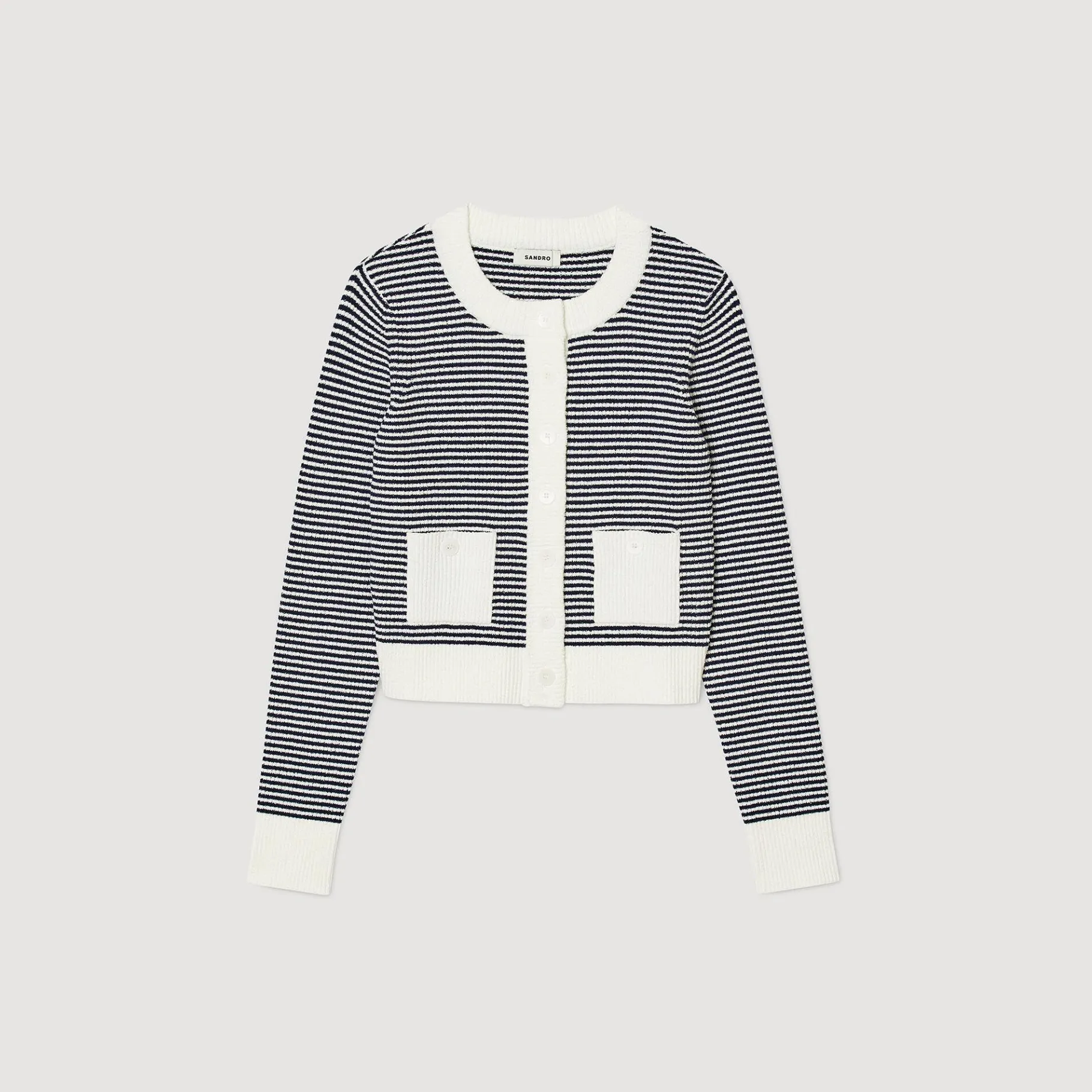 Cardigan Listrado Em Malha Atoalhada, Manga Comprida, Fecho De Botão, Bolsos De Aplicação Na Cintura E Bordas Caneladas Em Contraste.